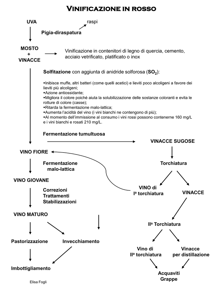 Vinificazione in rosso raspi UVA Pigia-diraspatura MOSTO + VINACCE Vinificazione in contenitori di legno di quercia, cemento, acciaio vetrificato, platificato o inox Solfitazione con aggiunta di anidride solforosa (SO2): Inibisce muffe, altri batteri (come quelli acetici) e lieviti poco alcoligeni a favore dei lieviti più alcoligeni; Azione antiossidante; Migliora il colore poiché aiuta la solubilizzazione delle sostanze coloranti e evita le rotture di colore (casse); Ritarda la fermentazione malo-lattica; Aumenta l’acidità del vino (i vini bianchi ne contengono di più); Al momento dell’immissione al consumo i vini rossi possono contenerne 160 mg/L e i vini bianchi e rosati 210 mg/L. Fermentazione tumultuosa VINACCE SUGOSE VINO FIORE Fermentazione malo-lattica Torchiatura VINO GIOVANE Correzioni Trattamenti Stabilizzazioni VINO di Ia torchiatura VINACCE VINO MATURO IIa Torchiatura Pastorizzazione Invecchiamento IIa Vino di torchiatura Vinacce per distillazione Imbottigliamento Elisa Fogli Acquaviti Grappe Vinificazione in bianco raspi UVA VINACCE SGRONDATE Pigia-diraspatura e sgrondatura MOSTO FIORE Torchiatura leggera Solfitazione Defecazione Correzioni MOSTO DEFECATO MOSTO di torchiatura VINACCE Ia Fermentazione tumultuosa (aggiunta di lieviti selezionati) IIa Torchiatura VINO FIORE Fermentazione lenta VINO GIOVANE Refrigerazione Filtrazione VINO MATURO Pastorizzazione Imbottigliamento Elisa Fogli IIa Vino di torchiatura Vinacce per distillazione Acquaviti Grappe Aceto