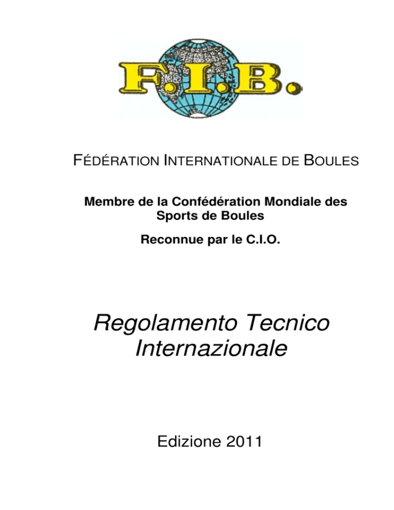FÉDÉRATION INTERNATIONALE DE BOULES Membre de la Confédération Mondiale des Sports de Boules Reconnue par le C.I.O. Regolamento Tecnico Internazionale Edizione 2011 REGOLAMENTO TECNICO INTERNAZIONALE Edizione 2011 Commissione del Regolamento Tecnico Internazionale Testo approvato dal Congresso di Lyon il 18 novembre 1999, dal Congresso di Kranj il 20 settembre 2001, dal Comitato di Direzione (2004 e 2007) e dal Congresso di Feltre il 9 settembre 2011 Questo regolamento è proprietà della F.I.B., ne è vietata la riproduzione sia totale che parziale. PRIMA PARTE NOMENCLATURA Definizione dei termini usati BACCHETTA - Fusto metallico usato per marcare la posizione del pallino e delle bocce e per tracciare le righe di tiro come pure le linee del campo. (vedere art. 3) CAMPO - Terreno sul quale si svolge il gioco (vedere fig.da 2 a 5). BIBERON - Indica l'insieme della boccia e del pallino a contatto. (caso particolare : vedere art. 57) EQUIDISTANZA - Si verifica quando le due bocce più vicine al pallino sono alla stessa distanza dallo stesso e appartengono alle due squadre in campo. BOCCIA - Sfera metallica o sintetica del diametro, della massa e della durezza prescritte dal R.T.I. BOCCIA O PALLINO ANNULLATO - Oggetto che per decisione arbitrale o in applicazione di una norma del R.T.I. non può essere giocato o viene tolto dal gioco per la durata della giocata in corso. BOCCIA O PALLINO SMOSSO (RIMOSSO) O SPOSTATO - Boccia o pallino che non coincide più con le sue marche. COLPO - Termine che indica indifferentemente il punto od il tiro. FERMA - Boccia tirata che dopo aver toccato un oggetto non esce dall’area di gioco. GIOCATA - È un periodo della partita. Ha inizio dal momento in cui il pallino esce per la prima volta dalla mano del giocatore incaricato del lancio. Termina quando il pallino si perde per un colpo regolare o irregolare accettato o quando gli effetti provocati dall’ultima boccia sono terminati (sul campo non vi sono più oggetti in movimento). 3 GIOCARE - Significa indifferentemente puntare o tirare. LINEA - Sono tutti i tratti che delimitano il campo e lo suddividono nelle varie zone. OGGETTO - Termine che designa indifferentemente il pallino o una boccia. PUNTARE (OD ACCOSTARE) Cercare di giocare una boccia e di metterla nel campo, in un luogo desiderato, generalmente il più possibile vicino al pallino. PUNTO DI CADUTA - La boccia puntata o tirata, prendendo contatto con il terreno, vi lascia un segno od un’impronta, che si chiama “punto di caduta” o “punto di choc" o “punto d'urto". PALLINO - Sfera di legno le cui caratteristiche sono fissate dal R.T.I. (v. art. 2). PORTA-BOCCE – Sostegno che può ricevere una o più bocce. POULE - Formula di competizione in cui sono radunate 3, 4 o 5 squadre delle quali soltanto 2 o 3 saranno qualificate per il turno successivo. REGOLAMENTI IN VIGORE - In una competizione sono in vigore più regolamenti. Oltre al R.T.I , possono essere : 4 1. I regolamenti ufficiali dei campionati, tornei ed altri incontri, organizzati dalla F.I.B.; 2. I regolamenti ufficiali dei campionati e di tutte le altre competizioni, organizzate dalle Federazioni Nazionali. RIGA DI TIRO - Riga ad arco di cerchio, che si traccia con la bacchetta davanti all'oggetto annunciato e davanti a quelli suscettibili d'essere colpiti regolarmente dalla boccia tirata (vedere fig. da 9 a 18). TAPPETO - Materiale utilizzato per le prove di tiro. TENERE IL PUNTO - Significa avere una delle proprie bocce situata più vicino al pallino della migliore dell’avversario. TENUTA SPORTIVA DELLE SQUADRE - E' stabilita dalla F.I.B. per le competizioni internazionali e da ciascuna Federazione affiliata per le sue competizioni. L'Arbitro ed il pubblico devono sempre riconoscere i giocatori appartenenti alle rispettive squadre. TIRARE - Significa tentare di smuovere uno o più oggetti, lanciando una boccia con traettoria parabolica. PARTE 2 CAPITOLO I MATERIALI AREA DI GIOCO Art. 1 - Le bocce A - Caratteristiche delle bocce Le bocce utilizzate devono essere rigorosamente conformi al protocollo della F.I.B. incluso nel Regolamento relativo all’omologazione ed al controllo di conformità delle bocce. Esse devono essere esclusivamente in metallo o lega metallica, ma la cui composizione chimica sia omogenea (é tollerata una leggera variazione per il tappo). Esse possono essere completamente vuote o riempite. In questo caso il riempimento deve essere fatto con un materiale o con una miscela omogenea di più materiali inerti. Non deve contenere liquidi, né composti che possono diventare instabili (gas) o presentare un pericolo. L’eventuale riempimento deve essere staticamente equilibrato e conservare detta equilibratura dopo l’utilizzazione. Esse devono: • essere sferiche, con una tolleranza di 2/10 di mm • essere equilibrate, con una tolleranza non superiore all’1,1 della massa della boccia • avere durezza compresa fra 20 e 30 Rockwell sotto carico di 150 kg, con una tolleranza inferiore per i tappi (minimo 17 Rockwell) • avere un diametro compreso tra mm 90 e mm 110 • avere una massa compresa fra 900 e 1200 gr. 5 CAPITOLO I Sono escluse dagli obblighi di durezza di cui sopra le bocce bersaglio ed ostacolo utilizzate nelle prove di tiro e le bocce d’iniziazione. I ragazzi (under 14) e le donne potranno utilizzare bocce più piccole e più leggere. Ogni Federazione Nazionale fisserà, per il suo territorio, le caratteristiche che giudicherà migliori. Per le competizioni internazionali di queste categorie: • Diametro minimo : 88 mm • Massa minima : 800 g. B - Controllo delle bocce L’omologazione da parte della F.I.B. delle bocce utlizzate nelle competizioni è obbligatoria secondo il protocollo inserito nel regolamento F.I.B. relativo all’omologazione ed al controllo di conformità delle bocce. Dei controlli saranno allora eseguiti nelle Competizioni Internazionali tramite un apparecchio di controllo approvato dal Laboratoire National d’Essa