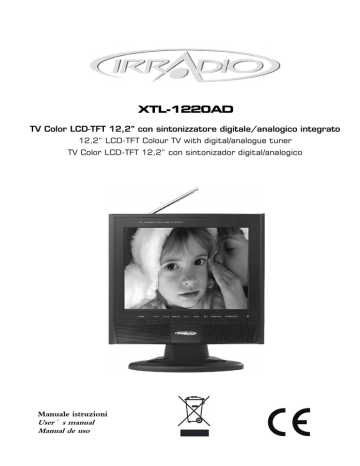 XTL-1220AD TV Color LCD-TFT 12,2” con sintonizzatore digitale/analogico integrato 12,2” LCD-TFT Colour TV with digital/analogue tuner TV Color LCD-TFT 12,2” con sintonizador digital/analogico Manuale istruzioni User’s manual Manual de uso Indice I Precauzioni................................................................................................3 II Elenco degli accessori............................................................................4 III Uso del telecomando e funzioni della parti principali.........................5 IV Aspetto e descrizione delle funzioni....................................................6 V I tasti del telecomando............................................................................8 VI Collegamento con dispositivi esterni.................................................10 VII Istruzioni d’uso per le funzioni di base.............................................13 VIII Funzionamento di base......................................................................20 IX Risoluzione dei problemi.....................................................................27 X Dati tecnici.............................................................................................28 INFORMAZIONI IMPORTANTI PER L'UTENTE AI SENSI DELLA DIRETTIVA "RAEE" 2002/96/CE E SUCCESSIVA MODIFICA 2003/108/CE SUI RIFIUTI DI APPARECCHIATURE ELETTRICHE ED ELETTRONICHE Ai sensi della Direttiva "RAEE" 2002/96/CE e successiva modifica 2003/108/CE questa apparecchiatura viene contrassegnata con il seguente simbolo del contenitore di spazzatura su ruote barrato. Per un futuro smaltimento di questo prodotto, informiamo il nostro spettabile utente di ciò che segue. • E' vietato smaltire questa apparecchiatura come un comune rifiuto urbano: è necessario rivolgersi ad uno dei Centri di Raccolta RAEE (Rifiuti di Apparecchiature Elettriche ed Elettroniche) Autorizzato e predisposto dalla Pubblica Amministrazione. E' possibile consegnare ad un negoziante questa apparecchiatura per il suo smaltimento all'atto dell'acquisto di una nuova apparecchiatura dello stesso tipo. • La normativa sopra citata, alla quale rimandiamo per ulteriori dettagli o approfondimenti, prevede sanzioni in caso di smaltimento abusivo dei RAEE (Rifiuti di Apparecchiature Elettriche ed Elettroniche) I Precauzioni 1. 2. 3. 4. 5. 6. 7. 8. 9. 10. 11. 12. 13. 14. 15. 16. Leggere attentamente questo manuale d’uso. Conservare con cura questo manuale per riferimento futuro. Staccare l’alimentazione dal televisore prima di pulirlo. Non utilizzare detergenti liquidi o spray. Pulire delicatamente il televisore con panno morbido inumidito. Se lo sporco permane, usare un detergente per schermi. Per evitare danni, non utilizzare componenti non indicati dal costruttore. Non tirare il cavo per staccare l’adattatore. Non appoggiare oggetti e non camminare sul cavo di alimentazione. Non disporre il televisore vicino all’acqua, come vasche da bagno, bacinelle o lavatrici. Non appoggiare il televisore sul pavimento bagnato o vicino a una piscina. Non premere sulla superficie dello schermo con le dita o con oggetti duri. Le fessure e i fori sul retro del televisore servono per la ventilazione e l’eliminazione del calore generato dai componenti. Per impedire che i fori per l’eliminazione del calore si ostruiscano, non appoggiare il televisore e l’adattatore su letti, divani, tappeti o simili superfici. In assenza di un dispositivo di ventilazione affidabile, non montare il televisore e l’adattatore in dispositivi a incasso. Garantire una distanza minima di 76 mm fra il televisore e il muro o altri oggetti. Usare esclusivamente una fonte di energia elettrica conforme a quanto indicato sulla targhetta posta sul televisore. In caso di dubbi sul tipo di alimentazione elettrica disponibile, consultare il distributore del televisore o la società elettrica locale. Assicurarsi che la presa elettrica e il cavo di alimentazione possano sopportare la potenza totale necessaria. Non disporre il televisore in luoghi in cui possa essere spostato accidentalmente con facilità. Seguire tutte le precauzioni e le istruzioni riportate nel manuale d’uso. Per evitare rischi di incendio o di scossa elettrica, non sovraccaricare la presa elettrica e non prolungare il cavo di alimentazione. All’interno del televisore sono presenti alta tensione e altri pericoli: non aprire l’apparecchio per ripararlo da soli. Si raccomanda di fare eseguire le riparazioni da parte di personale qualificato. Nel caso si verifichi una delle seguenti circostanze, staccare l’adattatore dalla presa elettrica e richiedere l’intervento di personale qualificato: a. danni o usura del cavo di alimentazione o della spina; b. caduta o danneggiamento del televisore; c. evidenti anomalie del televisore. 17. L’alimentazione viene staccata mediante il cavo di alimentazione. Scollegare l’adattatore se il televisore è in standby. 18. Disporre il televisore in un ambiente dotato di una buona ventilazione, senza luci forti, alta temperatura o umidità. 19. Disporre il televisore in un ambiente in cui la temperatura sia compresa fra i -20 -60 gradi. Se la temperatura è superiore o inferiore ai valori sopra indicati, si possono determinare danni permanenti. II Elenco degli accessori Aprire la confezione e assicurarsi che siano presenti tutti gli elementi. 1. Alimentatore CA-CC 2. Cavo di alimentazione CA 3. Telecomando 4. Batterie 5. Antenna telescopica 6. Manuale d’uso III Uso del telecomando e precauzioni per l’uso Precauzioni * Per evitare danni non lanciare, calpestare o urtare il telecomando. * Il funzionamento del telecomando potrebbe essere ridotto nel caso in cui siano presenti ostacoli fra il telecomando e il televisore. * Le fonti di luce intensa possono interferire con il funzionamento del telecomando. * Non premere ripetutamente i tasti del telecomando a meno di 2 secondi l’uno dall’altro. Distanza efficace per l'utilizzo del telecom