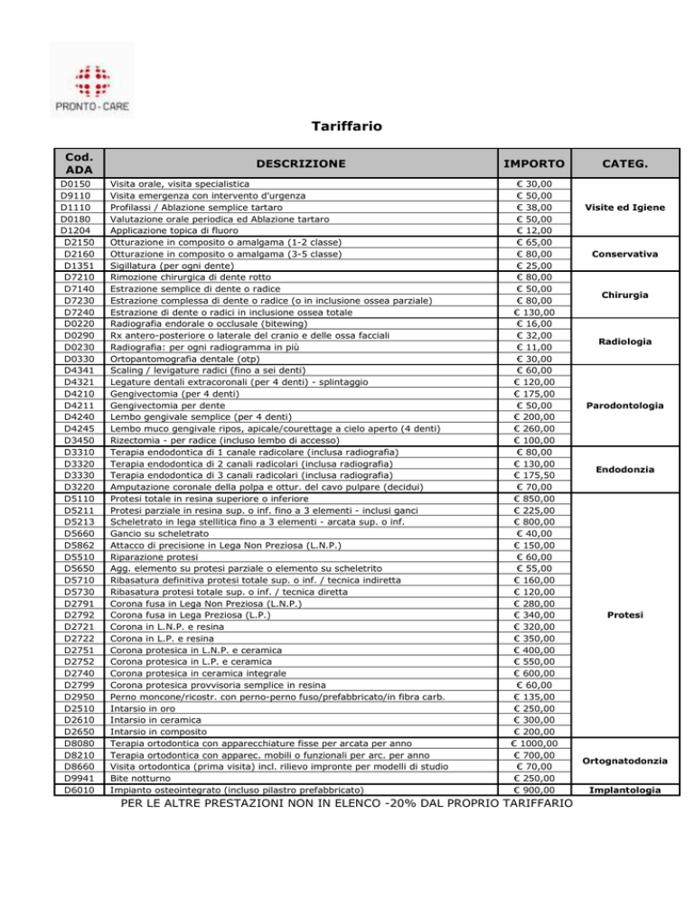 Tariffario Cod. ADA D0150 D9110 D1110 D0180 D1204 D2150 D2160 D1351 D7210 D7140 D7230 D7240 D0220 D0290 D0230 D0330 D4341 D4321 D4210 D4211 D4240 D4245 D3450 D3310 D3320 D3330 D3220 D5110 D5211 D5213 D5660 D5862 D5510 D5650 D5710 D5730 D2791 D2792 D2721 D2722 D2751 D2752 D2740 D2799 D2950 D2510 D2610 D2650 D8080 D8210 D8660 D9941 D6010 DESCRIZIONE Visita orale, visita specialistica Visita emergenza con intervento d'urgenza Profilassi / Ablazione semplice tartaro Valutazione orale periodica ed Ablazione tartaro Applicazione topica di fluoro Otturazione in composito o amalgama (1-2 classe) Otturazione in composito o amalgama (3-5 classe) Sigillatura (per ogni dente) Rimozione chirurgica di dente rotto Estrazione semplice di dente o radice Estrazione complessa di dente o radice (o in inclusione ossea parziale) Estrazione di dente o radici in inclusione ossea totale Radiografia endorale o occlusale (bitewing) Rx antero-posteriore o laterale del cranio e delle ossa facciali Radiografia: per ogni radiogramma in più Ortopantomografia dentale (otp) Scaling / levigature radici (fino a sei denti) Legature dentali extracoronali (per 4 denti) - splintaggio Gengivectomia (per 4 denti) Gengivectomia per dente Lembo gengivale semplice (per 4 denti) Lembo muco gengivale ripos, apicale/courettage a cielo aperto (4 denti) Rizectomia - per radice (incluso lembo di accesso) Terapia endodontica di 1 canale radicolare (inclusa radiografia) Terapia endodontica di 2 canali radicolari (inclusa radiografia) Terapia endodontica di 3 canali radicolari (inclusa radiografia) Amputazione coronale della polpa e ottur. del cavo pulpare (decidui) Protesi totale in resina superiore o inferiore Protesi parziale in resina sup. o inf. fino a 3 elementi - inclusi ganci Scheletrato in lega stellitica fino a 3 elementi - arcata sup. o inf. Gancio su scheletrato Attacco di precisione in Lega Non Preziosa (L.N.P.) Riparazione protesi Agg. elemento su protesi parziale o elemento su scheletrito Ribasatura definitiva protesi totale sup. o inf. / tecnica indiretta Ribasatura protesi totale sup. o inf. / tecnica diretta Corona fusa in Lega Non Preziosa (L.N.P.) Corona fusa in Lega Preziosa (L.P.) Corona in L.N.P. e resina Corona in L.P. e resina Corona protesica in L.N.P. e ceramica Corona protesica in L.P. e ceramica Corona protesica in ceramica integrale Corona protesica provvisoria semplice in resina Perno moncone/ricostr. con perno-perno fuso/prefabbricato/in fibra carb. Intarsio in oro Intarsio in ceramica Intarsio in composito Terapia ortodontica con apparecchiature fisse per arcata per anno Terapia ortodontica con apparec. mobili o funzionali per arc. per anno Visita ortodontica (prima visita) incl. rilievo impronte per modelli di studio Bite notturno Impianto osteointegrato (incluso pilastro prefabbricato) IMPORTO € 30,00 € 50,00 € 38,00 € 50,00 € 12,00 € 65,00 € 80,00 € 25,00 € 80,00 € 50,00 € 80,00 € 130,00 € 16,00 € 32,00 € 11,00 € 30,00 € 60,00 € 120,00 € 175,00 € 50,00 € 200,00 € 260,00 € 100,00 € 80,00 € 130,00 € 175,50 € 70,00 € 850,00 € 225,00 € 800,00 € 40,00 € 150,00 € 60,00 € 55,00 € 160,00 € 120,00 € 280,00 € 340,00 € 320,00 € 350,00 € 400,00 € 550,00 € 600,00 € 60,00 € 135,00 € 250,00 € 300,00 € 200,00 € 1000,00 € 700,00 € 70,00 € 250,00 € 900,00 PER LE ALTRE PRESTAZIONI NON IN ELENCO -20% DAL PROPRIO TARIFFARIO CATEG. Visite ed Igiene Conservativa Chirurgia Radiologia Parodontologia Endodonzia Protesi Ortognatodonzia Implantologia