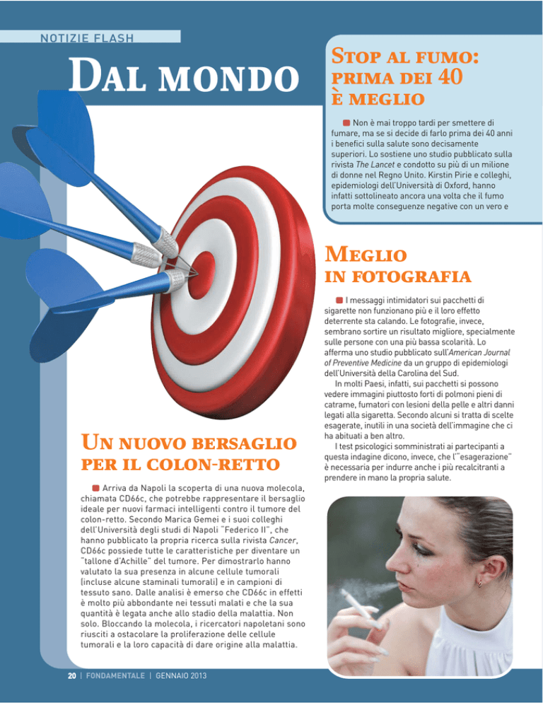 NOTIZIE FLASH Dal mondo Stop al fumo: prima dei 40 è meglio Non è mai troppo tardi per smettere di fumare, ma se si decide di farlo prima dei 40 anni i benefici sulla salute sono decisamente superiori. Lo sostiene uno studio pubblicato sulla rivista The Lancet e condotto su più di un milione di donne nel Regno Unito. Kirstin Pirie e colleghi, epidemiologi dell’Università di Oxford, hanno infatti sottolineato ancora una volta che il fumo porta molte conseguenze negative con un vero e Meglio in fotografia Un nuovo bersaglio per il colon-retto Arriva da Napoli la scoperta di una nuova molecola, chiamata CD66c, che potrebbe rappresentare il bersaglio ideale per nuovi farmaci intelligenti contro il tumore del colon-retto. Secondo Marica Gemei e i suoi colleghi dell’Università degli studi di Napoli “Federico II”, che hanno pubblicato la propria ricerca sulla rivista Cancer, CD66c possiede tutte le caratteristiche per diventare un “tallone d’Achille” del tumore. Per dimostrarlo hanno valutato la sua presenza in alcune cellule tumorali (incluse alcune staminali tumorali) e in campioni di tessuto sano. Dalle analisi è emerso che CD66c in effetti è molto più abbondante nei tessuti malati e che la sua quantità è legata anche allo stadio della malattia. Non solo. Bloccando la molecola, i ricercatori napoletani sono riusciti a ostacolare la proliferazione delle cellule tumorali e la loro capacità di dare origine alla malattia. 20 | FONDAMENTALE | GENNAIO 2013 I messaggi intimidatori sui pacchetti di sigarette non funzionano più e il loro effetto deterrente sta calando. Le fotografie, invece, sembrano sortire un risultato migliore, specialmente sulle persone con una più bassa scolarità. Lo afferma uno studio pubblicato sull’American Journal of Preventive Medicine da un gruppo di epidemiologi dell’Università della Carolina del Sud. In molti Paesi, infatti, sui pacchetti si possono vedere immagini piuttosto forti di polmoni pieni di catrame, fumatori con lesioni della pelle e altri danni legati alla sigaretta. Secondo alcuni si tratta di scelte esagerate, inutili in una società dell’immagine che ci ha abituati a ben altro. I test psicologici somministrati ai partecipanti a questa indagine dicono, invece, che l’“esagerazione” è necessaria per indurre anche i più recalcitranti a prendere in mano la propria salute. proprio “eccesso di mortalità” (in pratica un numero superiore di decessi nei fumatori rispetto ai non fumatori) e toglie più di 10 anni di vita. I ricercatori hanno anche stabilito che il rischio di morire per malattie legate al fumo, come per esempio il tumore del polmone, si moltiplica con l’aumento degli anni dedicati alla sigaretta. I numeri non lasciano spazio a dubbi: chi dice addio al fumo prima dei 40 anni elimina il 90 per cento del temuto aumento di rischio e chi smette prima dei 30 ne toglie addirittura il 97 per cento. “Fumare fino ai 40 anni e poi smettere comporta comunque dei rischi per la salute” spiega l’autrice. “Ma per chi persevera con la cattiva abitudine, i rischi sono 10 volte superiori”. Una chemio intensa nel sarcoma di Ewing Il lettino solare non ama la pelle Ancora uno studio che conferma la pericolosità dei lettini solari: la ricerca, pubblicata sul British Medical Journal, dimostra l’aumento del rischio non solo di melanoma ma anche di altri tumori della pelle, soprattutto se le sedute abbronzanti cominciano prima dei 25 anni. Lo studio è stato condotto da Mackenzie R. Wehner della Stanford University School of Medicine in California. I ricercatori hanno valutato 12 lavori che hanno coinvolto poco più di 9.300 pazienti con tumori della pelle diversi da melanoma (carcinoma a cellule basali e a cellule squamose) e sono giunti alla conclusione che per chi ha ceduto alla tentazione di questa abbronzatura artificiale il rischio di carcinoma a cellule squamose aumenta del 67 per cento e quello di carcinoma a cellule basali del 29 per cento. E il rischio è ancora più alto se chi usa il lettino ha meno di 25 anni: raddoppia per il carcinoma a cellule squamose e aumenta del 40 per cento per quello a cellule basali. Secondo uno studio recentemente pubblicato sulla rivista Journal of Clinical Oncology, nelle persone con sarcoma di Ewing ridurre l’intervallo tra due sedute di chemio (ogni due settimane invece che ogni tre) potrebbe permettere di tenere lontana più a lungo la malattia. Richard B. Womer e i suoi colleghi del Children’s Hospital di Philadelphia hanno coinvolto nel loro studio 568 pazienti con meno di 50 anni affetti da sarcoma di Ewing, li hanno divisi in due gruppi e li hanno poi sottoposti a 14 cicli di chemioterapia con gli stessi farmaci, ma con frequenza diversa: un gruppo affrontava la chemio ogni 14 giorni, l’altro ogni 21. Dopo un periodo di circa cinque anni, il 65 per cento dei pazienti trattati ogni tre settimane era ancora libero dalla malattia, mentre in quelli sottoposti a trattamento intensivo (ogni due settimane) la percentuale ha raggiunto il 73 per cento, senza differenze negli effetti collaterali. GENNAIO 2013 | FONDAMENTALE | 21
