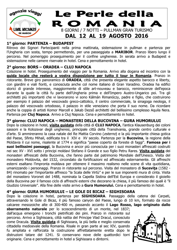 8 GIORNI / 7 NOTTI – PULLMAN GRAN TURISMO DAL 12 AL 19 AGOSTO 2016 1° giorno: PARTENZA – BUDAPEST Ritrovo dei Signori Partecipanti nella prima mattinata, sistemazione in pullman e partenza per l’Ungheria con sosta, tempo permettendo, per una passeggiata a MARIBOR. Pranzo libero lungo il percorso. Nel pomeriggio proseguimento per il confine ungherese. In serata arrivo a Budapest e sistemazione nelle camere riservate in hotel. Cena e pernottamento in hotel. 2° giorno: BORS – ORADEA – CLUJ NAPOCA Colazione in hotel. Proseguimento del viaggio per la Romania. Arrivo alla dogana ed incontro con la guida locale che resterà a vostra disposizione per tutto il tour in Romania. Pranzo in ristorante. Breve giro panoramico di ORADEA, città che presenta elegante aspetto barocco e liberty, con giardini e viali fioriti, e conosciuta anche col nome italiano di Gran Varadino. Oradea ha edifici storici di grande interesse, maggiormente di stile art-nouveau e barocco, reminiscenze dell'epoca durante la quale la città fu parte dell'Ungheria prima e dell'Impero Austro-Ungarico poi. Tra gli architetti più importanti che vi lavorarono vi sono Kálmán Rimanóczy, padre e figlio, che costruirono per esempio il palazzo del vescovado greco-cattolico, il centro commerciale, la sinagoga neologa, il palazzo del vescovado ortodosso, il palazzo in stile veneziano che porta il suo nome. Da ricordare anche la coppia di artisti Komor Marcell e Jakab Dezső architetti del bellissimo complesso Aquila Nera. Partenza per Cluj Napoca. Arrivo a Cluj Napoca. Cena e pernottamento in hotel. 3° giorno: CLUJ NAPOCA – MONASTERI DELLA BUCOVINA – GURA HUMORULUI Dopo la colazione in hotel, visita guidata della città di CLUJ NAPOCA, l’antica Klausenburg dei coloni sassoni e la Kolozsvar degli ungheresi, principale città della Transilvania, grande centro culturale e d’arte. Si ammireranno la casa natale del Re Mattia Corvino (esterno) e la più importante chiesa gotica del Paese, Sfintu Mihail, edificata tra il XIV e XV secolo. Partenza per la Bucovina, la regione della Moldavia il cui nome, risalente al 1774 e significa "paese coperto da foreste di faggi". Famosa per i suoi bellissimi paesaggi, la Bucovina e ancor più conosciuta per i suoi monasteri affrescati costruiti nei sec XV - XVI sotto i principi moldavi Stefano il Grande e suo figlio Petru Rares. Visita guidata dei monasteri affrescati della Bucovina, che fanno parte dal patrimonio Mondiale dell’Unesco. Visita del monastero Moldovita, del 1532, circondato da fortificazioni ed affrescato esternamente. Gli affreschi esterni esaltano l’impronta moldava per ottenere il massimo realismo nelle scene di vita quotidiana, umanizzando i personaggi. Pranzo in ristorante sul percorso. Visita del monastero di Suceviţa (1582 84) rinomato per l’importante affresco “la Scala delle Virtù” e per le sue imponenti mura di cinta. Visita del monastero Voronet del 1488, nominata la Capella Sistina dell’Est Europa e considerato il gioiello della Bucovina per il famoso ciclo di affreschi esterni che decorano la chiesa, il più famoso dei quali è ”il Giudizio Universale”. Alla fine delle visite arrivo a Gura Humorului. Cena e pernottamento in hotel. 4° giorno: GURA HUMORULUI – LE GOLE DI BICAZ – SIGHISOARA Dopo la colazione in hotel, partenza per SIGHISOARA. Passaggio della catena dei Carpati, attraversando le Gole di Bicaz, il più famoso canyon del Paese, lungo di 10 km, formato da rocce calcaree mesozoiche alte di 300-400 m, passando accanto il Lago Rosso, lago originato dallo sbarramento naturale per lo scoscendimento di un monte, nel 1837; dall’acqua emergono i tronchi pietrificati dei pini. Pranzo in ristorante sul percorso. Arrivo a Sighisoara, città nattia del Principe Vlad Dracul, conosciuto come Dracula. Visita guidata di Sighisoara, la più bella e meglio conservata cittadella medioevale della Romania. Risale in gran parte al sec XIV, quando fu ampliata e rafforzata la costruzione affrettatamente eretta dopo le distruzioni tatare del 1241. Si conservano nove delle quattordici torri originarie. Cena e pernottamento in hotel a Sighisoara o dintorni. 5° giorno: SIGHISOARA – BRAN – BRASOV Dopo la colazione in hotel, partenza per BRAN. Visita del Castello Bran, conosciuto con il nome di Castello di Dracula, uno dei più pittoreschi della Romania, edificato nel XIII secolo dal cavaliere teutonico Dietrich e restaurato in epoche successive. Vi soggiornarono a lungo la regina Maria di Sassonia-Coburgo-Gotha, che ristrutturò massicciamente gli interni secondo l'allora gusto art and craft rumeno, e sua figlia, la principessa Ileana di Romania. Pranzo in ristorante. Arrivo a BRASOV e visita di una delle piu affascinanti località medioevali della Romania, nel corso della quale si potranno ammirare il Quartiere di Schei con la chiesa Sfantul Nicolae e la prima scuola romena. Visita della Biserica Neagrã (Chiesa Nera), la chiesa più grande della Romania in stile gotico e le antiche fortificazioni della città con i bastioni. Cena in ristorante e pernottamento in hotel a Brasov o dintorni. 6° giorno: BRASOV – SINAIA - SIBIU Dopo la colazione in hotel, partenza per SINAIA, denominata la Perla dei Carpati, la più nota località montana della Romania. Visita del Castello Peles, antica residenza reale, costruito alla fine del XIX secolo nello stile neogotico tipico dei castelli bavaresi. L’interno del castello Peles comprende 160 stanze, sistemate ed arredate in tutte le fogge possibili, con netto predominio dell’intaglio in legno. Proseguimento per arrivare a SIBIU, Capitale Europeea della Cultura nel 2007. Pranzo in ristorante. Visita guidata di Sibiu, la capitale europea, nota al epoca per il suo sistema di fortificazione considerato il più grande della Transilvana con oltre 7 km di cinta muraria della quale oggi si conservano importanti vestigi. Cena tipica della reggione, a Sibiel (30 min. distante dal centro citta di Sibiu), dai contad