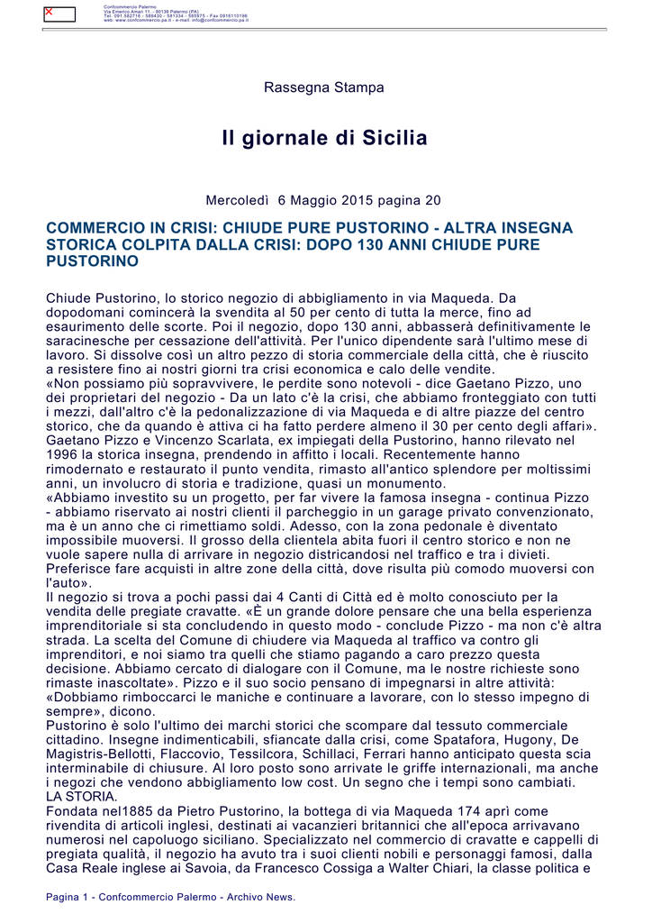 Confcommercio Palermo Via Emerico Amari 11. - 90139 Palermo (PA) Tel. 091.582716 - 589430 - 581334 - 585975 - Fax 0916110196 web: www.confcommercio.pa.it - e-mail: [email protected] Rassegna Stampa Il giornale di Sicilia Mercoledì 6 Maggio 2015 pagina 20 COMMERCIO IN CRISI: CHIUDE PURE PUSTORINO - ALTRA INSEGNA STORICA COLPITA DALLA CRISI: DOPO 130 ANNI CHIUDE PURE PUSTORINO Chiude Pustorino, lo storico negozio di abbigliamento in via Maqueda. Da dopodomani comincerà la svendita al 50 per cento di tutta la merce, fino ad esaurimento delle scorte. Poi il negozio, dopo 130 anni, abbasserà definitivamente le saracinesche per cessazione dell'attività. Per l'unico dipendente sarà l'ultimo mese di lavoro. Si dissolve così un altro pezzo di storia commerciale della città, che è riuscito a resistere fino ai nostri giorni tra crisi economica e calo delle vendite. «Non possiamo più sopravvivere, le perdite sono notevoli - dice Gaetano Pizzo, uno dei proprietari del negozio - Da un lato c'è la crisi, che abbiamo fronteggiato con tutti i mezzi, dall'altro c'è la pedonalizzazione di via Maqueda e di altre piazze del centro storico, che da quando è attiva ci ha fatto perdere almeno il 30 per cento degli affari». Gaetano Pizzo e Vincenzo Scarlata, ex impiegati della Pustorino, hanno rilevato nel 1996 la storica insegna, prendendo in affitto i locali. Recentemente hanno rimodernato e restaurato il punto vendita, rimasto all'antico splendore per moltissimi anni, un involucro di storia e tradizione, quasi un monumento. «Abbiamo investito su un progetto, per far vivere la famosa insegna - continua Pizzo - abbiamo riservato ai nostri clienti il parcheggio in un garage privato convenzionato, ma è un anno che ci rimettiamo soldi. Adesso, con la zona pedonale è diventato impossibile muoversi. Il grosso della clientela abita fuori il centro storico e non ne vuole sapere nulla di arrivare in negozio districandosi nel traffico e tra i divieti. Preferisce fare acquisti in altre zone della città, dove risulta più comodo muoversi con l'auto». Il negozio si trova a pochi passi dai 4 Canti di Città ed è molto conosciuto per la vendita delle pregiate cravatte. «È un grande dolore pensare che una bella esperienza imprenditoriale si sta concludendo in questo modo - conclude Pizzo - ma non c'è altra strada. La scelta del Comune di chiudere via Maqueda al traffico va contro gli imprenditori, e noi siamo tra quelli che stiamo pagando a caro prezzo questa decisione. Abbiamo cercato di dialogare con il Comune, ma le nostre richieste sono rimaste inascoltate». Pizzo e il suo socio pensano di impegnarsi in altre attività: «Dobbiamo rimboccarci le maniche e continuare a lavorare, con lo stesso impegno di sempre», dicono. Pustorino è solo l'ultimo dei marchi storici che scompare dal tessuto commerciale cittadino. Insegne indimenticabili, sfiancate dalla crisi, come Spatafora, Hugony, De Magistris-Bellotti, Flaccovio, Tessilcora, Schillaci, Ferrari hanno anticipato questa scia interminabile di chiusure. Al loro posto sono arrivate le griffe internazionali, ma anche i negozi che vendono abbigliamento low cost. Un segno che i tempi sono cambiati. LA STORIA. Fondata nel1885 da Pietro Pustorino, la bottega di via Maqueda 174 aprì come rivendita di articoli inglesi, destinati ai vacanzieri britannici che all'epoca arrivavano numerosi nel capoluogo siciliano. Specializzato nel commercio di cravatte e cappelli di pregiata qualità, il negozio ha avuto tra i suoi clienti nobili e personaggi famosi, dalla Casa Reale inglese ai Savoia, da Francesco Cossiga a Walter Chiari, la classe politica e Pagina 1 - Confcommercio Palermo - Archivo News. Confcommercio Palermo Via Emerico Amari 11. - 90139 Palermo (PA) Tel. 091.582716 - 589430 - 581334 - 585975 - Fax 0916110196 web: www.confcommercio.pa.it - e-mail: [email protected] la nobiltà. Il negozio è di rara bellezza. L'ambiente, seppur rimodernato e restaurato di recente, racchiude ancora l'atmosfera di un tempo: pareti affrescate da Ernesto Basile nello stesso stile della famosa Villa Igea, legni colorati e specchi in stile liberty. Fino ad oggi ha mantenuto nella vendita dei capi di abbigliamento l'inconfondibile gusto british, fornendo i migliori capi e le case più prestigiose per scarpe, giacche, cappotti, soprabiti, fra tutte Burberry. Anche sartoria con stoffe inglesi, dallo shetland al cashmere, tweed, lane e cotoni. Pustorino è famoso anche per le cravatte Holiday Brown, vera rarità e tessute da artigiani d'oltre Manica. Una vera icona per un target di clienti particolari, che una volta fatta tappa in città dedicano parte del loro tempo a visitare il famoso negozio. Adesso, la chiusura lascerà un grande vuoto, così come è stato quando altre insegne che hanno disegnato la storia commerciale in città hanno deciso di alzare bandiera bianca. Dopodomani comincerà la svendita per cessazione dell'attività. L'ultima occasione per fare affari. Poi, anche in quel pezzo di via Maqueda, nella parte che lambisce i Quattro Canti, un colpo di spugna cancellerà pure quell'insegna, rimasta un punto di riferimento per tanto tempo. Pagina 2 - Confcommercio Palermo - Archivo News.
