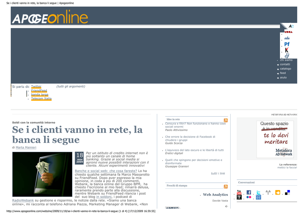 Se i clienti vanno in rete, la banca li segue | Apogeonline Apogeonline ● ● ● ● ● ● ● Twitter SiTecnologia parla di: Ebook ● FriendFeed ● Università ● banda larga ● ● chi siamo ● contatti ● catalogo ● feed ● aiuto (tutti gli argomenti) ● ● Telecom Italia Idee in rete Soldi con la comunità intorno Se i clienti vanno in rete, la banca li segue ● ● di Marta Mainieri 18 nov 2009 Per un istituto di credito internet non è più soltanto un canale di home banking. Grazie ai social media si aprono nuove possibili interazioni con il cliente. Alcuni esperimenti innovativi Banche e social web: che cosa fareste? Lo ha chiesto qualche settimana fa Marco Massarotto su FriendFeed. Dopo aver espresso la mia opinione, in coda a più di 200 commenti, Webank, la banca online del Gruppo BPM, ha chiesto l’iscrizione al mio feed; rimarrà delusa, raramente prendo parte alla discussione, mentre Webank su FriendFeed rilancia i post del suo blog in soldoni, i podcast di RadioWebank su gestione e risparmio, le notizie dalla rete. «Siamo una banca online», mi racconta al telefono Adriana Piazza, Marketing Manager di Webank, «Non http://www.apogeonline.com/webzine/2009/11/18/se-i-clienti-vanno-in-rete-la-banca-li-segue (1 di 4) [17/12/2009 16.59.55] ● ● Censura e filtri? Non funzionano e hanno costi sociali enormi Paolo Attivissimo Che errore la decisione di Facebook di chiudere i gruppi Guido Scorza L'equivoco del lato oscuro e le libertà di tutti Eretici digitali Quelli che spingono per decisioni emotive e disinformate Giuseppe Granieri La referenza: mettici la faccia! tutti i link Conversazioni Freschi di stampa ● Web Analytics Davide Vasta € ● ● ● ● ● ● ● ● ● Se i clienti vanno in rete, la banca li segue | Apogeonline abbiamo alcuna forma di intermediazione con il cliente, e per questo fin dalla loro comparsa siamo stati costretta a esplorare tutti gli strumenti che ci permettevano di entrare in relazione con la nostra clientela». Webank sperimenta i social media dal 2006. Al tempo solo alcuni istituti si lanciavano in territori così insidiosi. Ancora all’inizio di quest’anno i progetti delle banche con i social media erano poco più che sporadici, mentre oggi quasi non si contano, basta dare un occhio all’elenco raccolto su Visible Banking. Nuove strategie Che cosa è successo? Perchè tutto questo improvviso interesse delle banche verso i social media? Innanzitutto perchè internet sta diventando un canale sempre più importante nella strategia di contatto con la clientela. Una clientela che – lentamente in Italia, molto più velocemente in Europa – si sta spostando sempre più in rete, dove opera e soprattutto ricerca informazioni e offerte. La crisi finanziaria e la perdita di credibilità delle istituzioni credizie ha reso necessario, come ha scritto Carlo Murolo, riportare al centro del modello operativo delle banche trasparenza e semplicità. Il social lending e il personal finance, poi, lungi dal costituire una reale minaccia per gli istituti bancari, dimostrano però la consapevolezza raggiunta dai consumatori e il loro desiderio di chiarezza e collaborazione. Le banche, dunque, si trovano a dover sperimentare canali di contatto con la clientela più diretti e strategie capaci di coinvolgerla per ristabilire un rapporto basato su credibilità e fiducia. Si trovano, così, istituti di credito su Twitter, Friendfeed, Facebook, YouTube. Ma le iniziative sono le più svariate. Alcune riguardano solo ambiti sepcifici: MPS per esempio per lanciare il suo ultimo spot ha realizzato Una storia italiana (per cui ha ricevuto anche un premio all’Interactive Media Key), iniziativa accompagnata da un blog e da una presenza sui più noti social network; Sella per misurare la customer satisfacion ha inaugurato una banca delle idee; Banco Popular di Spagna per proporre servizi a target specifici ha creato una community per gli anziani; e lo stesso strumento utilizza Liberty Mutual negli Stati Uniti per riflettere sul significato di responsabilità sociale. Iniziative diverse, che però rischiano di non riuscire a riconquistare il cliente se rimangono fine a se stesse, se cioè, nel tempo, non vengono accompagnate da un nuovo modo di pensare e rappresentare il prodotto. Un percorso che naturalmente non può passare solo per il web e che, anche qui, non può essere intrapreso solo attraverso i social media. Vediamo per esempio cosa stanno facendo BBVA con Tù cuentas e PNC con Virtual Wallet. Tù cuentas «L’obiettivo di innovazione del Gruppo è generare prodotti e servizi che siano utili alle persone». Così Manuel Castro, responsabile della innovazione e sviluppo del Banco di Bilbao, scrive sul blog di Tù cuentas, un servizio di personal finance dedicato ai clienti BBVA (e a breve anche ai potenziali clienti). Il servizio si presenta attraverso poche e semplici schermate esemplificative, un blog e alcuni video dimostrativi caricati su YouTube. Una volta entrato il visitatore può personalizzare la propria home page attraverso un sistema di widget, e: ● ● ● ● aggregare tutte le voci di spesa: informazioni finanziarie proveniente dal conto di BBVA, ma anche di altri conti (per esempio, ING), il consumo di luce, la bolletta del telefono, i punti fedeltà; categorizzare le informazioni secondo una serie di voci personalizzabili; analizzare l’andamento delle spese visualizzandolo attraverso grafici e tabelle personalizzabili; comparare la propria situazione, in maniera anonima, con quella di altre persone che hanno un sistema di spesa simile al suo. La banca, dal canto suo, raccoglie i dati del cliente in una piattaforma di customer relationship management, fornendo in questo modo informazioni e suggerimenti personalizzati nonchè nuovi prodotti e offerte e su misura. Virtual Wallet Virtual Wallet, invece, è un conto corrente online, abbinato a un conto di riserva e a un conto di deposito, pensato in modo specifico per i 