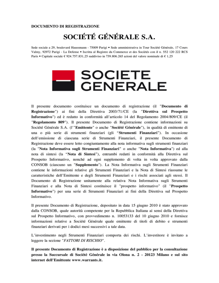 Société Générale S.A. (l'"Emittente" o anche "Société Générale"), in qualità di emittente di