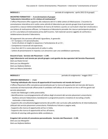 Fixo azione 8 – Centro Orientamento / Placement – intervento “orientamento al lavoro” MODULO 1 periodo di svolgimento: aprile 2012 (5‐6 gruppi) INCONTRO FORMATIVO – 3 ore formazione di gruppo “Laboratorio interattivo su CV e lettera di motivazione” L’Ufficio Placement offre supporto alla redazione del CV e della Lettera di Motivazione. L’incontro ha connotazione interattiva ed è svolto come attività di laboratorio per piccolo gruppi (max 6 persone) per consentire a ciascun dottorando/dottore di ricerca di mettere a punto un curriculum vitae ben strutturato e una lettera di motivazione efficace. La frequenza al laboratorio prevede che ciascun partecipante produca un CV e una lettera di motivazione prima dell’incontro. Tali materiali saranno oggetto di confronto e rielaborazione durante il laboratorio. Gli argomenti che verranno affrontati riguardano, in generale: - CV Europass o CV personalizzato; - Come sfruttare al meglio la sequenza e l’articolazione di un CV ; - Competenze trasversali ed esperienze; - Cosa fare del CV e come plasmarlo di volta in volta; - Lettera di presentazione in risposta a un annuncio o per una candidatura spontanea. Docenti d’aula: Servizio Job Placement – C.OR. (ogni laboratorio sarà tenuto per piccoli gruppi e sarà gestito da due operatori del Servizio Placement) Dott.ssa Paola Ferrari Dott.ssa Lisa Mangolini Dott.ssa Stefania Mellera Dott.ssa Maura Settembre MODULO 2 periodo di svolgimento: maggio 2012 SERVIZIO INDIVIDUALE – 3 ore “Tutoring individuale alla ricerca di opportunità di inserimento nel mondo del lavoro” L’Ufficio Placement offre consulenza personalizzata per la ricerca di opportunità nel mercato del lavoro nazionale ed internazionale affiancando il candidato nell’utilizzo di strumenti on‐line e off‐line gestiti dal servizio placement. ‐ Analisi dei fabbisogni e delle potenzialità; ‐ Identificazione e accompagnamento all’utilizzo degli strumenti del servizio placement universitario: bacheca annunci Italia/estero; bandi/premi e programmi;eventi e iniziative di recruiting a livello nazionale e internazionale; ‐ Supporto alla consultazione/aggiornamento dei profili e dei curricula sulle piattaforme di intermediazione utilizzati dal servizio placement universitario: Piattaforma Vulcano e pagine web; ‐ Supporto alla ricerca di opportunità ad hoc in Italia; ‐ Supporto alla ricerca di opportunità ad hoc all’estero; ‐ Attività di tutoring nella gestione delle candidature. Erogatori del servizio di consulenza personalizzata: Servizio Job Placement – C.OR. Dott.ssa Lisa Mangolini Dott.ssa Stefania Mellera MODULO 3 periodo di svolgimento: maggio/giugno 2012 A cura di esperti selezionatori Agenzie per il Lavoro SERVIZIO INDIVIDUALE – 1 ora “Simulazione di un colloquio di lavoro” Ciascun dottorando/dottore di ricerca potrà mettersi alla prova in una intervista simulata attraverso un’interazione one‐to‐one con esperti selezionatori. Vivere l’esperienza di un colloquio in una situazione di prova può essere un’opportunità per affrontare in modo più consapevole un colloquio di lavoro. MODULO 4 data di svolgimento: 6 giugno 2012 A cura di Ufficio Placement Università di Milano INCONTRO FORMATIVO – 3 ore in sessione plenaria “Il processo di recruiting in azienda: le fasi e le tipologie di colloqui” ‐ Primo contatto/colloquio telefonico: errori da evitare; ‐ Questionari e test: quando vengono usati e cosa valutano; ‐ Assesment Centre: cos’è e un quali contesti viene utilizzato; ‐ Interviste: strutturate semi strutturate non strutturate ‐ I colloqui di selezione: cosa aspettarsi e come affrontarli. MODULO 5 data di svolgimento: 12 giugno 2012 Docenti: docenti di diritto del lavoro del Dipartimento di Giurisprudenza ‐ Università degli Studi di Pavia INCONTRO FORMATIVO ‐ 6 ore in sessione plenaria “I contratti di lavoro: tra formazione e lavoro, contratti di “ingresso” e contratti a tempo indeterminato” a cura del Dipartimento di Giurisprudenza dell’Università di Pavia ‐ Tra formazione e lavoro: gli stage, il contratto di inserimento, il contratto di apprendistato ; ‐ I contratti di normale "ingresso" nel mercato del lavoro: a termine, a progetto, di somministrazione; ‐ Il contratto di lavoro a tempo pieno ed indeterminato .
