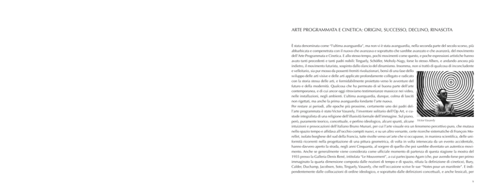 ARTE PROGRAMMATA E CINETICA: ORIGINI, SUCCESSO, DECLINO, RINASCITA È stata denominata come “l’ultima avanguardia”, ma non vi è stata avanguardia, nella seconda parte del secolo scorso, più abbarbicata e compenetrata con il nuovo che avanzava e soprattutto che sarebbe avanzato e che avanzerà, del movimento dell’Arte Programmata e Cinetica. E allo stesso tempo, pochi movimenti come questo, e poche espressioni artistiche hanno avuto tanti precedenti e tanti padri nobili: Tinguely, Schöffer, Moholy-Nagy, forse lo stesso Albers, e andando ancora più indietro, il movimento futurista, sospinto dallo slancio del dinamismo. Insomma, non si trattò di qualcosa di inconcludente e velleitario, sia pur mosso da possenti fremiti rivoluzionari, bensì di una fase dello sviluppo delle arti visive e delle arti applicate profondamente collegato e radicato con la storia stessa delle arti, e formidabilmente proiettato verso le avventure del futuro e della modernità. Qualcosa che ha permeato di sé buona parte dell’arte contemporanea, e di cui ancor oggi ritroviamo testimonianze massicce nei video, nelle installazioni, negli ambienti. L’ultima avanguardia, dunque, colma di lasciti non rigettati, ma anche la prima avanguardia fondante l’arte nuova. Per restare ai periodi, alle epoche più prossime, certamente uno dei padri dell’arte programmata è stato Victor Vasarely, l’inventore solitario dell’Op Art, e custode integralista di una religione dell’illusività formale dell’immagine. Sul piano, però, puramente teorico, concettuale, e perfino ideologico, alcuni spunti, alcune Victor Vasarely intuizioni e provocazioni dell’italiano Bruno Munari, per cui l’arte visuale era un fenomeno percettivo puro, che mutava nello spazio tempo e affidava all’occhio compiti nuovi, e su un altro versante, certe ricerche sistematiche di François Morellet, isolato borghese del sud della Francia, tutte rivolte verso un’arte che si occupasse, in maniera scientifica, delle uniformità ricorrenti nella progettazione di una pittura geometrica, di volta in volta intersecata da un evento accidentale, hanno davvero aperto la strada, negli anni Cinquanta, al sorgere di quello che poi sarebbe diventato un autentico movimento. Anche se generalmente viene considerata come ufficiale momento di partenza di questa stagione la mostra del 1955 presso la Galleria Denis René, intitolata “Le Mouvement”, a cui partecipano Agam (che, pur avendo forse per primo immaginato la quarta dimensione composta dalle nozioni di tempo e di spazio, rifiuta la definizione di cinetico), Bury, Calder, Duchamp, Jacobsen, Soto, Tinguely, Vasarely, che nell’occasione scrive le sue “Notes pour un manifeste”. E indipendentemente dalle collocazioni di ordine ideologico, e soprattutto dalle definizioni concettuali, e anche lessicali, per 9 le quali invito a leggere il bel saggio di Mariastella Margozzi, che accompagna questa mostra, a me sono sempre apparsi due i crinali, gli spartiacque decisivi per delimitare e organizzare il sorgere del movimento; e di un movimento davvero confidente in sé stesso su questa forma innovativa di esperienza artistica. Il periodo va, a mio parere, inquadrato nel 19581959, e le zone geografiche sono Parigi e l’alta Italia. Gruppo Zero. Arte Programmata? In verità in Germania, nel 1958, si costituisce il Gruppo Zero – inizialmente con solo due componenti, Otto Piene e Franz Mack, a cui si unisce l’anno successivo Günther Uecker – che di sicuro rappresenta un momento rilevante in una fase di superamento dell’Informale, e di preparazione delle basi per un’arte progettuale. La visione degli amici tedeschi – e spesso si potrebbe parlare di visionarietà – era certamente in sintonia con le illuminazioni ideali di Fontana e di Klein, per cui bisognava superare lo spazio fisico o ricrearlo immergendosi, entrandoci dentro: per loro Zero era il vuoto assoluto, un vuoto ricchissimo di silenzio e di prospettive per la ripartenza, era l’essenza, l’azzeramento di ogni convenzione formale e di ogni costrizione estetica; il momento della purezza fattuale, non nichilista. Mi è sempre parso, però, che quelle zone del silenzio, fitte di punti primigeni, in cui si riconosceva l’esistenza di Zero, per «affermare nell’arte l’inizio di un nuovo mondo come espressione di luce, dinamismo, energia e futuro»1, non rappresentassero tanto i territori inesplorati su cui sarebbe avanzato il mondo dell’arte cinetica e programmata, quanto nuove praterie per una nuova visione e visionarietà idealista, di matrice profondamente nordica e romantica. Questo, nonostante le scelte formali e l’utilizzo di alcuni materiali per la confezione di certe opere, soprattutto alcune opere di Uecker, abbiano contribuito a creare l’inganno. Ma la luce che diffonde, cangiando occasioni percettive, le ombre dei chiodi nelle sue strutture, è pur sempre una luce eidetica, che proviene da universi lontani, da un misterioso nibelungico Nord. Il GRAV a Parigi Dunque dicevamo Parigi. A Parigi arrivano con una borsa di studio del governo argentino Julio Le Parc e Francisco Sobrino (questi spagnolo naturalizzato argentino), innamorati di Mondrian, di cui avevano visto una mostra a Buenos Aires, per studiare e soprattutto per conoscere e frequentare il lavoro di Vasarely. Dopo poco verranno raggiunti anche da Hugo Demarco e Horacio Garcìa Rossi, che dirà in seguito: “dovevamo fermarci pochi mesi, non siamo più ripartiti”, e nascerà l’entusiasmante avventura del GRAV (Group de Recherche d’Art Visuel); in verità preceduta dalla costituzione del CRAV, e da un certo turn over di soci fondatori, con le uscite di Hector Garcia Miranda, di François Molnar e di Hugo Demarco. Ancor prima, però, della fondazione del GRAV, Sobrino e Le Parc avevano intrapreso una fase originale di ricerche sulle 10 potenzialità strutturali e dinamiche della linea e dello spettro cromatico, individuando, anzi, 14 o 17 colori p