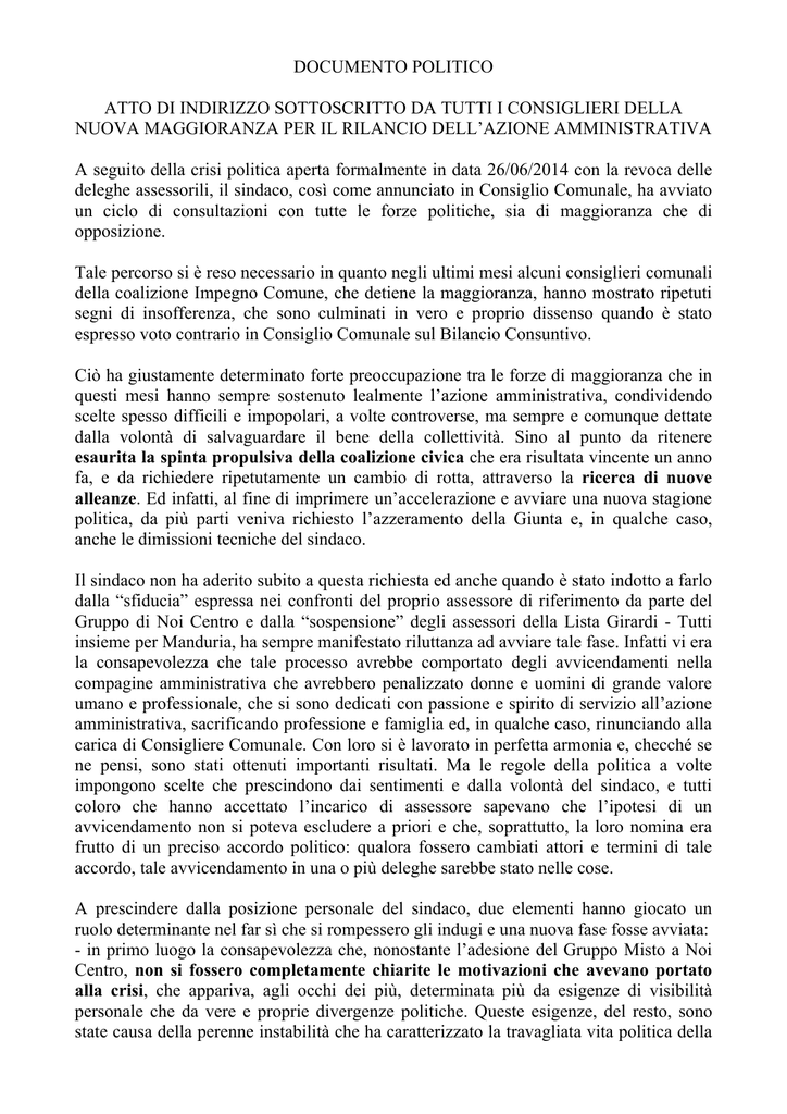 DOCUMENTO POLITICO ATTO DI INDIRIZZO SOTTOSCRITTO DA TUTTI I CONSIGLIERI DELLA NUOVA MAGGIORANZA PER IL RILANCIO DELL’AZIONE AMMINISTRATIVA A seguito della crisi politica aperta formalmente in data 26/06/2014 con la revoca delle deleghe assessorili, il sindaco, così come annunciato in Consiglio Comunale, ha avviato un ciclo di consultazioni con tutte le forze politiche, sia di maggioranza che di opposizione. Tale percorso si è reso necessario in quanto negli ultimi mesi alcuni consiglieri comunali della coalizione Impegno Comune, che detiene la maggioranza, hanno mostrato ripetuti segni di insofferenza, che sono culminati in vero e proprio dissenso quando è stato espresso voto contrario in Consiglio Comunale sul Bilancio Consuntivo. Ciò ha giustamente determinato forte preoccupazione tra le forze di maggioranza che in questi mesi hanno sempre sostenuto lealmente l’azione amministrativa, condividendo scelte spesso difficili e impopolari, a volte controverse, ma sempre e comunque dettate dalla volontà di salvaguardare il bene della collettività. Sino al punto da ritenere esaurita la spinta propulsiva della coalizione civica che era risultata vincente un anno fa, e da richiedere ripetutamente un cambio di rotta, attraverso la ricerca di nuove alleanze. Ed infatti, al fine di imprimere un’accelerazione e avviare una nuova stagione politica, da più parti veniva richiesto l’azzeramento della Giunta e, in qualche caso, anche le dimissioni tecniche del sindaco. Il sindaco non ha aderito subito a questa richiesta ed anche quando è stato indotto a farlo dalla “sfiducia” espressa nei confronti del proprio assessore di riferimento da parte del Gruppo di Noi Centro e dalla “sospensione” degli assessori della Lista Girardi - Tutti insieme per Manduria, ha sempre manifestato riluttanza ad avviare tale fase. Infatti vi era la consapevolezza che tale processo avrebbe comportato degli avvicendamenti nella compagine amministrativa che avrebbero penalizzato donne e uomini di grande valore umano e professionale, che si sono dedicati con passione e spirito di servizio all’azione amministrativa, sacrificando professione e famiglia ed, in qualche caso, rinunciando alla carica di Consigliere Comunale. Con loro si è lavorato in perfetta armonia e, checché se ne pensi, sono stati ottenuti importanti risultati. Ma le regole della politica a volte impongono scelte che prescindono dai sentimenti e dalla volontà del sindaco, e tutti coloro che hanno accettato l’incarico di assessore sapevano che l’ipotesi di un avvicendamento non si poteva escludere a priori e che, soprattutto, la loro nomina era frutto di un preciso accordo politico: qualora fossero cambiati attori e termini di tale accordo, tale avvicendamento in una o più deleghe sarebbe stato nelle cose. A prescindere dalla posizione personale del sindaco, due elementi hanno giocato un ruolo determinante nel far sì che si rompessero gli indugi e una nuova fase fosse avviata: - in primo luogo la consapevolezza che, nonostante l’adesione del Gruppo Misto a Noi Centro, non si fossero completamente chiarite le motivazioni che avevano portato alla crisi, che appariva, agli occhi dei più, determinata più da esigenze di visibilità personale che da vere e proprie divergenze politiche. Queste esigenze, del resto, sono state causa della perenne instabilità che ha caratterizzato la travagliata vita politica della nostra Città, e che nell’arco di 20 anni ha visto fallire tutte le compagini amministrative, indipendentemente dal loro colore politico. Si sente perciò l’esigenza di riportare la dialettica politica cittadina nell’alveo della “normalità”, con un sindaco ed una maggioranza che governano per cinque anni ed un’opposizione che funge da pungolo e da stimolo, e nel frattempo si prepara per offrire una proposta migliore al giudizio degli elettori. Ma per arrivare a questo, occorre una fase di transizione in cui tutte le forze politiche responsabili si uniscano nell’intento di rendere inefficace l’azione destabilizzante di singoli o di piccoli gruppi, facendo prevalere una volta per tutte la logica delle idee e dei programmi su quella dei numeri. - in secondo luogo, la percezione da parte del sindaco, maturata attraverso vari incontri formali ed informali con partiti e singoli consiglieri della minoranza, che tale esigenza di stabilità fosse da loro condivisa. Tutti si auguravano di non essere protagonisti o testimoni dell’ennesimo scioglimento anticipato della consiliatura e alcuni si dichiaravano sin da subito pronti a definire alcuni punti programmatici sulla base dei quali condividere responsabilità di governo cittadino. Alla luce di tutto ciò, il sindaco dichiarava nella seduta di Consiglio Comunale del 24/06/2014 l’apertura della crisi e informava tutti i consiglieri comunali che si sarebbe avviata una nuova fase politica con l’obiettivo di costituire, a partire dalla maggioranza democraticamente eletta, una coalizione di governo la più ampia possibile, in cui fossero rappresentate a pieno titolo, se lo avessero voluto, anche forze politiche sinora collocate all’opposizione. Al fine di rendere praticabile tale ipotesi, veniva fatto esplicito riferimento alla pari dignità delle forze politiche, presupposto indispensabile per superare le disparità determinate dalla distribuzione del premio di maggioranza e non dall’effettivo consenso elettorale. Ciò sta a significare che ogni forza politica che si fosse dichiarata disponibile ad assumere responsabilità diretta nel governo della Città avrebbe avuto diritto ad una rappresentanza in Giunta, così come del resto è stato sinora, indipendentemente dalla consistenza numerica del gruppo di riferimento. Su tale base il sindaco ha avviato un ciclo di consultazioni ufficiali con tutte le forze politiche presenti in Consiglio, il cui esito, reso noto nella riunione congiunta della potenziale maggioranza tenutesi nella serata del 05/07/2014 presso la se
