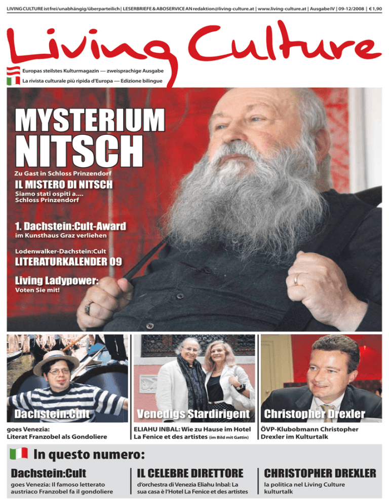 LIVING CULTURE ist frei/unabhängig/überparteilich | LESERBRIEFE & ABOSERVICE AN [email protected] | www.living-culture.at | Ausgabe IV | 09-12/2008 | € 1,90 Europas steilstes Kulturmagazin — zweisprachige Ausgabe La rivista culturale più ripida d’Europa — Edizione bilingue MYSTERIUM NITSCH Zu Gast in Schloss Prinzendorf IL MISTERO DI NITSCH Siamo stati ospiti a.... Schloss Prinzendorf 1. Dachstein:Cult-Award im Kunsthaus Graz verliehen Lodenwalker-Dachstein:Cult LITERATURKALENDER 09 Living Ladypower: Voten Sie mit! Dachstein:Cult goes Venezia: V i Literat Franzobel als Gondoliere Venedigs Stardirigent ELIAHU INBAL: INBAL Wie Wi zu Hause H im i Hotel H t l La Fenice et des artistes (im Bild mit Gattin) Christopher Drexler ÖV Klubobmann Christopher ÖVP-Klubobmann Ö ÖVP Drexler im Kulturtalk In questo numero: Dachstein:Cult IL CELEBRE DIRETTORE CHRISTOPHER DREXLER goes Venezia: Il famoso letterato austriaco Franzobel fa il gondoliere d‘orchestra di Venezia Eliahu Inbal: La sua casa è l‘Hotel La Fenice et des artistes la politica nel Living Culture kulturtalk 02| EDITORIAL · EDITORIALE Inhalt 1 Jahr Living Culture 10-12 HERMANN NITSCH Liebe Living Culture Leserinnen & Leser, 09 17 DANIELA MITTERBERGER 06 KONRAD PAUL LIESSMANN KARL MARKOVICS 04 FRANZOBEL 04.........DACHSTEIN:CULT 15.........LIVING LIFE GOES VENEZIA Franzobel gondelt durch den Canal Grande Franzobel in una gondola sul Canal Grande 05.........WAS IST GLÜCK? COS’È LA FELICITÀ? 17.........LIVING PHILOSOPHY 06.........LIVING SMALLTALK Living Culture meets Karl Markovics & Thomas Roth 08.........LIVING SMALLTALK Konrad Paul Liessmann 18.........LIVING SPORTS 19.........LIVING SPECIALS Erster Living Culture Mäcenas in Stuttgart verliehen Il I conferimento del premio “MAECENAS DI LIVING CULTURE” 20.........LIVING CULTURE LADYPOWER Runde 2: Die neuen Powerladys La titolare di un locale alpino verso un fotografo segreto Secondo turno: Le nuove powerladys 24.........LIVING ITALY von Lodenwalker & Dachstein:Cult Maestro Eliahu Inbal in Venedig Il calendario letterario 2009 Di Lodenwalker e Dachstein:Cult Il maestro Inbal a Venezia 10.........LIVING MYSTERY Zu Gast bei Hermann Nitsch Siamo stati ospiti di…. Hermann Nitsch Ihre Dr. Monika Wogrolly Chefredakteurin Care lettrici, cari lettori, di Living Culture, S Tennis Masters 08 Gipfelwirtin vs. Heimlicher Fotograf 09.........LITERATURKALENDER 2009 borgenen Wunder des Lebens zu bewahren. Living Culture heißt, bewusst Kultur zu leben. Es ist eine Lebenshaltung, ein Grundtenor des Seins. Wir wollen mit diesem innovativen Medium einen Beitrag leisten, damit Kultur lebendig ist und gelebt wird. To be connected to living and culture – ist auch das Motto unserer Partner, Freunde und Sponsoren, die ihre Liebe zur lebendigen Kultur und ihren Mut, Kultur zu leben, bewiesen haben. Neben dem Mysterium Nitsch erwarten Sie auf den folgenden Seiten kulturelle Highlights vom Dachstein mit „Dachstein:Cult goes Venezia“, dem 1. Dachstein:Cult-Award und Dachstein:Cult im Kunsthaus Graz – Franzobels „Reise in den Himmel“. In der Rubrik „Living Loden“ gewinnen Sie Einblick in das Making-of des Lodenwalker-Dachstein:CultLiteraturkalenders, den es in limitierter Auflage nur beim Unternehmen Lodenwalker in Ramsau-Rössing gibt. Dieser Kalender für das Jahr 2009 verbindet Kunstfotografie mit Texten österreichischer Literaten, darunter Franzobel, der im Frühjahr 2005 Atelierteilnehmer der europaweit höchsten Künstlerquarantäne am Dachsteingletscher war. Mir bleibt nur noch zu sagen: Come and join LIVING CULTURE – Leben Sie Kultur! Konrad Paul Liessmann Living Culture meets Günther Ziesel L’inventore del programma televisivo „Alpe-Adria“ Günther Ziesel Anlässlich der 4. Ausgabe, die Sie in Händen halten, feiert Living Culture Geburtstag. Und zwar genau dort, wo alles vor einem Jahr begann, im Casineum des Casino Graz. Wir können wirklich sagen: „Nomen est omen“ - Europas steilstes Kulturmagazin konnte freilich mit einem Exklusivinterview des Extrembergsteigers Reihold Messner nur senkrecht starten! In der neuen Ausgabe haben wir vielen ungewöhnlichen Menschen ungewöhnliche Fragen gestellt, für die Titelstory Geburtstagskind Hermann Nitsch (er wurde heuer siebzig), von dem jüngst in Neapel ein Museum eröffnet wurde. In diesem Editorial danke ich allen, die Living Culture lieben und leben! Unter ihnen besonders zu erwähnen ist der überraschend verschiedene unvergessliche Doyen der österreichischen Literatur, Professor Wendelin Schmidt-Dengler, Wissenschafter des Jahres 2007, der uns noch vor elf Monaten in Wien empfing, und auf den wir in der nächsten Ausgabe mit dem Abdruck des gesamten Interviews einen Nachruf bringen. Sein Vermächtnis wird in Living Culture weiterleben. Denn Living Culture ist mehr als der Name einer Kulturzeitung. Für all jene, die an Living Culture glauben, bedeutet es, im Alltag, in jeder Situation, jeder Stunde und in jedem Augenblick Kultur zu leben: Das heißt, mit den Mitmenschen achtsam und respektvoll umzugehen, sensibel und offen zu sein, neugierig zu bleiben und sich ein kindliches Staunen für die kleinen Glücksmomente und ver- 25.........GEHEIME OASE DER KÜNSTE L’OASI SEGRETA DELLE ART Hotel la Fenice e des artistes in occasione del quarto numero di questa rivista, che tenete in mano, Vi voglio dire che adesso, nel mese di settembre, c’è il nostro compleanno. Lo festeggiamo nel “Casineum” del Casinò di Graz, dove esattamente un anno fa tutto ha avuto inizio, con il primo numero, sulla cui copertina c’era una foto di Reinhold Messner cui veniva dato da me un suo ritratto dipinto da un partecipante a Dachstein:Cult. “Nomen est omen” – era ovvio che la rivista culturale più ripida d’Europa doveva iniziare a picco con un’intervista esclusiva allo scalatore estremo! Nel numero nuovo abbiamo posto delle domande interessanti e insolite a tante persone interessanti; la storia della co