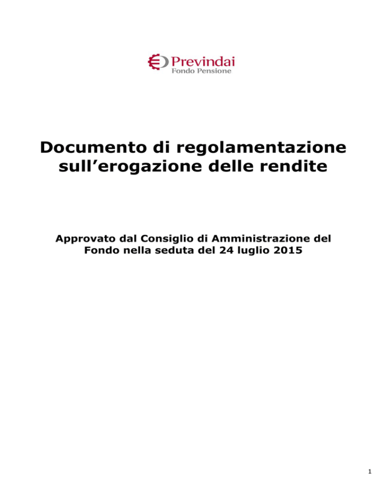 Documento di regolamentazione sull’erogazione delle rendite Approvato dal Consiglio di Amministrazione del Fondo nella seduta del 24 luglio 2015 1 Sommario Art. 1 – Definizioni .......................................................................................................................... 3 Art. 2 – Tipologie di rendita .............................................................................................................. 4 Art. 3 – Iscritti interessati all’erogazione in rendita .............................................................................. 8 Art. 4 – Determinazione della rendita ................................................................................................ 8 Art. 5 – Documentazione da produrre ................................................................................................ 9 Art. 6 – Decorrenza e periodicità dell’erogazione ................................................................................ 10 Art. 7 – Costi applicati sulla rendita .................................................................................................. 10 Art. 8 – Rivalutazione della rendita ................................................................................................... 11 Art. 9 – Decorrenza del Documento di regolamentazione e dichiarazione di responsabilità ........................ 11 ALLEGATO A ................................................................................................................................. 12 ALLEGATO B - COEFFICIENTI DI CONVERSIONE IN RENDITA PREVINDAI............................................... 14 2 EROGAZIONE DELLE RENDITE PREVINDAI Il presente Documento costituisce parte integrante della Nota informativa per i potenziali aderenti (depositata presso la Covip), di Previndai Fondo pensione (di seguito denominato Fondo). Art. 1 – Definizioni 1. Ai fini del presente Regolamento si intende per: 1.1.Rendita, il frutto di un contratto di assicurazione, stipulato dal Fondo con i Pool delle compagnie assicurative convenzionate, gestori del comparto Assicurativo 1990 e di quello 2014, in forza del quale i Pool medesimi, contro un compenso corrisposto in unica soluzione (capitale di fine periodo della fase di accumulo, ovvero parte di esso, in appresso, per entrambi, capitale di fine periodo), si impegnano a pagare somme predeterminabili al verificarsi di determinati eventi relativi alla sopravvivenza dell’iscritto o dei suoi aventi causa, come meglio in seguito specificati. 1.2.Contraente, il soggetto che stipula il contratto di assicurazione e ne gestisce tutti gli adempimenti amministrativi. Nella fattispecie il Fondo. 1.3.Titolare, l’iscritto che ha presentato la richiesta di prestazione previdenziale in forma di rendita e l’ha ottenuta. 1.4.Reversionario, il soggetto che, una volta indicato dall’iscritto al momento della domanda di liquidazione, subentra - se e fintantoché in vita - dopo il decesso del titolare, nel beneficio della rendita - o in parte di essa - ovvero al termine del periodo di certezza in caso di decesso del titolare durante tale periodo. 1.5.Periodo di certezza, periodo durante il quale la rendita viene erogata indipendentemente dall’esistenza in vita del titolare. 1.6.Beneficiario/i nel periodo di certezza, il titolare, se in vita ovvero il/i soggetto/i designato/i dal titolare stesso a subentrare nel beneficio della rendita, in caso di suo decesso durante il periodo di certezza e fino alla scadenza del periodo stesso. 1.7.Coefficienti di conversione in rendita o coefficienti, i valori che servono a determinare la rendita iniziale dato il capitale di fine periodo; dipendono da ipotesi demografiche, desunte da elaborazioni effettuate dall’ISTAT o da altro qualificato organismo nazionale o comunitario nonché da ipotesi finanziarie di redditività della gestione separata. Esprimono il valore iniziale della rendita per ogni 1000 euro di capitale di fine periodo. Per l’elencazione dei coefficienti di ciascuna tipologia di rendita, si faccia riferimento all’Allegato B del presente Documento. 1.8.Gestione separata, particolare gestione finanziaria, separata rispetto al complesso delle attività della compagnia, nella quale vengono investiti i capitali di fine periodo, al netto dei costi, se previsti. 1.9.Aliquota di retrocessione, percentuale del rendimento realizzato dalla gestione separata che la compagnia riconosce annualmente al contraente. 1.10.Rivalutazione, percentuale annua di incremento della rendita in essere. Tecnicamente è la risultante di un algoritmo di calcolo complesso che dipende dai seguenti tre elementi: dall’aliquota di retrocessione; dal “tasso tecnico”; dal “tasso di rendimento garantito”. 1.11.Tasso tecnico, tasso annuo di interesse fisso riconosciuto dalla compagnia al momento dell’accensione della rendita e per tutta la durata della rendita stessa; si 3 tratta di un rendimento anticipato sotto forma di aumento della rendita annua iniziale, a parità di capitale di fine periodo. Se maggiore di zero, corrisponde ad un anticipo sulle rivalutazioni future. 1.12.Tasso di rendimento garantito, tasso di rendimento annuo minimo garantito sulla rendita in essere indipendentemente dall’andamento della gestione separata. Nel Fondo è pari a zero in presenza di tassi tecnici positivi ed è positivo in presenza di tassi tecnici pari a zero. 1.13.Consolidamento della rendita, meccanismo in base al quale la rivalutazione riconosciuta annualmente sulla rendita è da questa acquisita definitivamente, indipendentemente dall’andamento dei rendimenti futuri della gestione separata. Art. 2 – Tipologie di rendita 1. Il Fondo mette a disposizione dell’iscritto per l’erogazione della pensione complementare diverse tipologie di rendita; possono essere combinate tra loro le opzioni di seguito indicate alle lettere b) ed e) oppure d) ed e). Trascorsi i termini di decorrenza della rendita, la scelta