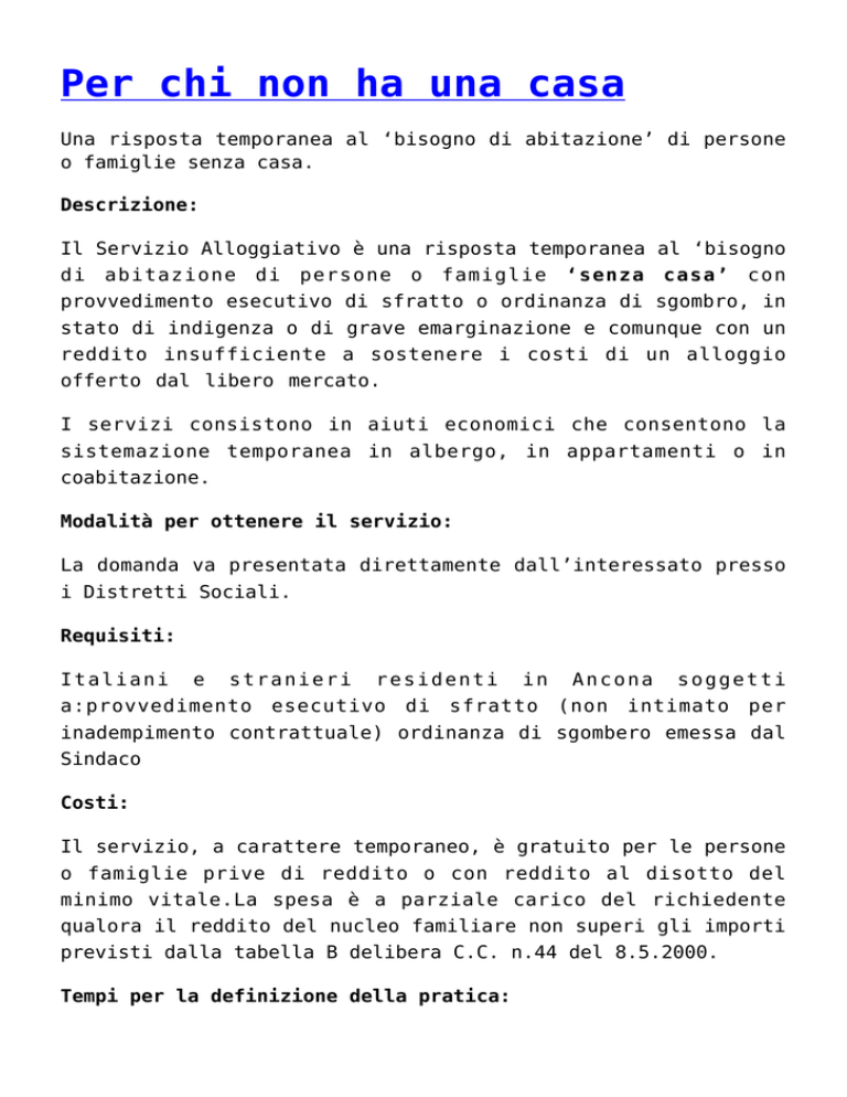 Per chi non ha una casa Una risposta temporanea al ‘bisogno di abitazione’ di persone o famiglie senza casa. Descrizione: Il Servizio Alloggiativo è una risposta temporanea al ‘bisogno di abitazione di persone o famiglie ‘senza casa’ con provvedimento esecutivo di sfratto o ordinanza di sgombro, in stato di indigenza o di grave emarginazione e comunque con un reddito insufficiente a sostenere i costi di un alloggio offerto dal libero mercato. I servizi consistono in aiuti economici che consentono la sistemazione temporanea in albergo, in appartamenti o in coabitazione. Modalità per ottenere il servizio: La domanda va presentata direttamente dall’interessato presso i Distretti Sociali. Requisiti: Italiani e stranieri residenti in Ancona soggetti a:provvedimento esecutivo di sfratto (non intimato per inadempimento contrattuale) ordinanza di sgombero emessa dal Sindaco Costi: Il servizio, a carattere temporaneo, è gratuito per le persone o famiglie prive di reddito o con reddito al disotto del minimo vitale.La spesa è a parziale carico del richiedente qualora il reddito del nucleo familiare non superi gli importi previsti dalla tabella B delibera C.C. n.44 del 8.5.2000. Tempi per la definizione della pratica: Immediato, in caso di provvedimento di urgenza (sfratto esecutivo da parte di forza pubblica) Documentazione da presentare: – Redditi dei parenti tenuti agli alimenti – Sentenza di sfratto o sgombero – Ricevute canone di affitto o dichiarazione della famiglia ospitante o fattura emessa dall’albergo. Tale documentazione può essere presentata in originale o in copia autentica, oppure tramite autocertificazione. Normativa di riferimento: Delibera del Consiglio Comunale n. 126 del 9.3.98 Dirigente Stella Roncarelli Richiesta italiana di cittadinanza Dal 18 giugno 2015 le domande verranno esclusivamente con modalità informatica acquisite Cosa deve fare il richidente ? 1) Registrarsi sul portale https://cittadinanza.dlci.interno.it 2) Selezionare la funzionalità “gestione domande” 3) Scegliere, tra i modelli elencati, quello corrispondente alla propria situazione personale 4) Compilare la domanda on line allegando i documenti necessari:estratto di nascita del paese origine, certificato penale del paese di origine e di eventuali paesi terzi, ricevuta di versamento del contributo di € 200, documento di riconoscimento. Occorre inserire anche il codice della marca da bollo € 16 corrisposta elettronicamente 5) Procedere con la trasmissione della domanda che consente di ottenere la ricevuta di invio Procedura per il Rinnovo del permesso di soggiorno e rilascio Permesso di soggiorno UE per soggiornanti di lungo periodo(ex carta di soggiorno) Procedura per il rinnovo del permesso di soggiorno e rilascio di Permesso di soggiorno UE per soggiornanti di lungo periodo(ex carta di soggiorno) Il nuovo sistema, sviluppato dal Ministero dell’Interno in collaborazione con l’Associazione Nazionale dei Comuni Italiani, Poste Italiane S.p.A. e gli Istituti di Patronato, ha l’obiettivo di semplificare e migliorare il processo di rinnovo del Permesso di Soggiorno e rilascio di soggiorno UE per soggiornanti di lungo periodo(ex carta di soggiorno) Il Servizio si effettua presso il Centro Servizi Immigrati solo su appuntamento nei giorni e negli orari di seguito indicati: – Lunedì 9.00 – 12.30 – Martedì 11.00 – 12.30 15.00 – 17.00 – Mercoledì 9.00 – 12.30 – Giovedì 10.00 – 16.00 (orario continuato) – Venerdì 9.00 – 12.30 Requisiti: – residenza anagrafica nel Comune di Ancona; – presentazione della documentazione idonea per avviare la pratica. Il servizio è rivolto ai cittadini immigrati non comunitari, comunitari e italiani. Le prestazioni professionali sono gratuite. Le procedure per il rilascio dei titoli di soggiorno e il rilascio della Carta di Soggiorno, possono essere effettuate anche presso i Patronati. Gli altri canali informativi sulla nuova procedura sono: – Il Portale Immigrazione consultabile nella sezione “approfondimenti” fornisce tutte le informazioni sulle procedure di rilascio e di rinnovo del titolo di soggiorno. Inoltre permette di verificare lo stato di avanzamento della propria pratica. – Il Call Center , attraverso il numero verde 800.309.309 fornisce informazioni di carattere generale, sviluppato in collaborazione con l’ANCI, è disponibile , realizzato in cinque lingue (Arabo, Francese, Inglese, Italiano, Spagnolo) – Uffici Postali di Ancona abilitati (Sportello Amico) per la presentazione del KIT, contenente la modulistica. Nella sezione “Allegati” è disponibile l’elenco degli sportelli. – Il Centro Servizi Immigrati dove è possibile visionare l’elenco dei permessi di soggiorno e delle carte di soggiorno in consegna. – Permesso Ce di lungo periodo E’ necessario aggiornare il titolo in formato elettronico per circolare in Europa. Si ricorda che in Europa non verrà più riconosciuto lo status di lungo soggiornante se in possesso del titolo in formato cartaceo, tale decisione è stata presa la scorsa estate a Bruxelles dagli Stati membri per uniformare la prassi relativa all’emissione dei titoli in formato elettronico. Servizi Sociali – Unità Operativa Emarginazione e Pronta accoglienza – Viale della Vittoria, 37 Ancona Dirigente Stella Roncarelli Responsabile Maria Rita Venturini Info Hilda Arteaga – Ali Farhoudi – Orietta Ragni Orari Lunedì – Mercoledì – Venerdì: 9,00 – 12,30 Martedì: 11,00 – 12,30 / 15,00 – 17,00 Giovedì: 10,00 – 16,00 Telefoni 0712226116 0712226127 Fax 0712222168 Link esterni: Sito Questura di Ancona Portaleimmigrazione Sito Anci sui permessi di soggiorno Allegati: poste.xls Permesso di soggiorno valido almeno un anno per lo straniero che perde il lavoro Permesso di soggiorno valido almeno un anno per lo straniero che perde il lavoro L’estensione è stata introdotta dalla legge di riforma del mercato del lavoro in vigore dal 18 luglio 2012. Se 