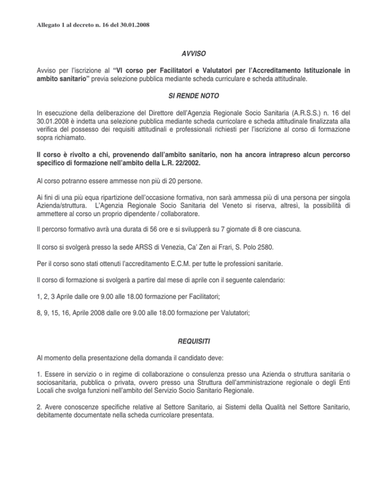 Allegato 1 al decreto n. 16 del 30.01.2008 AVVISO Avviso per l’iscrizione al “VI corso per Facilitatori e Valutatori per l’Accreditamento Istituzionale in ambito sanitario” previa selezione pubblica mediante scheda curriculare e scheda attitudinale. SI RENDE NOTO In esecuzione della deliberazione del Direttore dell’Agenzia Regionale Socio Sanitaria (A.R.S.S.) n. 16 del 30.01.2008 è indetta una selezione pubblica mediante scheda curricolare e scheda attitudinale finalizzata alla verifica del possesso dei requisiti attitudinali e professionali richiesti per l’iscrizione al corso di formazione sopra richiamato. Il corso è rivolto a chi, provenendo dall’ambito sanitario, non ha ancora intrapreso alcun percorso specifico di formazione nell’ambito della L.R. 22/2002. Al corso potranno essere ammesse non più di 20 persone. Ai fini di una più equa ripartizione dell’occasione formativa, non sarà ammessa più di una persona per singola Azienda/struttura. L’Agenzia Regionale Socio Sanitaria del Veneto si riserva, altresì, la possibilità di ammettere al corso un proprio dipendente / collaboratore. Il percorso formativo avrà una durata di 56 ore e si svilupperà su 7 giornate di 8 ore ciascuna. Il corso si svolgerà presso la sede ARSS di Venezia, Ca’ Zen ai Frari, S. Polo 2580. Per il corso sono stati ottenuti l’accreditamento E.C.M. per tutte le professioni sanitarie. Il corso di formazione si svolgerà a partire dal mese di aprile con il seguente calendario: 1, 2, 3 Aprile dalle ore 9.00 alle 18.00 formazione per Facilitatori; 8, 9, 15, 16, Aprile 2008 dalle ore 9.00 alle 18.00 formazione per Valutatori; REQUISITI Al momento della presentazione della domanda il candidato deve: 1. Essere in servizio o in regime di collaborazione o consulenza presso una Azienda o struttura sanitaria o sociosanitaria, pubblica o privata, ovvero presso una Struttura dell’amministrazione regionale o degli Enti Locali che svolga funzioni nell’ambito del Servizio Socio Sanitario Regionale. 2. Avere conoscenze specifiche relative al Settore Sanitario, ai Sistemi della Qualità nel Settore Sanitario, debitamente documentate nella scheda curricolare presentata. Allegato 1 al decreto n. 16 del 30.01.2008 VALUTAZIONE DEI TITOLI - Formazione specifica in tema di qualità 0 punti (nessuna formazione) 3 punti (fino a 20 ore) 5 punti (oltre le 20 ore) A questi si sommano 2 punti ulteriori nel caso in cui la formazione in tema di qualità riguardi il settore specifico del corso in oggetto. Sono ritenute valide ai fini dell'attribuzione di questo punteggio le esperienze formative in tema di autorizzazione, accreditamento e certificazione ISO. - Partecipazione a progetti o percorsi di Miglioramento Continuo della Qualità 1 punto a progetto o percorso fino ad un massimo di 5 punti - Partecipazione ad attività di implementazione di Sistemi Qualità (certificazione della propria U.O., nomina a RAQ, Auditor in verifiche ispettive) 1 punto ad evento fino ad un massimo di 5 punti - Pubblicazioni specifiche 1 punto a pubblicazione per un massimo di 3 - Docenze specifiche 0 punti (nessuna docenza) 3 punti (fino a 20 ore di docenza attestate) 4 punti (da 20 a 40 ore di docenza attestate) 5 punti (oltre 40 ore di docenza attestate) Ai fini dell'attribuzione del punteggio non saranno ritenute valide le visite di verifica eventualmente effettuate per conto di ARSS. - Ai partecipanti che dichiarano di operare nell'ambito specifico del corso saranno attribuiti ulteriori 5 punti. Come sottolineato nei bandi, non sarà ammessa più di una persona appartenente alla stessa struttura, salvo eccedenza dei posti; per garantire che in caso di rifiuto da parte degli ammessi al corso venga rispettata detta clausola, i richiedenti, che pure hanno ottenuto un punteggio utile ma non il migliore tra i partecipanti alla selezione provenienti dalla propria Azienda, saranno inseriti in graduatoria successivamente all’ultima Azienda utilmente collocata Allegato 1 al decreto n. 16 del 30.01.2008 RISERVA Ai fini di una più equa ripartizione dell’occasione formativa, non sarà ammessa – salvo eccedenza dei posti – più di una persona per singola Azienda / Struttura. Questa Agenzia si riserva, altresì, la possibilità di ammettere al corso un proprio dipendente / collaboratore. DOMANDE DI AMMISSIONE Le domande di ammissione dovranno essere redatte su carta semplice, utilizzando l’apposito modulo allegato al presente bando (allegato n. 1), indirizzate al Direttore dell’Agenzia Regionale Socio Sanitaria (A.R.S.S.) Ca’ Zen ai Frari – S. Polo n. 2580 – 30125 Venezia – e spedite obbligatoriamente a mezzo raccomandata con avviso di ricevimento entro 30 giorni dalla data di pubblicazione del presente avviso nel BUR della Regione Veneto. DOCUMENTAZIONE DA ALLEGARE ALLA DOMANDA 1. La scheda curricolare, datata e sottoscritta, redatta secondo lo schema tipo allegato al presente bando (allegato n. 2), dovrà mettere in evidenza l’esperienza professionale maturata, in particolare nel settore della qualità, la posizione individuale rispetto ai singoli requisiti specificati, il livello di conoscenza e grado di formazione in ordine alla gestione dei sistemi qualità. I documenti e i titoli potranno essere allegati in copia o dichiarati tramite dichiarazione sostitutiva. Nella compilazione della scheda curricolare sarà cura del candidato rendere riconoscibile la formazione dichiarata indicando i riferimenti richiesti. Laddove le indicazioni risultino incomplete non verrà attribuito alcun punteggio. 2. La scheda attitudinale (allegato n.3), compilata dal responsabile della struttura nella quale il candidato opera e controfirmata per conoscenza dal Legale rappresentante della medesima. Si precisa che nel caso delle Aziende Sanitarie, il Legale Rappresentante si intende come Direttore Generale Le domande non complete dell’intera documentazione prevista dal presente bando saranno escluse dalla selezione. La tassa di iscri