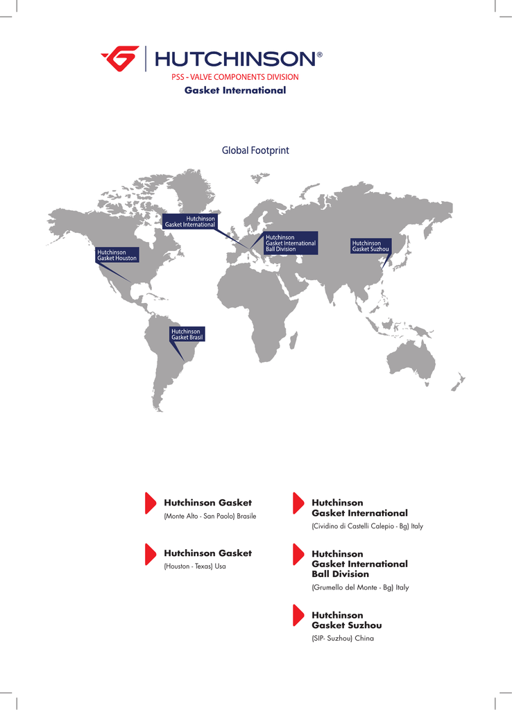 Hutchinson Gasket (Monte Alto - San Paolo) Brasile Hutchinson Gasket International (Cividino di Castelli Calepio - Bg) Italy Hutchinson Gasket (Houston - Texas) Usa Hutchinson Gasket International Ball Division (Grumello del Monte - Bg) Italy Hutchinson Gasket Suzhou (SIP- Suzhou) China 3 INDEX INDICE 4 Introduction Introduzione 05 Seats for valves Seggi per valvole 16 Balls for trunnion and floating valves Sfere per valvole trunnion e floating 28 Slabs Slabs 34 Components Componenti 38 INTRODUCTION INTRODUZIONE Gasket International Gasket International 06 Valve components since 1971 Componenti per valvole dal 1971 09 Engineering activities on valve components 10 La progettazione dei componenti Standard design Progetti standard 11 Design features Caratteristiche di progetto 12 Steel qualities Qualità degli acciai 13 Standard dimensions in stock Dimensioni standard a stock 13 Marking, material identification Marcatura, identificazioni materiale 14 Cryogenic Criogenia 14 Nickel-Plating Nichelatura 14 Nickel Silicon Nickel Silicio 15 Surface treatment Trattamento superficiale 15 5 Gasket International is the world leading manufacturer of steel seats, balls and valve components with ultra-modern manufacturing plants in Italy and China and exports in all 5 continents. Gasket International employs over 250 people and is in continuos expansion. We owe much of our success to the skills, experience and dedication of our employees who have made quality and innovation the cornerstone of Gasket International since its start in 1971. Born by the incorporation of three companies with excellent expertise in rubber, thermoplastic and steel machining technologies, Gasket International is today a privately-owned firm with a unique know-how in sealing systems for industrial valves, particularly ball and gate valves and challenging growth plans in and outside Italy. Our seats, balls, slabs and related sealing accessories are supplied for a wide range of applications in the oil and gas and petrochemical industries. As of August 1, 2013 Gasket International SpA belongs to Hutchinson Group, 100% owned by TOTAL. Following the acquisition of 100% of the shares of Gasket International Spa, the French multinational company HUTCHINSON S.A. has created the new Valve Components Division, within the Precision Sealing Systems Activity. The new Division will benefit right away from the combined effect of the long standing expertize of Gasket International in designing, manufacturing and selling complete sealing solutions for ball and gate valves in the Oil and Gas business, and the extraordinary capability of HUTCHINSON coming from its global footprint, its undisputed technical leadership on the elastomeric and thermoplastic products and its continuous investments in research and development. 6 Gasket International è il leader mondiale nella produzione di seggi, sfere e componenti di tenuta per valvole industriali con impianti produttivi ultra moderni in Italia e in Cina ed esporta in tutti e 5 i continenti. Gasket International impiega più di 250 persone ed è in continua espansione. Dobbiamo molto del nostro successo alle capacità, esperienza e dedizione dei nostri dipendenti che hanno fatto della qualità ed innovazione la filosofia di sviluppo di Gasket International dai sui albori nel 1971. Nata dalla fusione di tre aziende con eccellenti competenze nei settori gomma, materiali termoplastici e lavorazione degli acciai, Gasket International è oggi una società privata con know-how unico nei sistemi di tenuta per valvole industriali, con particolare specializzazione nelle valvole a sfera e a saracinesca, con ambiziosi programmi di crescita futura in Italia ed all’estero. I nostri seggi, sfere, slab e relative accessori di tenuta sono forniti per una vasta gamma di applicazioni nei settori petrolifero e petrolchimico. Dal 1 agosto 2013 Gasket International appartiene al Gruppo Hutchinson posseduto al 100% dal gruppo Total. A seguito di questa acquisizione è nata la nuova divisione “Valve Components Division” all’interno della Business Unit Precision Sealing Systems del gruppo. La nuova divisione di Hutchinson potrà immediatamente beneficiare del connubio tra la pluridecennale esperienza della Gasket International SpA nella progettazione, produzione e vendita di soluzioni complete per le tenute delle valvole a sfera e a saracinesca del settore petrolifero, con le straordinarie potenzialità della multinazionale francese relativamente al suo posizionamento globale, alla leadership tecnologica negli elastomeri e nei termoplastici e ai continui investimenti in ricerca e sviluppo prodotti. Con questa operazione, il gruppo Hutchinson continua in modo concreto la sua espansione nel mercato dell’Oil & Gas, nel campo dei prodotti di eccellenza. 7 Components for Trunnion Mounted Ball Valves. Componenti per valvole Sfera Trunnion. Components for Floating Ball Valves. Componenti per valvole Sfera Floating. Components for Gate Valves. Componenti per valvole Saracinesca. 8 Componenti per valvole dal 1971 Introduction • Introduzione Valve components since 1971 Gasket International has been manufacturing and selling industrial valve components since 1971 and is a world-wide well known technical and logistic partner for flow control valve manufacturers. Besides engineering activities regarding seats, balls and slabs, Gasket International offers to the customers a complete set of components, ready to be assembled in the valve. This set comprises of seats with elastomeric inserts and thermoplastic inserts, together with balls, springs, self-lubricating bearings and industrial gaskets (spring energized collars, preformed graphite rings, elastomeric and polymeric o-rings, etc…). Please contact our Commercial department, we will be able to suggest you a “standard Project analisys” or alternative solutions suitable for your requirements. We also specify that each project is properly codified and stored as an exclusi
