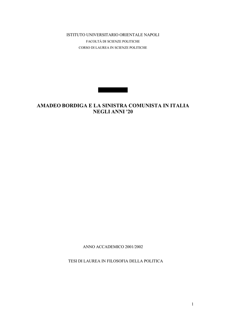 ISTITUTO UNIVERSITARIO ORIENTALE NAPOLI FACOLTÀ DI SCIENZE POLITICHE CORSO DI LAUREA IN SCIENZE POLITICHE Giuseppe Russo AMADEO BORDIGA E LA SINISTRA COMUNISTA IN ITALIA NEGLI ANNI '20 ANNO ACCADEMICO 2001/2002 TESI DI LAUREA IN FILOSOFIA DELLA POLITICA 1 Sommario INTRODUZIONE ................................................................................................................... 3 Capitolo I IL MOVIMENTO MARXISTA IN ITALIA, DALLA RIVOLUZIONE BOLSCEVICA ALLA FORMAZIONE DEL PCD'I ............................................. 9 La necessità della rivoluzione in Italia ................................................................................. 9 La valutazione della guerra imperialistica nel Partito Socialista Italiano .......................... 16 La concezione del partito nella sinistra comunista d'Italia................................................. 23 Capitolo II L'INTERPRETAZIONE NEL PCd'I DELLE PRINCIPALI DOTTRINE POLITICHE NON COMUNISTE ................................................................... 32 Il principio democratico e la sua negazione nel comunismo marxista ............................... 32 La valutazione dell'offensiva fascista nella continuità con lo Stato liberale ...................... 41 Lo stalinismo, antitesi politica dell'internazionalismo proletario....................................... 55 Capitolo III L'INTERNAZIONALISMO PROLETARIO SOPPIANTATO NEI PC DAL "COMUNISMO NAZIONALE"..................................................................... 63 Il contrasto tra la visione politica "bordighiana" e quella "gramsciana" ............................ 63 Il dibattito interno del PCd'I, in preparazione al congresso di Lione del '26 ..................... 71 La nuova "ortodossia" di partito, staliniana: l'omologazione del "nemico interno" (trotzkismo-bordighismo) .................................................................................................. 79 CONCLUSIONI ................................................................................................................. 90 BIBLIOGRAFIA ................................................................................................................. 97 Articoli di Amadeo Bordiga: .............................................................................................. 97 Opere di Bordiga: ............................................................................................................... 98 Articoli di Antonio Gramsci: ............................................................................................. 98 Altri articoli:....................................................................................................................... 99 Altre opere: ........................................................................................................................ 99 2 INTRODUZIONE La sinistra comunista "italiana" 1, alla luce della lunga battaglia teorica e di classe in difesa dell'elaborazione marxista, rappresentò lo strumento rivoluzionario più coerente per la formazione del partito di classe dei proletari, in opposizione frontale con le forze "opportuniste" 2 che dominavano nel Partito Socialista Italiano. Il Partito Comunista d'Italia, nato a Livorno nel 1921, si fondava su basi teoriche e programmatiche "leggittimatrici" 3 dell'azione della classe operaia che nell'ultimo decennio aveva raggiunto il più alto livello di conflittualità dall'epoca della Comune di Parigi (1871). Infatti, la nuova fase di capitalismo maturo, efficacemente definita da Lenin col sintetico termine "imperialista", aveva generato un'enorme accelerazione degli avvenimenti politici e sociali su scala planetaria, sino a culminare nel primo massacro bellico tra "popoli", a livello mondiale. La nascita di uno strumento rivoluzionario come il partito, in Italia rispondeva alla necessità della difesa degli interessi proletari, sacrificati dalla dirigenza del PSI sull'altare della mediazione politica nei confronti delle esigenze del "proprio" stato-nazione; il "dovere" del movimento comunista di rompere con tale impostazione, propria della Seconda Internazionale, comportava l'affermazione nel partito di caratteri d'intransigenza, nei confronti delle forze politiche e sociali che non si erano opposte in maniera "disfattista" 4 alla logica bellica, e di coerenza con la linea marxista, esemplificata dalla scelta bolscevica di opporre alla guerra tra Stati nazionali (tra "popoli" contrapposti), la discordia di classe per l'affratellamento internazionale del "popolo" lavoratore. Il primo capitolo – Il movimento marxista in Italia, dalla rivoluzione bolscevica alla formazione del PCd'I – vuole evidenziare il ruolo decisivo, per gli sviluppi rivoluzionari nell'occidente capitalisticamente avanzato, svolto dalla rivoluzione d'Ottobre del '17. Essa rappresentò, allo stesso tempo, una cesura rispetto alla logica della "sovranità nazionale" 5 e una dimostrazione "concreta" della realizzabilità pratica del programma comunista, delineato da Marx ed Engels nella dottrina del socialismo scientifico. La necessità della rivoluzione mette in risalto il gravoso compito che pesava sulle spalle del proletariato "occidentale" (nel caso specifico, in Italia): sfruttare le condizioni, oggettivamente favorevoli alla rivoluzione, determinate dal disastro bellico e dalle sue conseguenze tremende da un punto di vista umano ed economico (crisi, disoccupazione, inflazione); la necessità, per la classe che aveva subito maggiormente le conseguenze del massacro imperialistico, era seguire l'"esempio" del proletariato sovietico e sottrarsi alle logiche nazionali e produttivistiche che a1 Il termine "italiano/a" va inteso solo per definire il movimento che agisce in Italia, senza alcun collegamento all'appartenenza nazionale che è un presupposto respinto dalla stessa "sinistra comunista". 2 Il termine va inteso nell'accezione di "deviazione dalla dottrina rivoluzionaria di classe", in quanto m