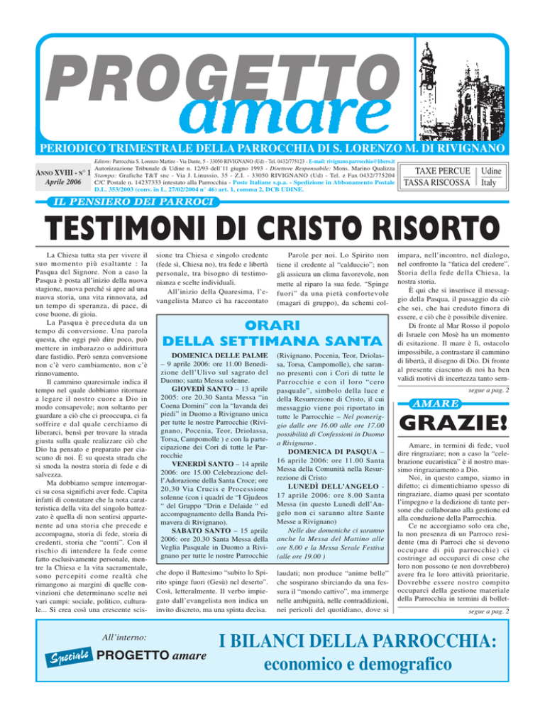 PROGETTO PERIODICO TRIMESTRALE DELLA PARROCCHIA DI S. LORENZO M. DI RIVIGNANO ANNO XVIII - N° 1 Aprile 2006 Editore: Parrocchia S. Lorenzo Martire - Via Dante, 5 - 33050 RIVIGNANO (Ud) - Tel. 0432/775123 - E-mail: [email protected] Autorizzazione Tribunale di Udine n. 12/93 dell’11 giugno 1993 - Direttore Responsabile: Mons. Marino Qualizza Stampa: Grafiche T&T snc - Via J. Linussio, 35 - Z.I. - 33050 RIVIGNANO (Ud) - Tel. e Fax 0432/775204 C/C Postale n. 14237333 intestato alla Parrocchia - Poste Italiane s.p.a. - Spedizione in Abbonamento Postale D.L. 353/2003 (conv. in L. 27/02/2004 n° 46) art. 1, comma 2, DCB UDINE. TAXE PERCUE TASSA RISCOSSA Udine Italy IL PENSIERO DEI PARROCI TESTIMONI DI CRISTO RISORTO La Chiesa tutta sta per vivere il suo momento più esaltante : la Pasqua del Signore. Non a caso la Pasqua è posta all’inizio della nuova stagione, nuova perché si apre ad una nuova storia, una vita rinnovata, ad un tempo di speranza, di pace, di cose buone, di gioia. La Pasqua è preceduta da un tempo di conversione. Una parola questa, che oggi può dire poco, può mettere in imbarazzo o addirittura dare fastidio. Però senza conversione non c’è vero cambiamento, non c’è rinnovamento. Il cammino quaresimale indica il tempo nel quale dobbiamo ritornare a legare il nostro cuore a Dio in modo consapevole; non soltanto per guardare a ciò che ci preoccupa, ci fa soffrire e dal quale cerchiamo di liberarci, bensì per trovare la strada giusta sulla quale realizzare ciò che Dio ha pensato e preparato per ciascuno di noi. È su questa strada che si snoda la nostra storia di fede e di salvezza. Ma dobbiamo sempre interrogarci su cosa significhi aver fede. Capita infatti di constatare che la nota caratteristica della vita del singolo battezzato è quella di non sentirsi appartenente ad una storia che precede e accompagna, storia di fede, storia di credenti, storia che “conti”. Con il rischio di intendere la fede come fatto esclusivamente personale, mentre la Chiesa e la vita sacramentale, sono percepiti come realtà che rimangono ai margini di quelle convinzioni che determinano scelte nei vari campi: sociale, politico, culturale... Si crea così una crescente scis- sione tra Chiesa e singolo credente (fede sì, Chiesa no), tra fede e libertà personale, tra bisogno di testimonianza e scelte individuali. All’inizio della Quaresima, l’evangelista Marco ci ha raccontato Parole per noi. Lo Spirito non tiene il credente al “calduccio”; non gli assicura un clima favorevole, non mette al riparo la sua fede. “Spinge fuori” da una pietà confortevole (magari di gruppo), da schemi col- ORARI DELLA SETTIMANA SANTA DOMENICA DELLE PALME – 9 aprile 2006: ore 11.00 Benedizione dell’Ulivo sul sagrato del Duomo; santa Messa solenne. GIOVEDÌ SANTO – 13 aprile 2005: ore 20.30 Santa Messa “in Coena Domini” con la “lavanda dei piedi” in Duomo a Rivignano unica per tutte le nostre Parrocchie (Rivignano, Pocenia, Teor, Driolassa, Torsa, Campomolle ) e con la partecipazione dei Cori di tutte le Parrocchie VENERDÌ SANTO – 14 aprile 2006: ore 15.00 Celebrazione dell’Adorazione della Santa Croce; ore 20,30 Via Crucis e Processione solenne (con i quadri de “I Gjudeos “ del Gruppo “Drin e Delaide “ ed accompagnamento della Banda Primavera di Rivignano). SABATO SANTO – 15 aprile 2006: ore 20.30 Santa Messa della Veglia Pasquale in Duomo a Rivignano per tutte le nostre Parrocchie (Rivignano, Pocenia, Teor, Driolassa, Torsa, Campomolle), che saranno presenti con i Cori di tutte le Parrocchie e con il loro “cero pasquale”, simbolo della luce e della Resurrezione di Cristo, il cui messaggio viene poi riportato in tutte le Parrocchie – Nel pomeriggio dalle ore 16.00 alle ore 17.00 possibilità di Confessioni in Duomo a Rivignano . DOMENICA DI PASQUA – 16 aprile 2006: ore 11.00 Santa Messa della Comunità nella Resurrezione di Cristo LUNEDÌ DELL’ANGELO 17 aprile 2006: ore 8.00 Santa Messa (in questo Lunedì dell’Angelo non ci saranno altre Sante Messe a Rivignano) Nelle due domeniche ci saranno anche la Messa del Mattino alle ore 8.00 e la Messa Serale Festiva (alle ore 19.00 ) che dopo il Battesimo “subito lo Spirito spinge fuori (Gesù) nel deserto”. Così, letteralmente. Il verbo impiegato dall’evangelista non indica un invito discreto, ma una spinta decisa. laudati; non produce “anime belle” che sospirano sbirciando da una fessura il “mondo cattivo”, ma immerge nelle ambiguità, nelle contraddizioni, nei pericoli del quotidiano, dove si All’interno: Speciale PROGETTO amare impara, nell’incontro, nel dialogo, nel confronto la “fatica del credere”. Storia della fede della Chiesa, la nostra storia. È qui che si inserisce il messaggio della Pasqua, il passaggio da ciò che sei, che hai creduto finora di essere, e ciò che è possibile divenire. Di fronte al Mar Rosso il popolo di Israele con Mosè ha un momento di esitazione. Il mare è lì, ostacolo impossibile, a contrastare il cammino di libertà, il disegno di Dio. Di fronte al presente ciascuno di noi ha ben validi motivi di incertezza tanto semsegue a pag. 2 AMARE GRAZIE! Amare, in termini di fede, vuol dire ringraziare; non a caso la “celebrazione eucaristica” è il nostro massimo ringraziamento a Dio. Noi, in questo campo, siamo in difetto; ci dimentichiamo spesso di ringraziare, diamo quasi per scontato l’impegno e la dedizione di tante persone che collaborano alla gestione ed alla conduzione della Parrocchia. Ce ne accorgiamo solo ora che, la non presenza di un Parroco residente (ma di Parroci che si devono occupare di più parrocchie) ci costringe ad occuparci di cose che loro non possono (e non dovrebbero) avere fra le loro attività prioritarie. Dovrebbe essere nostro compito occuparci della gestione materiale della Parrocchia in termini di bolletsegue a pag. 2 I BILANCI DELLA PARROCCHIA: economico e demografico PROGETTO amare Pagina 2 IL PENSIERO DEI PARROCI TE