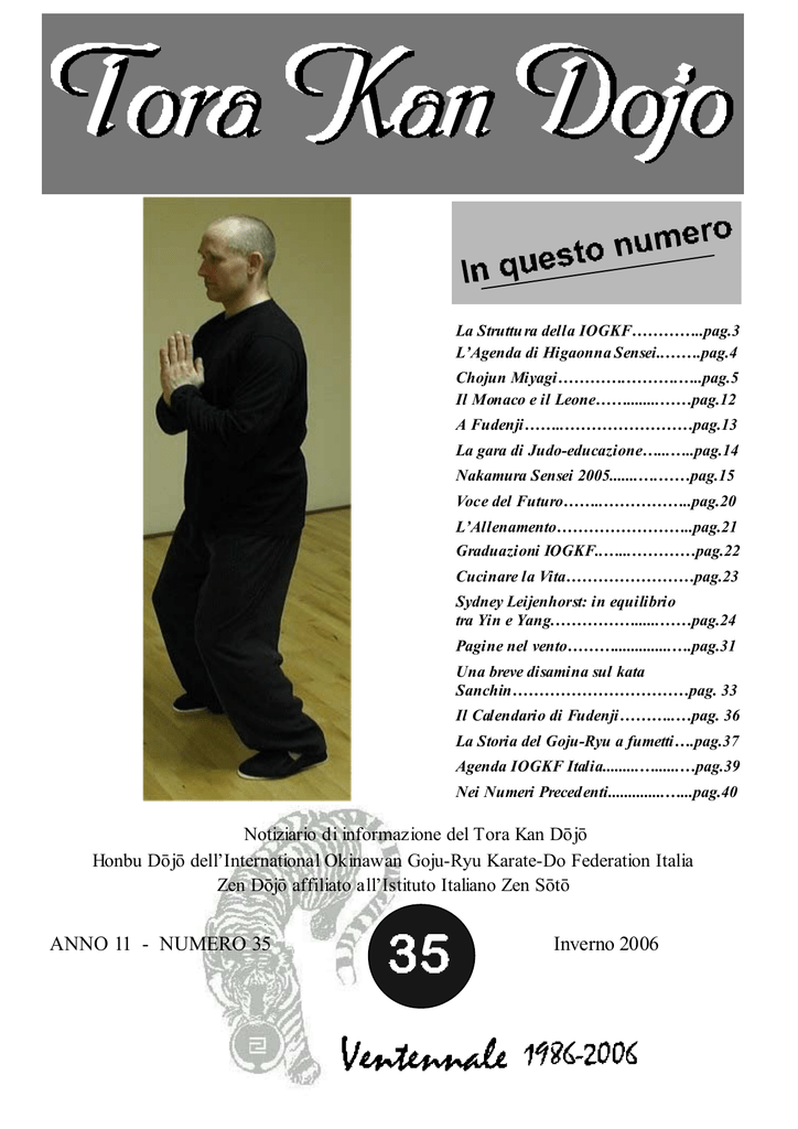 La Struttu ra della IOGKF…………..pag.3 L’Agenda di Higaonna Sensei..…….pag.4 Chojun Miyagi………….……….…..pag.5 Il Monaco e il Leone……........……pag.12 A Fudenji……..……………………pag.13 La gara di Judo-educazione…...…..pag.14 Nakamura Sensei 2005.......….……pag.15 Voce del Futuro……..……………..pag.20 L’Allenamento……………………..pag.21 Graduazioni IOGKF..…...…………pag.22 Cucinare la Vita……………………pag.23 Sydney Leijenhorst: in equilibrio tra Yin e Yang.……………......……pag.24 Pagine nel vento………..............….pag.31 Una breve disamina sul kata Sanchin……………………………pag. 33 Il Calendario di Fudenji………..…pag. 36 La Storia del Goju-Ryu a fumetti….pag.37 Agenda IOGKF Italia.........…......…pag.39 Nei Numeri Precedenti..............…...pag.40 Notiziario di informazione del Tora Kan Dōjō Honbu Dōjō dell’International Okinawan Goju-Ryu Karate-Do Federation Italia Zen Dōjō affiliato all’Istituto Italiano Zen Sōtō ANNO 11 - NUMERO 35 Inverno 2006 1 Tora Kan Dojo Anno 11° n. 35 immagine di copertina: S ydney Leijenhorst Sensei Tora Kan Dojo è il notiziario informativo dell’Associazione Tora Kan di Via di Selva Candida 49 in Roma, Honbu Dôjô dell’International Okinawan Goju-Ryu Karate-Do Federation Italia e Dôjô di pratica Zen riconosciuto dall’Istituto Zen Sôtô Shôbôzan Fudenji. E’ diffuso tra gli Allievi della scuola con cadenza stagionale con l’intento di fornire uno strumento di approfondimento culturale relativamente ad argomenti attinenti le Discipline praticate nella Scuola e ad ogni argomento di interesse comune. Ogni Allievo della Scuola e membro IOGKF Italia può contribuire alla realizzazione del notiziario con articoli, foto, traduzioni e con ogni altra possibile forma di collaborazione. Si prega di consegnare in segreteria il materiale da pubblicare nel prossimo numero entro il 28 Febbraio 2006. Paolo Taigō Spongia : Vanessa Vicentini: 42 anni, cintura nera 5° dan, Maestro Federale Fijlkam, Responsabile nazionale e Capo Istruttore I.O.G.K.F. per l’Italia. Monaco novizio Zen Sōtō. 40 anni, ingegnere, cintura nera 3° dan, insegna Karate-do presso il Dojo Scuola di Karate- Do a Roma. 32 anni, impiegata, terapista Shiatsu, cintura nera 1° dan assistente di dojo, pratica Karate-Do e Zen al Tora Kan Dojo di Roma. 23 anni, studente in ingegneria, cintura nera 1°dan, assistente di dojo, pratica Karate-Do al Tora Kan Dojo di Roma. 33 anni, cintura nera 2°dan, insegnante di Karate- Do responsabile del Dojo Karate-Do Kenkyu Kai di Cerenova. 6 anni, cintura bianca, pratica Karate- Do al Tora Kan Dojo di Roma. Jacopo Vicentini: 9 anni, cintura bianca, pratica Karate- Do al Tora Kan Dojo di Roma. Roberto Ugolini: Silvia Kōjun Arriga: Mario Arcari: Fabrizio Angelici: Valerio Proietti: Maura Garau: Hoda Youssef: Giovanni Greco: 24 anni, cintura nera 2° dan assistente di dojo, pratica Karate- Do al Tora Kan Dojo di Roma 41 anni, imprenditrice, pratica Karate-Do e Zen al Tora Kan Dojo di Roma. 26 anni, studentessa in Filosofia, cintura arancione,pratica Karate- Do e Zen al Tora Kan Dojo di Roma. 29 anni, studente in Antropologia, cintura verde, pratica Karate- Do e Zen al Tora Kan Dojo di Roma. 2 Tora Kan Dojo Anno 11° n. 35 La Struttura della I.O.G.K.F. Honorary Chairman: An’ichi Miyagi Chairman and Chief Instructor: Morio Higaonna Technical Advisors: Haruyoshi Kagawa, Eiko Miyazato, Masatake Ota Shuichi Aragaki, Hidenobu Goya, Seizen Uehara, Shotatsu Nakamoto, Daikaku Chodoin. IOGKF Honbu Dojo Higaonna Dojo 42-22-3 Chome Makishi Naha-shi Okinawa-ken 900 Japan IOGKF Administrative Office Mr. Tetsuji Nakamura Administrative Director 1055 Shawnmarr Rd Unit#9, M ississauga, Ontario L5H 3V2, Canada IOGKF Nazioni Aderenti & Capo Istruttori Argentina -Australia -Austria -Azerb aijan Republic -Bermuda -Belarus -Belgium -Canada -Chile -Czech Republic -Denmark -England -F.R. Germany -France -Georgia, Rep. of -Hong Kong -Hungary -Iceland -India -Israel -Italy -Japan -Kazakhstan -- Gustavo Tata Joe Roses Raoul Werner Walter Wogel Allahverdiev Tarverdi Aflan Bobby Smith Viktor Grinevich Patrick Curinckx Tetsuji Nakamura Rodrigo Sepulveda T. Lubomir Moucka Henrik Larsen George Andrews, Ernie Molyneux Peter Lembke Bemard Cousin Paata Chelidze Lam King Fung Ferenc Szigetvari Gretar Om Halldorsson Pervez Mistry Leon Pantanowiz Paolo Francesco Spongia Morio Higaonna Karmenov Amangeldi Mexico Moldovia Namibia Netherlands New Zeal and Norway Okinawa Peru Poland Portugal Puerto Rico Russia Scotland Singapore Slovenia South Africa Spain Sweden Tadjikistan Turkey Ukraine United States Venezuela ------------------------ Ricardo C. Olalde-Tirado Viktor Panasiuk Carl van der Merwe Sydney Leijenhorst Mark Gallagher Rune Forsberg Hansen Katsuya Yamashiro Victor de la Rosa Adam Litwinshiki Jorge Monteiro Ricarte Rivera Alexander Filimonov John Lambert Chris de Vet BogdanVukosavljevic Bakkies Laubscher Luis Nunes Bjom Jonzon Oleg Khen Fatih Ince Alexandre Grishniakov Miko Peled Shunji Sudo IOGKF ITALIA Dôjô riconosciuti Honbu Dôjô: TO RA KAN (Sensei Paolo Spongia) Via di Selva Candida 49 Roma tel. 06/61550149 Dôjô: Blue Dragon’s Club (Sensei Davide Incarbone) Via degli Estensi 219 Roma tel. 06/66151811 Dôjô: Quality Life (Sensei Arcangelo Landi) Via Bistagno 90 Roma T el. 066243274 Dôjô: Scuola di Karate -Do (Sensei Roberto Ugolini) Via del Monte della Farina 14 Roma T el. 06/68805454 Dôjô: Chojun Miyagi Dojo (Sensei Ricardo Peirano) Via Basilicata 14 Olbia T el. 0789 / 26428 Dôjô: Karate do Kenkyu Kai (Sensei Angelici Fabrizio) Technofitness, Cerenova, 3383696353 Dôjô: Sui Shin Kan (Sensei Salustri Miriam Sensei) Istituto Galilei Via Conte Verde 3394620752 Dôjô: Daruma Club (Sensei Dario Massa) c/o Break Fitness, Via Dante 58/b, Palermo 3381624897 3 Tora Kan Dojo APRILE 2006 7/9 Roma Gasshuku condotto da Sensei Sydne