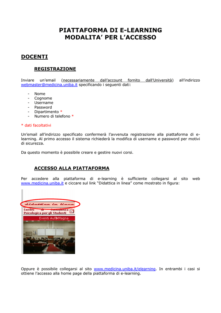 PIATTAFORMA DI E-LEARNING MODALITA’ PER L’ACCESSO DOCENTI REGISTRAZIONE Inviare un’email (necessariamente dall’account fornito [email protected] specificando i seguenti dati: - dall’Università) all’indirizzo Nome Cognome Username Password Dipartimento * Numero di telefono * * dati facoltativi Un’email all’indirizzo specificato confermerà l’avvenuta registrazione alla piattaforma di elearning. Al primo accesso il sistema richiederà la modifica di username e password per motivi di sicurezza. Da questo momento è possibile creare e gestire nuovi corsi. ACCESSO ALLA PIATTAFORMA Per accedere alla piattaforma di e-learning è sufficiente collegarsi al sito www.medicina.uniba.it e ciccare sul link “Didattica in linea” come mostrato in figura: web Oppure è possibile collegarsi al sito www.medicina.uniba.it/elearning. In entrambi i casi si ottiene l’accesso alla home page della piattaforma di e-learning. LOGIN Per effettuare il login alla piattaforma di e-learning è necessario inserire le proprie credenziali di accesso (username e password) negli appropriati campi della sezione “Login” presente in alto a destra come mostrato in figura: Dopo aver cliccato sul pulsante “Login”, se le credenziali inserite sono corrette è possibile compiere le operazioni descritte di seguito. CREAZIONE CORSI Per creare un corso è necessario entrare in una delle categorie disponibili e cliccare sul pulsante a fondo pagina “Creazione nuovo corso”. Nella schermata successiva è possibile compilare i campi relativi alle proprietà dell’esame che si sta creando. In caso di dubbi relativamente al significato di una proprietà è possibile consultare la guida in . linea cliccando sull’icona I seguenti campi non sono utilizzati pertanto si consiglia di non compilarli o lasciarli al valore di default: - Course ID Number; - Plugin iscrizione; - Tema obbligato; - Questo è un meta corso. IMPORTANTE: Una volta creato un corso sarà comunque possibile modificare queste impostazioni cliccando sul nome del corso desiderato dalla propria pagina principale (ossia quella che appare dopo il login intitolata “I miei corsi”) e seguendo il link “Impostazioni” dal menù “Amministrazione” in basso a sinistra come mostrato in figura: Per tornare alla pagina principale suddetta ovunque ci si trovi all’interno della piattaforma, è sufficiente cliccare sul link “E-Learning” presente sempre in alto a sinistra. In generale per muoversi a ritroso all’interno della piattaforma è consigliabile sempre usare i link in alto a sinistra e mai i pulsanti forniti dal proprio browser. Dopo aver cliccato su “Salva Modifiche” (in fondo alla pagina) e quindi su “Continua” il sistema visualizzerà la pagina principale del corso appena creato. INSERIMENTO CONTENUTI Per inserire i contenuti in un corso è necessario dapprima attivare la modifica del corso cliccando il pulsante “Attiva Modifica” in alto a destra. A questo punto è possibile modificare uno dei blocchi disponibili (in base all’impostazione “Formato” scelta in fase di creazione del corso). Per aggiungere un file (diapositive, collegamento a pagina web, file di testo word, excel e quant’altro) è necessario selezionare “Aggiungi Risorse” e scegliere “Collegamento a un file o a un sito” dall’elenco a discesa. In questa pagina si può inserire un nome e un’introduzione che identificano il file da inserire (ad esempio “Lezione del…”). Per caricare il file è necessario cliccare il pulsante “Scegli o aggiorna file”. Nella pagina ora visualizzata è possibile creare una o più cartelle per organizzare i file caricati o caricare direttamente i file. Per creare una cartella cliccare su “Crea una cartella” quindi inserire il nome e quindi cliccare su “Crea”. Quindi selezionare la cartella creata e scegliere “Trasferisci un file sul server”. Con il pulsante “Sfoglia” è possibile visualizzare il contenuto del proprio computer al fine di selezionare il file che si desidera trasferire. A questo punto cliccando su “Trasferisci questo file” il file trasferito verrà visualizzato nella cartella. Infine per aggiungere il file nel corso sarà sufficiente cliccare su “scegli” a destra del file desiderato. Scegliendo “Salva modifiche” il file viene visualizzato e attraverso i link in alto a sinistra è possibile tornare alla pagina principale del corso e vedere il risultato del trasferimento dopo aver cliccato su “Termina Modifica” in alto a destra. IMPORTANTE: alcuni tipi di file (quali pdf o diapositive Power Point) potrebbero non essere visualizzati a causa dei criteri di protezione presenti sul proprio pc. Il file sarà comunque visualizzabile dagli utenti. MODIFICA CONTENUTI Per modificare un contenuto inserito, scegliere “Attiva Modifica” in alto a destra nella pagina principale del corso, quindi cliccare su uno dei seguenti pulsanti in corrispondenza del contenuto desiderato: aumenta il rientro del contenuto (equivalente ad inserire una tabulazione). diminuisce il rientro del contenuto (equivalente a eliminare una tabulazione). muove il contenuto. Dopo aver selezionato questo pulsante cliccare sui riquadri per spostare il contenuto nella posizione indicata dal riquadro stesso. permette di modificare il contenuto. elimina il contenuto. rende invisibile agli studenti il contenuto (utile in caso di prove). INSERIMENTO ESAME Attraverso la piattaforma di e-learning è possibile gestire gli esami e le prenotazioni. Per inserire un esame scegliere “Attiva Modifica” in alto a destra nella pagina principale del corso, quindi in corrispondenza del blocco in cui si vuole inserire l’esame scegliere “Aggiungi Attività” quindi “Prenotazione” dall’elenco a discesa. Nella pagina visualizzata è possibile impostare le proprietà dell’esame. Si consiglia di non compilare o lasciare il valore di default alle seguenti impostazioni: - Valutazione; - Docenti. Per salvare