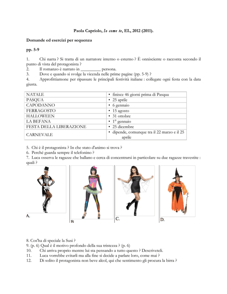 Paola Capriolo, Io come te, EL, 2012 (2011). Domande ed esercizi per sequenza pp. 5-9 1. Chi narra ? Si tratta di un narratore interno o esterno ? È onnisciente o racconta secondo il punto di vista del protagonista ? 2. Il romanzo è narrato in _________ persona. 3. Dove e quando si svolge la vicenda nelle prime pagine (pp. 5-9) ? 4. Approfittiamone per ripassare le principali festività italiane : collegate ogni festa con la data giusta. NATALE PASQUA CAPODANNO FERRAGOSTO HALLOWEEN LA BEFANA FESTA DELLA LIBERAZIONE CARNEVALE • • • • • • • • finisce 46 giorni prima di Pasqua 25 aprile 6 gennaio 15 agosto 31 ottobre 1° gennaio 25 dicembre dipende, comunque tra il 22 marzo e il 25 aprile 5. Chi è il protagonista ? In che stato d'animo si trova ? 6. Perché guarda sempre il telefonino ? 7. Luca osserva le ragazze che ballano e cerca di concentrarsi in particolare su due ragazze travestite : quali ? 8. Cos'ha di speciale la Susi ? 9. (p. 6) Qual è il motivo profondo della sua tristezza ? (p. 6) 10. Chi arriva proprio mentre lui sta pensando a tutto questo ? Descriveteli. 11. Luca vorrebbe evitarli ma alla fine si decide a parlare loro, come mai ? 12. Di solito il protagonista non beve alcol, qui che sentimento gli procura la birra ? 13. Di cosa parlano i bulli e in che termini ? 14. (p. 8) « chissà, forse i suoi nuovi amici sono meglio informati e hanno le loro buone ragioni per averli così in antipatìa ». Commentate. 15. Dove si recano (recarsi = se rendre) poi tutti insieme ? Raccontate cosa succede. Date un titolo a questa prima sequenza : _____________________________________________ pp. 9-11 1. 2. 3. 4. Cosa succede dal momento in cui i ragazzi entrano nel parco ? Cosa vede Luca ? Come viene definita la figura umana ? Qual è la reazione dei ragazzi di fronte alla figura in fiamme ? E quella di Luca ? Dite cosa pensate della reazione di Luca. pp. 11-16 5. Spiegate i vari sentimenti provati da Luca la mattina seguente. 6. (p. 11) Elencate le tre possibilità « che si affacciano alla mente di Luca ». Cominciate così : Invece di scappare Luca avrebbe potuto… 7. Cosa fa Luca da quando si alza a quando si mette davanti al computer ? Elenca le attività (attenzione ai verbi riflessivi !) 8. Completare la tabella con i dati trovati in rete da Luca (p.13) : chi in che condizioni causa dove si trova prognosi 7. Scoperta questa cosa, Luca vuole chiamare la Susi ma poi rinuncia, come mai ? 8. Cosa decide di fare per finire ? 9. Completa. Ogni giorno va al policlinico. Ci va in __________________ appena finita _____________________. Ogni volta spera ________________________. Non riesce più a _______________________ . 10. (p.15) « Ecco avevo proprio ragione. Guarda che disastro hai combinato, ho fatto bene a non fidarmi di un tipo del genere ». Queste sono parole che ha pronunciato la Susi che ha detto Luca che Luca immagina che la Susi dica che la Susi pensa g. h. Che cosa succede di speciale il quinto giorno ? Perché vorrebbe scappar via il ragazzo ? pp. 16-19 La visita 1. Entrato nella stanza Luca raccoglie altre informazioni sull'uomo : Nome Nazionalità Età 2. Un cingalese viene dallo Sri Lanka : e... dove si trova lo Sri Lanka ? 3. 4. 5. Come si svolge il loro primo incontro ? Che sentimenti prova Luca ? Cosa racconta Luca a Rajiva per giustificare la sua presenza all’ospedale ? E' vero che «piangere non è da maschio » ? (p.19) pp. 19-22 1. Dopo la prima conversazione avuta con Rajiva, sembra che tutto ridiventi normale. Le giornate trascorrono ___________________ . Ha l'impressione di aver fatto il suo ______________________ e che ora abbia la ___________________ in pace. Cosicché al cingalese non pensa più. Ma un incontro fortuito cambia tutto questo, come ? 2. A scuola come va ? 3. Che cosa fa paura al ragazzo ? 4. Che cosa si chiede a proposito del cingalese ? 5. (p. 21) Spiegate l'episodio della mendicante e dite perché è importante. Il ragazzo dove va immediatamente dopo ? pp. 22-25 La seconda visita. 1. Che cosa fa per campare Rajiva ? 2. Perché è preoccupato per la sua famiglia ? Da quanto tempo non vede sua moglie e i suoi figli ? 3. Che cosa pensava Luca dei venditori di rose finora ? Che sentimento provoca in lui pensarci ? 4. Come potrebbe aiutare Rajiva ? 5. Qual è la filosofia di vita di Rajiva ? Cosa ne pensa il ragazzo ? Può pensarla in questo modo anche lui ? pp. 25-27 1. Che sentimento prova Luca uscendo dalla camera di Rajiva ? Perché ? 2. Luca si rivolge all'infermiera per essere rassicurato ma lei che cosa gli dice invece ? 3. (p. 27) « Quel che è fatto è fatto, ma al presente e al futuro si può sempre trovare un rimedio o almeno si può provarci. » Spiegate questa frase con parole vostre poi dite quale soluzione trova Luca. 4. Perché manda un messaggino alla Susi ? Cosa le scrive ? p. 28-30 1. Come fanno i cingalesi a procurarsi le rose ? Cita le tre ipotesi formulate dagli altri ragazzi. Quale sembra la più convincente a Luca ? 2. Come farà il ragazzo ad assomigliare ad un cingalese quando venderà le rose ? Descrivete il suo travestimento (=déguisement). 3. (p. 28) « Se poi si mettesse in faccia un po’ di quella roba che usano le ragazze, fondotinta o come diavolo si chiama ». Chi parla ? 4. A che categoria sociale appartiene la famiglia di Luca ? Da cosa lo deducete (in questo passo e altrove) ? 5. Ulteriore messaggio alla Susi. Spiegatelo. pp. 30-34 1. Dove si trova il protagonista all’inizio di questa sequenza ? 2. Perché Luca chiede un imballaggio regalo per il fondotinta che compra ? 3. Spiega cosa fa il ragazzo dal momento dell’acquisto a quando va dal fioraio. Quanto tempo trascorre ? 4. (p. 32) « Ma chi è ? pensa di nuovo, e a un tratto quello spettacolo non lo diverte più. » Spiegate questa frase. 5. Che relazione c’è tra Luca e il fioraio ? Come reagisce l’uomo al progetto del ragazzo ? pp. 35-39 1. Quale malinteso vive Luca alla sua prima apparizione di venditore di rose ? 2. Oltre ch