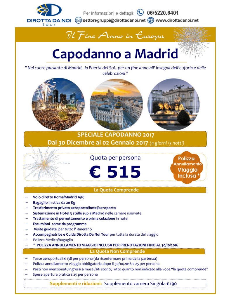 Il Fine Anno in Europa Capodanno a Madrid " Nel cuore pulsante di Madrid, la Puerta del Sol, per un fine anno all' insegna dell’euforia e delle celebrazioni " SPECIALE CAPODANNO 2017 Dal 30 Dicembre al 02 Gennaio 2017 (4 giorni /3 notti) Quota per persona € 515 La Quota Comprende ∼ ∼ ∼ ∼ ∼ ∼ ∼ ∼ ∼ ∼ Volo diretto Roma/Madrid A/R; Bagaglio in stiva da 20 Kg Trasferimento privato aeroporto/hotel/aeroporto Sistemazione in Hotel 3 stelle sup a Madrid nelle camere riservate Trattamento di pernottamento e prima colazione in hotel Escursioni come da programma Visite guidate per tutto l' itinerario Accompagnatrice e Guida Dirotta Da Noi Tour per tutta la durata del viaggio Polizza Medico/bagaglio * POLIZZA ANNULLAMENTO VIAGGIO INCLUSA PER PRENOTAZIONI FINO AL 30/10/2016 La Quota Non Comprende ∼ ∼ ∼ ∼ Tasse aeroportuali € 138 per persona (da riconfermare prima della partenza) Polizza annullamento viaggio obbligatoria dopo il 30/10/2016 € 25 per persona Pasti non menzionati;Ingressi a musei/siti storici;Tutto quanto non indicato alla voce “la quota comprende” Spese apertura pratica € 25 per persona Supplementi e riduzioni: Supplemento camera Singola € 190 Itinerario di Viaggio 1° giorno: ROMA – MADRID Appuntamento con i partecipanti all’aeroporto Leonardo da Vinci di Roma Fiumicino - Disbrigo delle formalità d’imbarco e partenza con volo diretto per Madrid – Trasferimento privato in hotel – Arrivo e sistemazione nelle camere riservate - Nel pomeriggio visita della città con una panoramica che ci condurrà alla scoperta della città monumentale e dei grandi viali – Potremo ammirare la nuova Madrid con i suoi grattacieli, il mitico stadio Santiago Bernabeu, il Paseo della Castellana, il Paseo del Prado con le famose fontane di Nettunoe di Cibele - Cena libera e rientro in hotel per il pernottamento 2° giorno: MADRID Prima colazione in hotel – In mattinata potremo raggiungere il cuore monumentale di Madrid – Inizieremo dalla Plaza de Opera su cui sorge il Teatro Real e proseguiremo sulla splendida Plaza de Oriente su cui si affaccia il Palacio Real – Raggiungeremo poi la deliziosa Plaza de la Villa circondata da superbi edifici rinascimentali come l’Ayuntamento, la Torre de los Lujanes e la Casa de Cisneros – La nostra meta finale sarà la monumentale e scenografica Plaza Mayor con la Casa de la Panaderia ed i suoi portici colorati e pieni di vita – Passando sotto l’Arco de Cuchilleros si entra nella via omonima, fiancheggiata da antiche abitazioni e dove si trovano mesones e bar de tapas – Pranzo libero – Rientro in hotel – Possibilità di prenotare la cena del 31 Dicembre in un locale caratteristico al centro della città a base di paella e tapas innaffiate da un buon vino – Una passeggiata ci condurrà finalmente alla Puerta del Sol che farà da scenario al più atteso veglione di San Silvestro spagnolo – L’orologio della Casa de Correos è il protagonista di un antico e sentito rito di capodanno – Sono infatti i suoi dodici rintocchi, uno per ciascun mese dell’anno, ad accompagnare l’arrivo del Nuovo Anno, mentre migliaia di madrileni e di turisti, mangiano i dodici chicchi d’uva previsti dalla tradizione, mentre la diretta tv trasmette in tutta la nazione – E via poi con la festa tra luci, suoni e fuochi d’artificio ! - Rientro in hotel e pernottamento 3° giorno: MADRID Prima colazione in hotel – In tarda mattinata raggiungeremo Plaza de Oriente per la visita di Palazzo Reale – Questo imponente complesso architettonico fu costruito dai Borbone e fu residenza ufficiale della famiglia fino al 1931 – Il palazzo si affaccia sui bellissimi e panoramici giardini di Campo del Moro e spicca nel paesaggio per la sua pietra bianca e la sua possente architettura – La visita degli interni vi affascinerà per la loro grandiosità e ricchezza di capolavori – La Sala del trono è tappezzata di velluto rosso che esalta lo splendido soffitto affrescato dal Tiepolo e la Sala della musica custodisce alcuni preziosi stradivari - Piccolo gioiello è l’Antica Farmacia con i suoi laboratori e vasi preziosi – Pranzo libero – Nel pomeriggio tempo a disposizione per una passeggiata alla scoperta di angoli suggestivi e per una sosta pomeridiana irrinunciabile, la “Chocolateria San Gines” per gustare un vero mito madrileno: i “churros y chocolate” più famosi di Spagna – Rientro in hotel e cena libera - Pernottamento 4° giorno: MADRID - ROMA Prima colazione in hotel – Mattinata a disposizione per attività individuali e per gli ultimi acquisti – Visita del Museo del Prado per chi ama l’arte classica con i capolavori di Tiziano, Rubens, Velasquez e Goya – Per chi preferisce invece l’arte moderna, il Museo de arte Reina Sofia che custodisce capolavori quali il famoso “Guernica” di Pablo Picasso - Pranzo libero e rientro in hotel per il trasferimento in aeroporto - Disbrigo delle formalità d’imbarco e partenza con volo diretto per Roma con arrivo previsto in serata OPERATIVO VOLI (soggetto a riconferma) Andata Ritorno 30 Dicembre: ROMA FCO/MADRID 02 Gennaio: MADRID/ ROMA CFC H 10,45 – 12,55 H 14,50 – 16,50 HOTEL MAPPA ITINERARIO Hotel 3* a Madrid: Ottimo hotel in posizione strategica vicino alle maggiori attrazioni della città Prestige tour srl - Via Mar della Cina, 183 - 00144 Roma 1)Per motivi organizzativi l’ordine delle visite potrebbe essere modificato mantenendo inalterato il contenuto del viaggio 2) Problemi alimentari vanno segnalati all’atto della prenotazione. Sarà nostra cura ottenere la disponibilità dai ristoratori 3) La classificazione alberghiera è rapportata ai valori Nazionali. Nel caso in cui non fosse espressa la categoria della struttura, la classificazione verrà attribuita secondo i criteri della Dirotta Da Noi Tour. 4) Nel caso di mancato raggi.to di min.35 partecipanti, la DIROTTA DA NOI si riserva la possibilità di rivalutare la quota/annullare il v