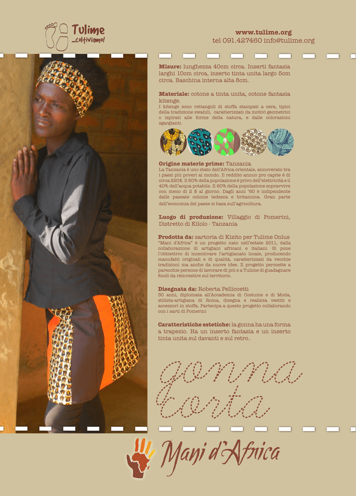 www.tulime.org tel 091.427460 [email protected] Misure: lunghezza 40cm circa. Inserti fantasia larghi 10cm circa, inserto tinta unita largo 5cm circa. Baschina interna alta 8cm. Materiale: cotone a tinta unita, cotone fantasia kitenge. I kitenge sono rettangoli di stoffa stampati a cera, tipici della tradizione swahili, caratterizzati da motivi geometrici o ispirati alle forme della natura, e dalle colorazioni sgargianti. Origine materie prime: Tanzania La Tanzania è uno stato dell’Africa orientale, annoverato tra i paesi più poveri al mondo. Il reddito annuo pro capite è di circa 220$. Il 60% della popolazione è privo dell’elettricità e il 40% dell’acqua potabile. Il 60% della popolazione sopravvive con meno di 2 $ al giorno. Dagli anni ’60 è indipendente dalle passate colonie tedesca e britannica. Gran parte dell’economia del paese si basa sull’agricoltura. Luogo di produzione: Villaggio di Pomerini, Distretto di Kilolo - Tanzania Prodotta da: sartoria di Kizito per Tulime Onlus “Mani d’Africa” è un progetto nato nell’estate 2011, dalla collaborazione di artigiani africani e italiani. Si pone l’obbiettivo di incentivare l’artigianato locale, producendo manufatti originali e di qualità, caratterizzati da vecchie tradizioni ma anche da nuove idee. Il progetto permette a parecchie persone di lavorare di più e a Tulime di guadagnare fondi da reinvestire sul territorio. Disegnata da: Roberta Pelliccetti 30 anni, diplomata all’Accademia di Costume e di Moda, stilista-artigiana di Roma, disegna e realizza vestiti e accessori in stoffa. Partecipa a questo progetto collaborando con i sarti di Pomerini Caratteristiche estetiche: la gonna ha una forma a trapezio. Ha un inserto fantasia e un inserto tinta unita sul davanti e sul retro.. Mani d Africa un progetto di Mani d Africa un progetto di Mani d Africa un progetto di Mani d Africa un progetto di Mani d Africa un progetto di Mani d Africa un progetto di Mani d Africa un progetto di Mani d Africa un progetto di gonna corta
