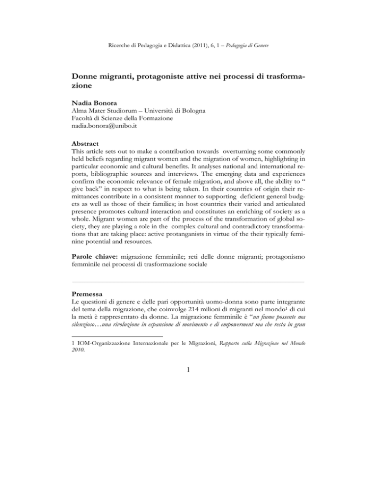 Ricerche di Pedagogia e Didattica (2011), 6, 1 – Pedagogia di Genere Donne migranti, protagoniste attive nei processi di trasformazione Nadia Bonora Alma Mater Studiorum – Università di Bologna Facoltà di Scienze della Formazione [email protected] Abstract This article sets out to make a contribution towards overturning some commonly held beliefs regarding migrant women and the migration of women, highlighting in particular economic and cultural benefits. It analyses national and international reports, bibliographic sources and interviews. The emerging data and experiences confirm the economic relevance of female migration, and above all, the ability to “ give back” in respect to what is being taken. In their countries of origin their remittances contribute in a consistent manner to supporting deficient general budgets as well as those of their families; in host countries their varied and articulated presence promotes cultural interaction and constitutes an enriching of society as a whole. Migrant women are part of the process of the transformation of global society, they are playing a role in the complex cultural and contradictory transformations that are taking place: active protanganists in virtue of the their typically feminine potential and resources. Parole chiave: migrazione femminile; reti delle donne migranti; protagonismo femminile nei processi di trasformazione sociale _____________________________________________________________ Premessa Le questioni di genere e delle pari opportunità uomo-donna sono parte integrante del tema della migrazione, che coinvolge 214 milioni di migranti nel mondo1 di cui la metà è rappresentato da donne. La migrazione femminile è “un fiume possente ma silenzioso…una rivoluzione in espansione di movimento e di empowerment ma che resta in gran 1 IOM-Organizzazione Internazionale per le Migrazioni, Rapporto sulla Migrazione nel Mondo 2010. 1 parte silenziosa”2; tuttavia, se la migrazione internazionale per lungo tempo ha ottenuto poche attenzioni, quella femminile ne ha ricevute ancora meno. Il dibattito pubblico sulle donne immigrate è impreciso e a volte contradditorio. Persiste l'invisibilità delle donne migranti anche nelle discussioni politiche dell’Unione Europea dove l’argomento è trattato in sede separata e rivolto, in particolare, al riconoscimento della discriminazione e alla promozione dei principi di eguaglianza nella fruizione di diritti di partecipazione civica, e nell’utilizzo delle loro potenzialità occupazionali; sebbene siano state avviate un certo numero di azioni politiche in vari settori della società, mirate alla tutela dei diritti fondamentali delle donne migranti, l’accesso alla vita pubblica, politica ed economica rimane limitato, come sottolinea la stessa Assemblea Parlamentare3. Significative di una nuova attenzione sono alcune prese di posizione comunitarie: “L'Assemblea è preoccupata per la situazione delle donne immigrate, un gran numero delle quali vive ai margini della società, di fronte a difficoltà più gravi di quelle degli uomini immigrati”. Alle donne è riconosciuto un ruolo cruciale per il processo di integrazione: “Le donne che per lungo tempo sono state le figure invisibili dell'immigrazione, ignorate dall'autorità pubbliche, devono essere poste al centro del processo di integrazione”, mentre si auspica la presenza delle voci delle donne immigrate nel dibattito sull'integrazione di genere: “L'Assemblea Parlamentare sottolinea che l'accesso delle donne immigrate alla vita pubblica, politica ed economica rimane limitata”4. I primi studi sulla migrazione femminile, sviluppatisi negli Stati Uniti a partire dal XX secolo, hanno peraltro fornito un’immagine di donna migrante come passiva, arretrata, subalterna, dipendente e sottomessa alla tradizione dalla quale, però, in virtù dell'esperienza migratoria e del nuovo contesto sociale di accoglienza potrebbe liberarsi. In Europa, le ricerche sulle migrazioni sono apparse più tardi e, fino al 1970, non hanno né visto né preso in considerazione il fenomeno della migrazione femminile quale uno dei fattori caratterizzanti la nuova realtà5. A seguito delle mutate politiche migratorie in Europa, appare sulla scena socioculturale qualche interesse per le donne migranti e le loro condizioni; le ricerche sulla femminilizzazione dei processi migratori, però, caratterizzate da un persisten- 2 Tratto dal Rapporto UNFPA del 2006. L’United Nations Population Fund è stato istituito nel 1969, è l’organo centrale per le questioni concernenti la popolazione in seno al sistema delle Nazioni Unite. 3 Progetto Gemma-Gender&Migration, Politiche europee in ambito di Genere e Migrazione, 30 Giugno 2008, www.gemmaproject.eu. 4 Tutte le frasi riportate sono tratte da: Resolution 1478 (2006) of the Parliamentary Assembly of the Council of Europe. 5 Gli Stati europei hanno a lungo rifiutato di definirsi paesi di immigrazione e hanno considerato la migrazione un fenomeno temporaneo, ritenendo che lo scopo finale del percorso migratorio fosse l’assimilazione o il rientro. 2 te disinteresse, sono circoscritte ad ambiti di studio abbastanza limitati6. Solo dagli anni Settanta si iniziano a pubblicare studi sistematici riferiti alle donne presenti nei flussi migratori come popolazione specifica: nelle ricerche si utilizzano nuove categorie interpretative che, tenendo conto del punto di vista delle comunità immigrate e degli studi di genere, fanno emergere dall'invisibilità la donna immigrata. Quest’ultima da vittima passiva diventa attore sociale con ruoli e funzioni importanti7. I concetti di genere, etnia e classe consentono nuovi sguardi e originali chiavi di lettura per la ricerca sui fenomeni migratori e i contesti generati dalle migrazioni internazionali, sul tema della discriminazione e dell’esclusione sociale e dei reticoli formali e informali che coinvolgono anche le migranti. Lo studio delle migrazioni affrontato dal pun
