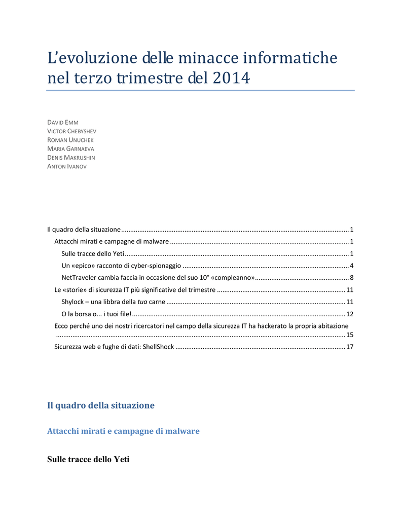 L’evoluzione delle minacce informatiche nel terzo trimestre del 2014 DAVID EMM VICTOR CHEBYSHEV ROMAN UNUCHEK MARIA GARNAEVA DENIS MAKRUSHIN ANTON IVANOV Il quadro della situazione .............................................................................................................................. 1 Attacchi mirati e campagne di malware ................................................................................................... 1 Sulle tracce dello Yeti ............................................................................................................................ 1 Un «epico» racconto di cyber-spionaggio ............................................................................................ 4 NetTraveler cambia faccia in occasione del suo 10° «compleanno» .................................................... 8 Le «storie» di sicurezza IT più significative del trimestre ....................................................................... 11 Shylock – una libbra della tua carne ................................................................................................... 11 O la borsa o... i tuoi file! ...................................................................................................................... 12 Ecco perché uno dei nostri ricercatori nel campo della sicurezza IT ha hackerato la propria abitazione ................................................................................................................................................................ 15 Sicurezza web e fughe di dati: ShellShock .............................................................................................. 17 Il quadro della situazione Attacchi mirati e campagne di malware Sulle tracce dello Yeti Nello scorso mese di luglio è stata da noi pubblicata un'approfondita analisi, eseguita dal Global Research and Analysis Team (GReAT) di Kaspersky Lab, riguardo a un'estesa campagna di attacchi informatici mirati, da noi soprannominata “Crouching Yeti” (tale appellativo può essere tradotto in italiano come "lo Yeti acquattato", pronto per balzare all'attacco). La campagna di cyber-spionaggio in questione è ugualmente conosciuta con il nome di “Energetic Bear” (l'espressione inglese significa, letteralmente, "orso energico, attivo"), poiché i ricercatori dell'azienda di cybersecurity CrowdStrike hanno lasciato intendere che i responsabili degli attacchi informatici condotti fossero geograficamente ubicati in Russia (riteniamo, da parte nostra, che non vi siano elementi o prove sufficienti per poter confermare, in un modo o nell'altro, quanto asserito da CrowdStrike a tal proposito). La campagna Crouching Yeti, il cui inizio risale addirittura alla fine dell'anno 2010, ha sinora preso di mira i seguenti settori: industria/macchinari, manifatturiero, farmaceutico, costruzioni, istruzione e Information Technology (IT). Per il momento, il numero totale delle vittime accertate è di oltre 2.800 in tutto il mondo; tra di esse, i ricercatori di Kaspersky Lab hanno identificato ben 101 diverse organizzazioni, situate, principalmente, sul territorio di Stati Uniti, Spagna, Giappone, Germania, Francia, Italia, Turchia, Irlanda, Polonia e Cina. L'attuale lista delle vittime sembra proprio indicare che criminali che si celano dietro le quinte della campagna Crouching Yeti stiano perseguendo chiari obiettivi strategici. Gli aggressori, tuttavia, hanno ugualmente dimostrato uno specifico interesse, peraltro non così ovvio, nei confronti di determinate istituzioni. Gli esperti di Kaspersky Lab ritengono che potrebbe trattarsi, in questo caso, di vittime collaterali, per cui potrebbe essere più opportuno considerare Crouching Yeti non alla stregua di una campagna che mira a specifiche aree di interesse, bensì come una campagna di cyberspionaggio dai contorni decisamente più ampi, la quale rivolge il proprio interesse a svariati settori. Per infiltrarsi all'interno dei computer appartenenti alle vittime designate, i cybercriminali che si nascondono dietro a tali attacchi mirati si avvalgono di varie tipologie di malware (si tratta, nella fattispecie, di software e tool nocivi appositamente creati e sviluppati per infettare i sistemi informatici provvisti di sistema operativo Windows). Il preciso obiettivo della campagna è quello di estendere progressivamente il proprio raggio d'azione all'interno delle organizzazioni ed istituzioni bersagliate, allo scopo di realizzare il furto di dati sensibili e confidenziali, incluso la proprietà intellettuale ed altre importanti informazioni di natura strategica. I computer compromessi dai suddetti software e strumenti nocivi si connettono poi ad una vasta rete di siti web violati, i quali ospitano vari moduli di malware aggiuntivi, custodiscono informazioni sulle vittime di Crouching Yeti e smistano comandi ai sistemi infetti. Al fine di generare l'infezione informatica sui computer sottoposti ad attacco, gli aggressori fanno affidamento su tre diversi metodi. Essi ricorrono, in primo luogo, ad un installer di software del tutto legittimo, appositamente riprogettato per includere, allo stesso tempo, un file DLL dannoso. File archivio del genere, autoestraenti e debitamente modificati, possono essere, di fatto, caricati direttamente su un server compromesso, oppure, in alternativa, possono essere direttamente inviati, tramite e-mail, a qualcuno che opera ed agisce all'interno dell'organizzazione presa di mira. In secondo luogo, i criminali si avvalgono della pratica dello spear-phishing, allo scopo di recapitare nelle e-mail box delle potenziali vittime un file XDP (XML Data Package) maligno, contenente un exploit Flash (CVE-2011-0611). In terzo luogo, infine, gli aggressori utilizzano attacchi informatici di tipo "water-hole" (che significa letteralmente, in lingua inglese, “pozza d’acqua", o "abbeveratoio"). Nello specifico, il termine “watering-hole” viene applicato ad un sito web che