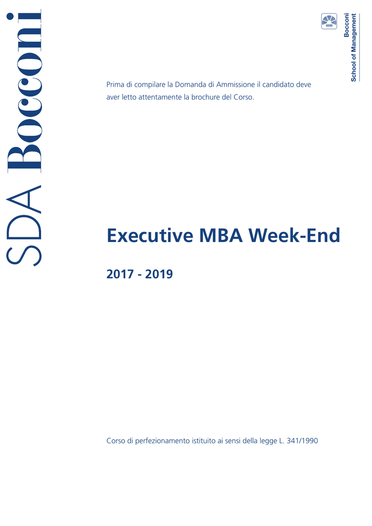 Prima di compilare la Domanda di Ammissione il candidato deve aver letto attentamente la brochure del Corso. Executive MBA Week-End 2017 - 2019 Corso di perfezionamento istituito ai sensi della legge L. 341/1990 Informazioni generali Il corso ha inizio a maggio 2017 (online tutorials da aprile 2017) e termina a marzo 2019. E’ possibile inviare la Domanda di Ammissione a partire da luglio 2016 entro la scadenza del 1 febbraio 2017. Si può inviare preliminarmente la domanda di ammissione e completarla in seguito con i documenti richiesti. Il processo e le fasi di selezione Il processo di selezione avviene nel periodo settembre 2016-marzo 2017. Al ricevimento della domanda di ammissione la Scuola procede ad una preselezione e contatterà i candidati per informarli sull’idoneità a proseguire il processo di selezione. Nel corso del processo di selezione la Scuola valuta le candidature e assegna alcune borse di studio/esoneri ai candidati meritevoli che hanno presentato regolare richiesta al bando. In generale l’intero processo di valutazione dura fino a 8 settimane dal completamento di tutte le prove. I candidati ammessi al Corso dovranno confermare la loro partecipazione entro i termini indicati dall’Admissions Service. Il risultato sarà comunicato per iscritto a tutti i candidati. Requisiti di ammissione Sono requisiti essenziali per l’ammissione: • laurea in qualsiasi disciplina o titolo di studio equivalente riconosciuto da SDA Bocconi; • forte motivazione allo studio; • significativa esperienza di lavoro (minimo 5-6 anni); • buona conoscenza della lingua inglese; • elevate potenzialità di sviluppo. Sono considerati elementi decisivi: la capacità di relazione, l’attitudine al lavoro di gruppo, le doti di leadership, la maturità individuale e in genere tutte le caratteristiche personali che si armonizzino con il corso. Test di conoscenza della lingua inglese I candidati devono possedere una buona conoscenza della lingua Inglese. La Scuola richiede pertanto ai candidati di sostenere il test TOEFL o IELTS o PTE Academic o CAE. In sede di test andrà specificato il codice della Scuola (0698 per Toefl o R7G-6R-23 per PTE Academic); in questo modo il nostro Admissions Service potrà ricevere direttamente i risultati dell’esame. I candidati che abbiano già sostenuto il test devono comunque far pervenire alla Scuola l’originale. Per informazioni e per iscriversi al test: TOEFL: www.TOEFL.org IELTS: www.IELTS.org PTE Academic: www.pearsonpte.com CAE: www.cambridgeenglish.org/cae La documentazione di conoscenza della lingua inglese può essere prodotta durante il processo di selezione anche in fase successiva rispetto all’invio della domanda di ammissione e comunque non oltre la data di inizio del programma (maggio 2017). Possono essere esonerati dal Test i candidati madrelingua inglese o i candidati che abbiano conseguito un titolo di studio universitario in inglese o che possano documentare significativa esperienza professionale in un paese di lingua anglofona o in un contesto aziendale in cui l’inglese sia la lingua ufficialmente utilizzata. Domanda dell’azienda promotrice Deve essere compilata da un esponente aziendale, utilizzando l’apposito modulo disponibile sul nostro sito, solo qualora l’azienda stessa intenda promuovere la partecipazione al Corso di un candidato attraverso il finanziamento parziale o totale della quota di iscrizione. Domanda di ammissione Copia del passaporto o di un documento di identità È disponibile unicamente online. È necessario completarla in modo accurato per fornire informazioni sulle esperienze personali e professionali, sulla motivazione al Corso e altri aspetti della personalità. La domanda di ammissione va corredata di: Curriculum vitae e fototessera Da allegare all’application online. Certificato di laurea È richiesto un documento che attesti chiaramente il tipo di laurea, la data del conseguimento, le votazioni conseguite nei singoli esami e la scala di riferimento. Per i candidati con laurea conseguita in Italia il documento deve essere obbligatoriamente presentato in formato di autocertificazione: sono accettati tutti i certificati di laurea ad esclusione di quelli riportanti in calce la dicitura “Il presente certificato non può essere prodotto agli organi della pubblica amministrazione o ai privati gestori di pubblici servizi”. Questa autocertificazione è richiesta solo ai candidati laureati in un’università italiana. Pagamento della procedura di selezione La quota di Euro 150 copre le spese procedurali. Si prega di compilare il Modulo di Pagamento della procedura di ammissione indicando la modalità di pagamento scelta. Questa somma non è rimborsabile. Prove di selezione Il risultato della selezione Al ricevimento della domanda di ammissione la Scuola effettua una preselezione sulla base della documentazione inviata. Successivamente, Il Comitato Ammissioni comunica al candidato l’idoneità o meno a proseguire il processo di selezione. Il candidato che avrà superato la preselezione dovrà quindi sostenere le prove: Test SDA o GMAT e un colloquio individuale: Una volta completato il processo di selezione l’Admissions Service comunicherà, per iscritto, il risultato al candidato, sia in caso di esito positivo che negativo. In nessun caso l’Admissions Service comunicherà l’esito della selezione telefonicamente. • Test SDA, in lingua italiana, è organizzato da SDA Bocconi. Si tratta di un test attitudinale che mira a valutare capacità logiche, verbali e di ragionamento numerico e che non richiede preparazione specifica. In alternativa: • GMAT, in lingua inglese, è un test internazionalmente riconosciuto che consente la verifica delle competenze di tipo quantitativo, verbale e analitico. L’ultima data valida per l’ammissione all’edizione 2017/19 del corso EMBAWE è febbraio 2017, in sede di test andrà specificato il nome della Scuola; in questo modo il nostro Admissions Service