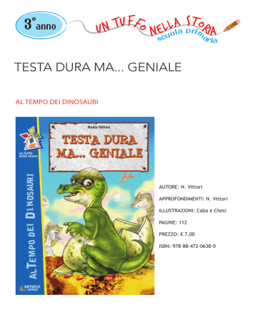 FF U T UN O 3° anno S T O A L R L p r E IA i a m N l scu o ar ia TESTA DURA MA... GENIALE AL TEMPO DEI DINOSAURI AUTORE: N. Vittori APPROFONDIMENTI: N. Vittori ILLUSTRAZIONI: Caba e Chesi PAGINE: 112 PREZZO: € 7,00 ISBN: 978-88-472-0638-0 p n e di a m to i a d d e n p r ofo Sch L'AUTRICE NADIA VITTORI Vive in provincia di Cremona. Insegnante di Scuola Primaria, è esperta di Narrativa storica per ragazzi e ha già pubblicato vari romanzi. Autrice di tutti i racconti della serie Un tuffo nella storia, con la Casa Editrice Raffaello ha pubblicato anche “Lapo, pellegrino romeo“. Contenuto Giurassico: 180 milioni di anni fa Una simpatica famiglia che trascinerà i nostri protagonisti in situazioni a volte divertenti, a volte drammatiche. Assisteremo a un attacco da parte dei terribili predatori di uova, a una ricerca nel mezzo della Palude della Morte, a una spaventosa eruzione vulcanica e a molte altre simpatiche vicende che movimentavano la vita quotidiana dei Dinosauri. Tematiche e spunti interdisciplinari Italiano 1 Amore materno e disponibilità verso i piccoli. 2 Comunicazione nel mondo animale. 3 Forte senso di solidarietà tra la stessa specie. Storia 1 La terra prima della comparsa dell’uomo. 2 Le varie ere fino a quella Neozoica e Quaternaria. Paleontologia e Archeologia al servizio della ricostruzione storica di quel periodo, detto “PREISTORICO”. Scienze 1 La comunicazione nel mondo animale. OVIPARI / MAMMIFERI ERBIVORI / CARNIVORI Varie specie a confronto w w w . g r u p p o r a f f a el l o . i t 2 p n e di a m to i a d d e n p r ofo Sch Lavora con il libro Sapresti delineare, in breve, le caratteristiche fisiche del piccolo Dino? .......................................................................................................... .......................................................................................................... E cosa diresti del suo carattere? .......................................................................................................... .......................................................................................................... .......................................................................................................... .......................................................................................................... Chi l’ha detto? Chi ha pronunciato queste parole e in quale momento della storia? _ Ho trovato le impronte di un piccolo Pachicefalosauro …vanno diritte in quella direzione! Ma aggiunse: _ Ci sono altre orme! Di Ceratopo. .......................................................................................................... A quale direzione accennava colui che l’ha pronunciata? E chi vi era diretto? Racconta tu… .......................................................................................................... .......................................................................................................... .......................................................................................................... La tecnica del racconto La storia è raccontata in prima o in terza persona? .......................................................................................................... Il narratore è interno, cioè partecipa ai fatti che racconta, o è esterno? Hai individuato chi è? .......................................................................................................... .......................................................................................................... w w w . g r u p p o r a f f a el l o . i t 3 p n e di a m to i a d d e n p r ofo Sch Un gigante con il “casco” Per saperne di più... Il “Pachicefalosauro” è così è definito perché aveva un’enorme gobba ossea sopra la testa, come un ramo, che gli risultava molto utile negli scontri. Era inoltre dotato di piccole bozze ossee a punta o arrotondate, disposte intorno al corno e al muso, di cui si ignora l’utilizzo. Nel primo capitolo del libro, che spero avrai letto tutto d’un fiato, si dice chi divenne subito dopo la nascita, il/la preferito/a di Papà Pachicefalosauro. Lo ricordi? .......................................................................................................... .......................................................................................................... Perché? .......................................................................................................... Prova a descriverlo. .......................................................................................................... .......................................................................................................... Da chi viene apprezzato maggiormente in famiglia? .......................................................................................................... Perché? .......................................................................................................... Dentro la lingua Ci sono diversi “modi di dire” che si possono adattare ad una persona piccola ma geniale, e per analogia attribuire a questo piccolo pachicefalosauro. Ricercali e riportali sotto: .......................................................................................................... .......................................................................................................... .......................................................................................................... w w w . g r u p p o r a f f a el l o . i t 4 p n e di a m to i a d d e n p r ofo Sch Sai riconoscere la figura retorica con cui è espressa questa frase? Barra la casella giusta. “La montagna sacra si sta svegliando!” metafora personificazione similitudine Elenca alcuni termini linguistici “settoriali”, propri delle scienze, che hai incontrato nel testo. .................................................................