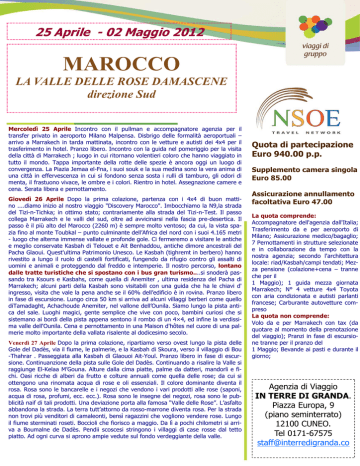 25 Aprile - 02 Maggio 2012 MAROCCO LA VALLE DELLE ROSE DAMASCENE direzione Sud Mercoledì 25 Aprile Incontro con il pullman e accompagnatore agenzia per il transfer privato in aeroporto Milano Malpensa. Disbrigo delle formalità aeroportuali – arrivo a Marrakech in tarda mattinata, incontro con le vetture e autisti dei 4x4 per il trasferimento in hotel. Pranzo libero. Incontro con la guida nel pomeriggio per la visita della città di Marrakech ; luogo in cui ritornano volentieri coloro che hanno viaggiato in tutto il mondo. Tappa importante della rotte delle spezie è ancora oggi un luogo di convergenza. La Piazia Jemaa el-Fna, i suoi souk e la sua medina sono la vera anima di una città in effervescenza in cui si fondono senza sosta i rulli di tamburo, gli odori di menta, il frastuono vivace, le ombre e i colori. Rientro in hotel. Assegnazione camere e cena. Serata libera e pernottamento. Giovedì 26 Aprile Dopo la prima colazione, partenza con i 4x4 di buon mattino ....diamo inizio al nostro viaggio "Discovery Marocco". Imbocchiamo la N9,la strada del Tizi-n-Tichka; in ottimo stato; contrariamente alla strada del Tizi-n-Test. Il passo collega Marrakech e le valli del sud, oltre ad avvicinarsi nella fascia pre-desertica. Il passo è il più alto del Marocco (2260 m) è sempre molto ventoso; da cui, la vista spazia fino al monte Toubkal – punto culminante dell’Africa del nord con i suoi 4.165 metri - luogo che alterna immense vallate e profonde gole. Ci fermeremo a visitare le antiche e meglio conservate Kasbah di Telouet e Ait Benhaddou, antiche dimore ancestrali del Pacha Glaoui. Quest'ultima Patrimonio Unesco. Le Kasbah (tighremt in berbero) hanno rivestito a lungo il ruolo di castelli fortificati, fungendo da rifugio contro gli assalti di uomini e animali e proteggendo dal freddo e intemperie. Il nostro percorso, lontano dalle tratte turistiche che si spostano con i bus gran turismo....si snoderà passando tra Ksours e Kasbahs, come quella di Anemiter , ultima residenza del Pacha di Marrakech; alcuni parti della Kasbah sono visitabili con una guida che ha le chiavi d' ingresso, visita che vale la pena anche se il 60% dell’edificio è in rovina. Pranzo libero in fase di escursione. Lungo circa 50 km si arriva ad alcuni villaggi berberi come quello diTamadaght, Achachoude Anemiter, nel vallone dell’Ounila. Siamo lungo la pista antica del sale. Luoghi magici, gente semplice che vive con poco, bambini curiosi che si sistemano ai bordi della pista appena sentono il rombo di un 4×4, ed infine la verdissima valle dell'Ounila. Cena e pernottamento in una Maison d'hôtes nel cuore di una palmerie molto importante della vallata risalente al dodicesimo secolo. Venerdì 27 Aprile Dopo la prima colazione, ripartiamo verso ovest lungo la pista delle Gole del Dadès, via il fiume, le palmerie, e la Kasbah di Skoura, verso il villaggio di Bou -Thahrar . Passeggiata alla Kasbah di Glaouoi Ait-Youl. Pranzo libero in fase di escursione. Continuanzione della pista sulle Gole del Dadès. Continuando a risalire la Valle si raggiunge El-Kelaa M’Gouna. Alture dalla cima piatte, palme da datteri, mandorli e fichi. Oasi ricche di alberi da frutto e colture annuali come quella delle rose; da cui si ottengono una rinomata acqua di rose e oli essenziali. Il colore dominante diventa il rosa. Rosa sono le bancarelle e i negozi che vendono i vari prodotti alle rose (saponi, acqua di rosa, profumi, ecc. ecc.). Rosa sono le insegne dei negozi, rosa sono le pubblicità naif di tali prodotti. Una deviazione porta alla famosa “Valle delle Rose”. L’asfalto abbandona la strada. La terra tutt’attorno da rosso-marrone diventa rosa. Per la strada non trovi più venditori di camaleonti, bensì ragazzini che vogliono vendere rose. Lungo il fiume sterminati roseti. Boccioli che fiorisco a maggio. Da lì a pochi chilometri si arriva a Boumalne de Dadès. Pendii scoscesi stringono i villaggi di case rosse dal tetto piatto. Ad ogni curva si aprono ampie vedute sul fondo verdeggiante della valle. Quota di partecipazione Euro 940.00 p.p. Supplemento camera singola Euro 85.00 Assicurazione annullamento facoltativa Euro 47.00 La quota comprende: Accompagnatore dell'agenzia dall'Italia; Trasferimento da e per aeroporto di Milano; Assicurazione medico/bagaglio; 7 Pernottamenti in strutture selezionate e in collaborazione da tempo con la nostra agenzia; secondo l'architettura locale: riad/Kasbah/campi tendati; Mezza pensione (colazione+cena – tranne che per il 1 Maggio); 1 guida mezza giornata Marrakech; N° 4 vetture 4x4 Toyota con aria condizionata e autisti parlanti francese; Carburante autovetture compreso La quota non comprende: Volo da e per Marrakech con tax (da quotare al momento della prenotazione del viaggio); Pranzi in fase di escursione tranne per il pranzo del 1 Maggio; Bevande ai pasti e durante il giorno; Agenzia di Viaggio IN TERRE DI GRANDA. Piazza Europa, 9 (piano seminterrato) 12100 CUNEO. Tel 0171-67575 [email protected] La vegetazione viene rosicchiata dai versanti desertici della montagna. La natura fa da padrona. Ci si imbatte nelle rocce sagomate di Tamlat, un curioso fenomeno di erosione che ha arrotondato enormi massi di granito. Pareti scure che creano un netto contrasto cromatico con il poco verde della vegetazione. Attraversato il ponte sul fiume la gola si restringe improvvisamente e la strada sale ripida. Sono le Gole del Dadès, canyon di un centinaio di chilometri scavato tra l’Alto Atlante e il Jebel Sarhro. Da qui si può proseguire per una strada che diventa sempre più difficile per raggiungere le Gole del Todra. Più in giù, si lascia il Dades e si prosegue fino a Tinherir. Il paesaggio cambia di nuovo. E’ più rigoglioso, perfino più verde. Si attraversano antichi villaggi in pisè. Un colpo d’occhio magnifico - si ha su un’antica grande Kasbah e il palmeto sottostante brulicante di gente al lavoro. Le palme si stendono nel fondovalle, il torrente si rompe in canali 