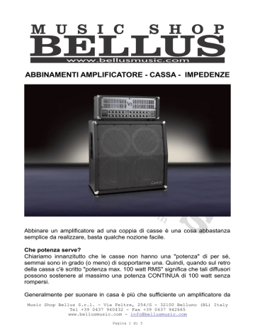 ABBINAMENTI AMPLIFICATORE - CASSA - IMPEDENZE Abbinare un amplificatore ad una coppia di casse è una cosa abbastanza semplice da realizzare, basta qualche nozione facile. Che potenza serve? Chiariamo innanzitutto che le casse non hanno una "potenza" di per sé, semmai sono in grado (o meno) di sopportarne una. Quindi, quando sul retro della cassa c'è scritto "potenza max. 100 watt RMS" significa che tali diffusori possono sostenere al massimo una potenza CONTINUA di 100 watt senza rompersi. Generalmente per suonare in casa è più che sufficiente un amplificatore da Music Shop Bellus S.r.l. - Via Feltre, 254/G - 32100 Belluno (BL) Italy Tel +39 0437 940432 - Fax +39 0437 942665 www.bellusmusic.com - [email protected] Pagina 1 di 5 15-30W, si passa ad un 50-80W per una sala prove per arrivare ai 100W se suonate in un palco o all'interno di un locale. Se fosse indicata anche una potenza "di picco" (quindi NON RMS!!!!) questo potrebbe avere diversi significati a seconda dello standard deciso dal Costruttore. In linea di massima e generalizzando molto, si potrebbe dire che la potenza di picco è quella che gli altoparlanti possono tollerare per brevissimi istanti (decimi di secondo) prima rompersi. C'è anche da dire che molto spesso queste potenze indicate sono molto ottimistiche e che, comunque, e più facile rompere un altoparlante con un amplificatore piccolo di bassa potenza portato all'estremo delle sue capacità piuttosto che con un ampli molto potente fatto funzionare in regime di tutta tranquillità per i suoi circuiti. Di conseguenza, la domanda "Ho un ampli da 50 watt, che casse ci devo mettere?" è piuttosto inutile e fuorviante. Il problema è infatti un altro: la sensibilità delle casse, non sempre dichiarata e spesso, anche questa, molto ottimistica. Si tratta del numeretto, espresso in dB, che talvolta trovate sul retro della cassa ed indica la pressione sonora che gli altoparlanti possono generare ad un metro di distanza quando ricevono un segnale di 1 watt di potenza. Più alto è questo numeretto, più forte suonerà la cassa a parità di amplificatore. Non è, di per sé, un indice della qualità della cassa, quanto il segno di una certa filosofia progettuale. Come scegliere i diffusori Diciamo che, orientativamente, la maggioranza dei diffusori in commercio ha una sensibilità compresa tra gli 86 ed i 90 dB. Di conseguenza, se volete che il vostro impianto suoni più forte dovete: 1. scegliere un ampli più potente e/o 2. scegliere dei diffusori più sensibili. Tenete conto che, orientativamente, un ampli 50 watt e dei diffusori da 88 dB generano una pressione sonora molto elevata in un ambiente di medie dimensioni. Più piccola è la stanza e meno esigenze, in termini di potenza e di sensibilità, avrete. Music Shop Bellus S.r.l. - Via Feltre, 254/G - 32100 Belluno (BL) Italy Tel +39 0437 940432 - Fax +39 0437 942665 www.bellusmusic.com - [email protected] Pagina 2 di 5 IMPEDENZE: 4 ohm, 6 ohm, 8 ohm...che significa? Se l'amplificatore ha uscite da 8 ohm e le casse sono da 4 ohm....che succede? In linea del tutto generale considerate che all'abbassarsi dell'impedenza (quella che si misura in ohm, appunto) all'amplificatore è richiesto di erogare più corrente. Questo di per sé non è un male, basta non esagerare. Se sul retro del vostro ampli c'è scritto "impedenza minima 4 ohm" forse non è sano collegarci diffusori da 2 ohm. Potrebbe non gradire. Così come se ci fosse scritto "impedenza minima 8 ohm" si potrebbe trovare in difficoltà a pilotare diffusori da 4 ohm. Normalmente, la stragrande maggioranza degli amplificatori in commercio non ha più alcun problema a pilotare carichi difficili (cioè bassi), diciamo anche sotto i 4 ohm. Solo un'avvertenza: collegare una seconda coppia di casse (in parallelo a quelle principali) causa un dimezzamento dell'impedenza, il che significa che 4 casse da 4 ohm sono equivalenti a due da 2 ohm....quindi occhio che l'ampli potrebbe non gradire sul serio!! In definitiva, state tranquilli: se il vostro ampli è di tipo "commerciale" (di marca e prezzo non elevato) con tutta probabilità dispone di protezioni elettroniche che lo salvaguardano da impegni troppo gravosi oltre le sue possibilità. Quindi non si rompe..... :) CHE TIPO DI CAVO DEVE ESSERE UTILIZZATO TRA CHITARRA E AMPLIFICATORE? Tra chitarra e amplificatore vanno utilizzati cavi schermati (sbilanciati) possibilmente di buona qualità che evitino la perdita di segnale o la presenza di interferenze. Music Shop Bellus S.r.l. - Via Feltre, 254/G - 32100 Belluno (BL) Italy Tel +39 0437 940432 - Fax +39 0437 942665 www.bellusmusic.com - [email protected] Pagina 3 di 5 CHE TIPO DI CAVO DEVE ESSERE UTILIZZATO TRA TESTATA O FINALE E CASSA? Tra testata e cassa va utilizzato un cavo non schermato simile ai comuni cavi elettrici per intenderci dei cavi (solitamente jack – jack) di potenza come mostrati di seguito. COME BISOGNA PROCEDERE PER COLLEGARE PIù UNITà (PREAMPLIFICATORI, MULTIEFFETTI, PEDALIERE MIDI, ETC…) MIDI? Nel collegamento di più processori MIDI bisogna tener presente che il segnale AUDIO è indipendente da quello MIDI e quindi deciso il percorso per il segnale AUDIO (generalmente chitarra -> preamplificatore->multieffetto 1(modulazioni)-> multieffetto 2(ambienti) ->finale) si può scegliere il percorso MIDI più comodo per poi effettuare il MIDI MAPPING (es.: pedalera midi-> multieffetto 1(modulazioni) preamplificatore-> -> multieffetto 2 (ambienti)). COME FARE PER EVITARE I DISTURBI DERIVATI DALLA RETE Music Shop Bellus S.r.l. - Via Feltre, 254/G - 32100 Belluno (BL) Italy Tel +39 0437 940432 - Fax +39 0437 942665 www.bellusmusic.com - [email protected] Pagina 4 di 5 ELETTRICA QUANDO I PEDALI EFFETTO NON SONO ALIMENTATI A BATTERIA? Assicurarsi che l’alimentatore sia di buona qualità e magari utilizzare un “NOISE GATE” tipo quello della MXR per la riduzione dei rumori di fondo. COSA SI INTENDE PER IMPEDENZA? È un parametro elettrico determinato dal