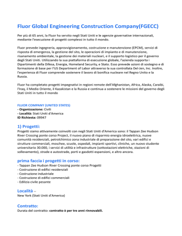 Fluor Global Engineering Construction Company(FGECC) Per più di 65 anni, la Fluor ha servito negli Stati Uniti e le agenzie governative internazionali, mediante l'esecuzione di progetti complessi in tutto il mondo. Fluor prevede ingegneria, approvvigionamento, costruzione e manutenzione (EPCM), servizi di risposta di emergenza, la gestione del sito, le operazioni di impianto e di manutenzione, risanamento ambientale, la gestione dei materiali nucleari, e il supporto logistico per il governo degli Stati Uniti. Utilizzando la sua piattaforma di esecuzione globale, l'azienda supporta i Dipartimenti della Difesa, Energia, Homeland Security, e Stato. Esso prevede azioni di sostegno e di formazione di base per l'US Department of Labor attraverso la sua controllata Del-Jen, Inc. Inoltre, l'esperienza di Fluor comprende sostenere il lavoro di bonifica nucleare nel Regno Unito e la Russia. Fluor ha completato progetti impegnativi in regioni remote dell'Afghanistan, Africa, Alaska, Caraibi, l'Iraq, il Medio Oriente, il Kazakistan e la Russia e continua a sostenere le missioni del governo degli Stati Uniti in tutto il mondo FLUOR COMPANY (UNITED STATES) - Organizzazione: Civili - Località: Stati Uniti d'America ID Richiesta: 09947 1) Progetti: Progetti siamo attivamente coinvolti con negli Stati Uniti d'America sono: il Tappan Zee Hudson River Crossing ponte corso Project, il nuovo piano di risparmio energia idroelettrica, nuove comunità residenziali, petrolchimico zona industriale di preparazione del sito, vari edifici e strutture commerciali, moschee, scuole, ospedali, impianti sportivi, cliniche, un nuovo studente universitario 30.000, i servizi di utilità e infrastrutture (sottostazioni elettriche, stazioni di sollevamento), strade e autostrade, porti e gasdotti espansioni, e altro ancora. prima faccia i progetti in corso: - Tappan Zee Hudson River Crossing ponte corso Progetti - Costruzione di edifici residenziali - Costruzione industriale - Costruzione di edifici commerciali - Edilizia civile pesante Località -New York (Stati Uniti d'America) Contratto: Durata del contratto: contratto è per tre anni rinnovabili. FLUOR DIPENDENTI: 1) Fluor Ingegneria Impresa costruzioni Global fornisce e inviare biglietto aereo per tutti i nuovi dipendenti per il suo / la sua partenza dal paese di origine al sito del progetto (Stati Uniti), dopo il tuo contratto di lavoro è stato segno. 2) Fluor Ingegneria Impresa di costruzione globale è responsabile per l'elaborazione di visto di lavoro è di tutti è nuovi dipendenti direttamente con il servizio di Washington DC stato immigrazione (se il dipendente non è dagli Stati Uniti) 3) Fluor Ingegneria Impresa di costruzione Global fornisce una sistemazione confortevole, un appartamento che è stato arredato compreso di tutte le utenze di base per tutti i dipendenti. 4) Fluor Ingegneria Impresa di costruzione Global fornisce a tutti i dipendenti, con un trasporto di lavoro, da casa al lavoro e ritorno al giorno. 5) Fluor Ingegneria Impresa di costruzione Global fornisce a tutti i dipendenti una prima assistenza sanitaria classe medica gratuita (sul posto negli Stati Uniti), 6) Fluor Ingegneria Impresa di costruzione Global fornisce ai propri dipendenti una partecipazione ammissibile gruppo Fluor / opzioni di piano di assistenza sanitaria privata. 7) Fluor Ingegneria Impresa di costruzione Global fornisce a tutti i dipendenti con una partecipazione piano previdenziale. 8) Fluor Ingegneria Impresa di costruzione Global fornisce a tutti i dipendenti con le opzioni di assicurazione sulla vita per voi e per familiari a carico qualificati. 9) Fluor Ingegneria Impresa di costruzione Global fornisce a tutti i dipendenti una base di 24 giorni di ferie pagate una volta all'anno. 10) Fluor Global Engineering Impresa costruzioni fornisce a tutti i dipendenti una 2 giorni di ferie pagate ogni anno torna a casa. 11) FUORI CASA. Nota, è possibile applicare solo per una casa di lasciare solo dopo 3 mesi di servizio. 12) Fluor Ingegneria Impresa di costruzione Global fornisce a tutti i dipendenti con una copertura di tasse scolastiche scuola per i bambini al di sotto dei 18 anni di età. Nota: Tutti i dipendenti che non sono cittadini dello Stato Uniti d'America sono responsabili a pagare per il loro costo permesso di lavoro (332 $). Azienda Fluor sarà responsabile di presentare una domanda alla US Immigration Bereau per sponsorizzare i vostri permessi di lavoro, fornendo (strutture ricettive, le coperture assicurative e biglietti aerei) La descrizione del lavoro e le esigenze dell'azienda con Fluor. Gent. ....... ......... , Grazie per la vostra posta, vogliamo informarvi che abbiamo ricevuto la vostra posta e passato attraverso il vostro CV ed è abbastanza impressionante e molto interessante con la vostra esperienza diversificata nei diversi settori di lavoro relativi al sondaggio costruzione, la gestione e la terra. Al Fluor Global Engineering Construction Company capiamo che la nostra gente sono il nostro bene più grande, quindi, assumere e trattenere i migliori possibili dipendenti è un obiettivo primario. Se siete alla ricerca di un ambiente di lavoro stimolante che incoraggia la creatività, l'iniziativa, la crescita professionale e opportunità di carriera a lungo termine, quindi Fluor Global Engineering Construction Company. può essere una buona partita per voi. Guardando il tuo CV e qualifiche, la società ha una posizione in attesa di un archeologo. Con le vostre qualifiche, competenze ed esperienza, Fluor Società di ingegneria sarà molto interessati ad assumere i propri servizi ad unirsi forza lavoro della società come un piombo archeologo capo equipaggio di qui a New York (USA). Nota: Si noti che devono essere sottoposti a un programma di formazione con l'azienda al primo mese del rapporto di lavoro per essere addestrato per migliorare le vostre conoscenze e abilità come archeologo capo equipaggio della società professionale per soddisfare tutti gli s