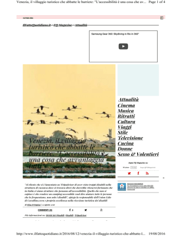 Venezia, il villaggio turistico che abbatte le barriere: "L'accessibilità è una cosa che av... Page 1 of 4 × •ULTIMA ORA• IlFattoQuotidiano.it / FQ Magazine / Attualità Attualità Cinema Musica Ritratti Cultura Viaggi Stile Televisione Cucina Donne Sesso & Volentieri Venezia, il villaggio turistico che abbatte le barriere: “L’accessibilità è una cosa che avvantaggia tutti” Segui FQ Magazine su: Mi piace di Elisa D'Ospina 19 mila Segui @FQMagazineit × "Al cliente che si è lamentato su Tripadvisor di aver visto troppi disabili nella struttura di vacanza dove si trovava direi che dovrebbe ritenersi fortunato che in Italia ci siano strutture che pensano all'accessibilità. Quello che non si capisce è che rendere un camping accessibile vuol dire aiutare tutte le persone che lo frequentano, non solo i disabili", spiega la responsabile dell'Union Lido di Cavallino,vera e propria eccellenza nella ricezione turistica dei disabili Annunci Immobiliari Su Immobiliare.it trovi oltre 900.000 annunci di case in vendita e in affitto. Cerca ora! di Elisa D'Ospina | 12 agosto 2016 COMMENTI (0) 0 Più informazioni su: Diritti dei Disabili, Disabili, Tripadvisor S i i h f i i il di di http://www.ilfattoquotidiano.it/2016/08/12/venezia-il-villaggio-turistico-che-abbatte-l... 19/08/2016 Venezia, il villaggio turistico che abbatte le barriere: "L'accessibilità è una cosa che av... Page 2 of 4 × •ULTIMA ORA• italiane che ai disabili dedicano tutta l’attenzione possibile, tanto da diventare un’eccellenza. E’ l’esempio dell’Union Lido di Cavallino, un villaggio turistico che nel 2010 ha vinto il Premio SensoriABILIS come “Miglior Struttura Ricettiva e di Ristorazione” in Italia, distinguendosi per il suo costante e pluriennale impegno nel campo dell’accessibilità e dell’ospitalità. Sono presenti 12 case mobili, 4 bungalow e 4 camping home patio accessibili . La lunga spiaggia che si distende per oltre 14 km è prevista di J.o.b. , una sedia per il trasporto dei disabili o per anziani che permette loro di andare al mare o sulla neve. Le particolari ruote sono studiate per il trasporto agevole su tutti i tipi di fondo come ad esempio la sabbia, ciottoli o la neve appunto. E’ una delle poche sedie che permette di entrare in acqua perché costruita con materiali in lega che non temono l’attacco della salsedine ed è completamente disassemblabile per il trasporto. Il nome è curioso: job o meglio Jamm O ‘ Bagn (andiamo al mare). DALLA HOMEPAGE Beach volley, per gli azzurri è argento Bolt senza rivali: conquista anche i 200 “Io sono tra i grandi come Alì e Pelè” Olimpiadi Rio 2016 CRONACA Latina, i comuni vogliono l’acqua pubblica La banca irlandese no. E commissaria la società La spiaggia dell’Union Lido inoltre è stata attrezzata con passerelle removibili e sono state approntate ben 20 unità abitative accessibili. “L’accessibilità è una cosa che avvantaggia tutti: basti pensare a una mamma con un PALAZZI & POTERE Roma, il vicesindaco Frongia: “Stipendi alti? Risparmieremo un milione su 5 Con i rifiuti si sono arricchiti in tanti” passeggino, in una struttura come questa non trova difficoltà a muoversi sola senza l’aiuto di nessuno. Il nostro personale, dal Vai alla Homepage barman al bagnino, è istruito per essere di supporto a tutte le persone con difficoltà motoria” ci risponde Patrizia Castelli, Quality Promoting & Experiencing Manager. “Al cliente che in queste ore si è lamentato su Tripadvisor di aver visto troppi disabili nella struttura dove si trovava in vacanza direi che dovrebbe ritenersi fortunato che in Italia ci siano strutture che pensano all’accessibilità. Quello che non si capisce è rendere un camping accessibile vuol dire aiutare tutte le persone che lo frequentano, non solo i disabili”, continua severa la Castelli. Presente nella struttura anche il W10 Leisure Building, una casa del benessere. La struttura è attrezzata con mappe tattili utili per favorire l’orientamento e la completa autonomia per le persone VIDEO CONSIGLIATI × cieche e c’è un sollevatore che consente il facile utilizzo per le persone con difficoltà motorie sia della piscina grande che della vasca idromassaggio. Una formula vincente di “village for all” dove anche ai servizi igienici si accede tramite rampe in betonelle con corrimano da entrambi i lati e pendenza massima dell’8% in un breve tratto iniziale. Un’eccellenza italiana che è arrivata in Servizio Pubblico, elezioni Napoli: Travaglio racconta chi è Luigi de… Juncker, Brunetta sbotta contro Parenzo: ‘Mi lasci parlare, tanto non ha… commissione europea come case history per l’ospitalità e l’accessibilità delle strutture e dei servizi proposti. Attualmente la struttura si avvale di uno strumento di programmazione e pianificazione che consente di garantire interventi per migliorare l’accessibilità in modo costante e concreto, Sponsor Portogallo, drone riprende il surfista http://www.ilfattoquotidiano.it/2016/08/12/venezia-il-villaggio-turistico-che-abbatte-l... 19/08/2016 Venezia, il villaggio turistico che abbatte le barriere: "L'accessibilità è una cosa che av... Page 3 of 4 Boonman mentre •ULTIMA ORA• Ferragosto si avvicina, scopri le migliori offerte × (Room5) tratta di un software che evidenzia quali sono i lavori da fare per migliorare l’accessibilità quando si eseguono opere di ordinaria manutenzione e ammodernamento. Undicimila gli ospiti che in alta stagione sono presenti nel village camping di Cavallino provenienti da tutto il mondo. Una perla made in Italy che fa la differenza nel mondo dei camping e del turismo per i diversamente abili. Raccomandato da Più commentati Giorgia Libero morta a 23 anni: aveva raccontato sui social la sua malattia. L’ultimo post: “Grazie a tutti” Bruce Dickinson, il cantante degli Iron Maiden pilota il volo Meridiana da Olbia a Torino. La sorpresa dei passeggeri Cerchi Offerte ADSL? Guarda A ottobre