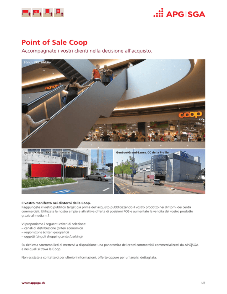 Point of Sale Coop Accompagnate i vostri clienti nella decisione all’acquisto. Zürich, EKZ Sihlcity Luzern/Kriens , EKZ Pilatusmarkt Genève/Grand-Lancy, CC de la Praille Il vostro manifesto nei dintorni della Coop. Raggiungete il vostro pubblico target già prima dell’acquisto pubblicizzando il vostro prodotto nei dintorni dei centri commerciali. Utilizzate la nostra ampia e attrattiva offerta di posizioni POS e aumentate la vendita del vostro prodotto grazie al media n. 1. Vi proponiamo i seguenti criteri di selezione: – canali di distribuzione (criteri economici) – regioni/zone (criteri geografici) – oggetti (singoli shoppingcenter/parking) Su richiesta saremmo lieti di mettervi a disposizione una panoramica dei centri commerciali commercializzati da APG|SGA e nei quali si trova la Coop. Non esistate a contattarci per ulteriori informazioni, offerte oppure per un’analisi dettagliata. www.apgsga.ch 1/2 Shoppingcenter nei quali si trova la Coop EKZ Sihlcity, Zurigo CC de La Praille, Ginevra/Grand-Lancy – Apertura nel 2007 – Apertura nel 2002 – Coop Megastore e oltre 70 ulteriori negozi – Coop Megastore e oltre 80 ulteriori negozi – Cifra d’affari annua 2012: 357 mio. CHF – Cifra d’affari annua 2012: 183 mio. CHF 2 – Superficie di vendita: 42 466 m – Superficie di vendita: 20 051 m2 – Parcheggi: 850 – Parcheggi: 971 EKZ Gäupark, Egerkingen EKZ Pilatusmarkt, Lucerna/Kriens – Apertura nel 2000 – Apertura nel 2006 – Coop Megasatore e oltre 60 ulteriori negozi – Coop Megastore e oltre 40 ulteriori negozi – Cifra d’affari annua 2012: 212 mio. CHF – Cifra d’affari annua 2012: 138 mio. CHF – Superficie di vendita: 40 470 m2 – Superficie di vendita: 21 500 m2 – Parcheggi: 1 372 – Parcheggi: 1 325 Seedamm-Center, Freienbach-Pfäffikon SZ EKZ City West, Coira – Apertura nel 1974 – Apertura nel 2011 – Coop Supermarché tipo C (grande) e oltre 50 ulteriori negozi – Coop Megastore e oltre 25 ulteriori negozi – Cifra d’affari annua 2012: 252 mio. CHF – Cifra d’affari annua 2012: 65 mio. CHF 2 – Superficie di vendita: 20 103 m – Superficie di vendita: 18 000 m2 – Parcheggi: 1 500 – Parcheggi: 680 EkZ Pizolcenter, Mels Centro Serfontana, Morbio Inferiore – Apertura nel 2002 – Apertura nel 1974 – Coop Supermarché tipo C (grande) e oltre 30 ulteriori negozi – Coop Supermarché tipo C (grande) e oltre 60 ulteriori negozi – Cifra d’affari annua 2012: 69 mio. CHF – Cifra d’affari annua 2012: 128 mio. CHF 2 – Superficie di vendita: 15 873 m – Superficie di vendita: 22 117 m2 – Parcheggi: 550 – Parcheggi: 1 000 Fonte: GFK Switzerland AG, Hergiswil (2013) Per ulteriori informazioni siamo a vostra disposizione: www.apgsga.ch/contatto 2/2