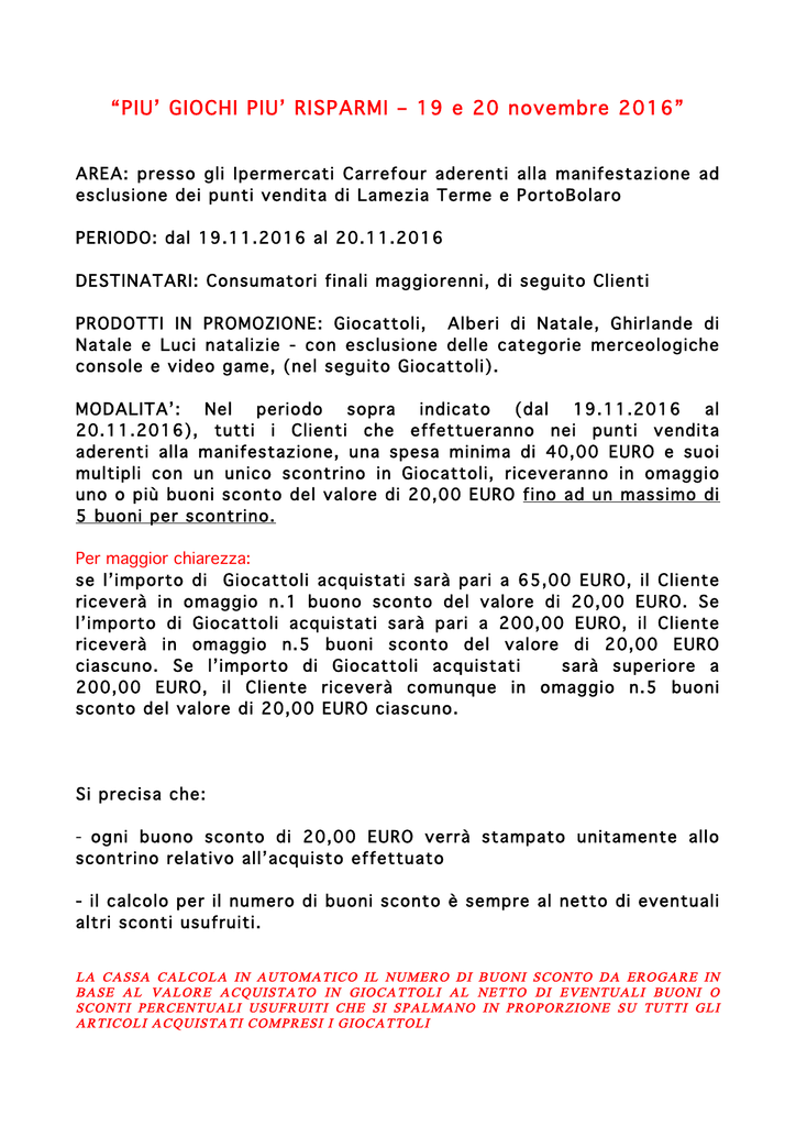 “PIU’ GIOCHI PIU’ RISPARMI – 19 e 20 novembre 2016” AREA: presso gli Ipermercati Carrefour aderenti alla manifestazione ad esclusione dei punti vendita di Lamezia Terme e PortoBolaro PERIODO: dal 19.11.2016 al 20.11.2016 DESTINATARI: Consumatori finali maggiorenni, di seguito Clienti PRODOTTI IN PROMOZIONE: Giocattoli, Alberi di Natale, Ghirlande di Natale e Luci natalizie - con esclusione delle categorie merceologiche console e video game, (nel seguito Giocattoli). MODALITA’: Nel periodo sopra indicato (dal 19.11.2016 al 20.11.2016), tutti i Clienti che effettueranno nei punti vendita aderenti alla manifestazione, una spesa minima di 40,00 EURO e suoi multipli con un unico scontrino in Giocattoli, riceveranno in omaggio uno o più buoni sconto del valore di 20,00 EURO fino ad un massimo di 5 buoni per scontrino. Per maggior chiarezza: se l’importo di Giocattoli acquistati sarà pari a 65,00 EURO, il Cliente riceverà in omaggio n.1 buono sconto del valore di 20,00 EURO. Se l’importo di Giocattoli acquistati sarà pari a 200,00 EURO, il Cliente riceverà in omaggio n.5 buoni sconto del valore di 20,00 EURO ciascuno. Se l’importo di Giocattoli acquistati sarà superiore a 200,00 EURO, il Cliente riceverà comunque in omaggio n.5 buoni sconto del valore di 20,00 EURO ciascuno. Si precisa che: - ogni buono sconto di 20,00 EURO verrà stampato unitamente allo scontrino relativo all’acquisto effettuato - il calcolo per il numero di buoni sconto è sempre al netto di eventuali altri sconti usufruiti. LA CASSA CALCOLA IN AUTOMATICO IL NUMERO DI BUONI SCONTO DA EROGARE IN BASE AL VALORE ACQUISTATO IN GIOCATTOLI AL NETTO DI EVENTUALI BUONI O SCONTI PERCENTUALI USUFRUITI CHE SI SPALMANO IN PROPORZIONE SU TUTTI GLI ARTICOLI ACQUISTATI COMPRESI I GIOCATTOLI - ogni buono sconto di 20 EURO potrà essere utilizzato solamente con Carta Payback presso tutti i punti vendita Carrefour Ipermercati aderenti, a fronte di una spesa minima di 40,00 EURO, con le seguenti modalità: per per per per per il il il il il 1° 2° 3° 4° 5° buono buono buono buono buono (dal (dal (dal (dal (dal 21.11.2016 28.11.2016 05.12.2016 12.12.2016 19.12.2016 al al al al al 25.11.2016) 02.12.2016) 07.12.2016) 16.12.2016) 23.12.2016) - Nel caso di contemporaneità con altre promozioni a sconto percentuale (come per esempio Carta Pass) lo sconto verrà calcolato al netto dei buoni usufruiti. - il buono sconto non è utilizzabile per l’acquisto di periodici, quotidiani e riviste (ai sensi del D.L.G.S. n.170/2001), libri di testo, buoni regalo, Donocard, Gratta & Vinci, ricariche (telefoniche, satellitari o digitale terrestre), prodotti della parafarmacia, farmaci da banco, protezioni assicurative e servizi Carrefour, carburanti e tutte le categorie merceologiche escluse dalla Legge (per esempio latte infanzia 1) - il buono sconto non dà diritto a resto e non è frazionabile. - il buono sconto è cumulabile in redenzione con buoni della stessa natura aventi la stessa data di validità a fronte di una spesa minima di 40EURO per ogni buono, ma non è cumulabile in redenzione con altri buoni in corso. - non saranno accettate fotocopie dei buoni A quali condizioni si ricevono e si possono spendere i buoni sconto? Ogni 40€ e multipli di prodotti “Giocattoli” (ad esclusione di video game e console) acquistati dal 19 novembre al 20 novembre 2016 si riceve un buono sconto da 20€. Ciascun buono da 20€ potrà essere utilizzato sul totale spesa spendendo almeno 40€ con carta PAYBACK nella data indicata sul buono stesso. Quindi, per esempio, spendendo 40€ in prodotti Giocattoli (ad esclusione di video game e console) si ha diritto a 1 buono sconto da 20€ da utilizzare in un unico scontrino di 40€ . Spendendo 82€ in prodotti “Giocattoli” (ad esclusione di video game e console) si ha diritto a 2 buoni sconto da 20€ cad. Ciascun buono potrà essere utilizzato in un unico scontrino nella data indicata sul buono stesso. Spendendo, invece, 35€ in prodotti Giocattoli non si ha diritto a nessun buono. Quando possono essere spesi i buoni sconto ricevuti? Ciascun buono sconto ricevuto , dal 19 novembre al 20 novembre 2016 può essere speso a fronte di una spesa minima di 40€ con carta PAYBACK . Il numero di buoni ricevuti e le loro validità seguono lo schema sotto riportato. Se spendi tra 40€ e 79,99€ in giocattoli ricevi 1 buono da 20€ spendibile con carta Payback su una spesa minima di 40€ con le seguenti validità: Buono 1 Date di validità dal 21/11 al 25/11 Se spendi tra 80€ 119,99€ in giocattoli ricevi 2 buoni da 20€ spendibili con carta Payback su una spesa minima di 40€ per ciascun buono con le seguenti validità: Buono 1 2 Date di validità dal 21/11 al 25/11 dal 28/11 al 02/12 Se spendi tra 120€ e 159,99€ in giocattoli ricevi 3 buoni da 20€ spendibili con carta Payback su una spesa minima di 40€ per ciascun buono con le seguenti validità: Buono 1 2 3 Date di validità dal 21/11 al 25/11 dal 28/11 al 02/12 dal 05/12 al 07/12 Se spendi tra 160€ e 199,99€ in giocattoli ricevi 4 buoni da 20€ spendibili con carta Payback su una spesa minima di 40€ per ciascun buono con le seguenti validità: Buono 1 2 3 4 Date di validità dal 21/11 al 25/11 dal 28/11 al 02/12 dal 05/12 al 07/12 dal 12/12 al 16/12 Se spendi oltre 200€ in giocattoli in giocattoli ricevi 5 buoni da 20€ spendibili con carta Payback su una spesa minima di 40€ per ciascun buono con le seguenti validità: Buono Date di validità 1 2 3 4 5 dal 21/11 al 25/11 dal 28/11 al 02/12 dal 05/12 al 07/12 dal 12/12 al 16/12 dal 19/12 al 23/12 In quali punti vendita è valida la promozione Più giochi più risparmi? La promozione “Più giochi più risparmi” è valida negli ipermercati Carrefour ad esclusione dei punti vendita di Lamezia Terme e Portobolaro. I buoni sconto sono cumulabili? - il buono sconto è cumulabile in redenzione con buoni della stessa natura aventi la stessa data di validità a fron
