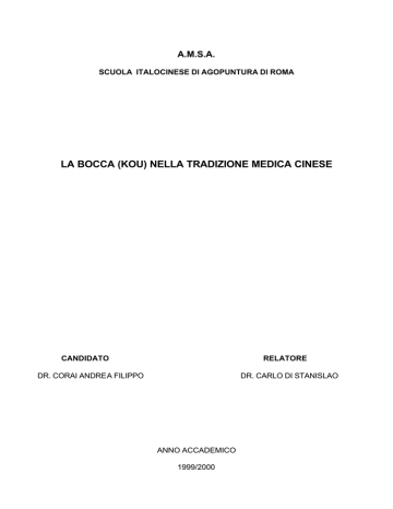 A.M.S.A. SCUOLA ITALOCINESE DI AGOPUNTURA DI ROMA LA BOCCA (KOU) NELLA TRADIZIONE MEDICA CINESE CANDIDATO RELATORE DR. CORAI ANDREA FILIPPO DR. CARLO DI STANISLAO ANNO ACCADEMICO 1999/2000 INDICE Pag. 2 Introduzione Pag. 5 Ricerche Energetiche Attuali Parte Prima Bocca simbolismo e semeiotica tradizionale cinese Pag. 14 Parte Seconda Stomatiti Pag. 16 Aftosi Pag. 17 Burning Mouth Sindrome Pag. 19 Conclusioni Introduzione Il modo in cui l’uomo è andato perfezionando, con il tempo, la propria capacità di comunicare desideri ed emozioni attraverso linguaggi sempre più articolati e complessi, ha fatto sì che si distinguesse in maniera inequivocabile dal resto del regno animale. La bocca (kou), in altre parole il primo dei sette orifizi del tubo digerente è il tramite principe di questa peculiarità unica, la quale, unita al resto delle sue consuete funzioni fisiologiche, rappresenta un complesso crocevia energetico attraverso il quale il cielo e la terra comunicano incessantemente garantendo la vita di relazione tra noi stessi e li mondo. I meridiani della milza, cuore, stomaco, grosso intestino, piccolo intestino ed ancora renmai du-mai e chong-mai sono in stretto contatto con la bocca, un tempo contrassegnata da un simbolo ovale successivamente nello Stile Amministrativo divenuto rettangolare. Nella suddivisione tripartita del viso la bocca occupa le regione inferiore, in relazione sia con la terra (assimilazione e digestione del cibo) che con il TE-I, in altre parole secondo la fisiognomica tradizionale estremo-orientale in relazione con Mercurio quindi con l’acqua ed i reni. Nel suo complesso la bocca è sotto il controllo della milza, ogni sua parte però controlla in maniera mirata e specifica le diverse attività ad essa preposte; infatti, il Su Wen (1) (Liu Jie Zang Xiang Lung) afferma: ”La bocca è l’orifizio della milza (pi kai qiao yu kou), quando la funzione milza/pancreas è in armonia essa può distinguere i cinque cereali. Se la milza è malata il gusto è perturbato e la bocca insipida. L’insieme milza/pancreas inoltre controlla le labbra anche se il Lingshu cap. 29 (2) avverte che se sono spesse o fini dipende dalla complessione debole o forte dell’intestino tenue, mentre le labbra, la lingua e l’appetito giudicati insieme ci forniscono informazioni sullo stato funzionale della milza. Le gengive superiori sono controllate dal grosso intestino, le inferiori dallo stomaco; i denti sono espressione del jing del rene, mentre la lingua riceve vari meridiani principali e secondari, è il germoglio del cuore e sulla sua superficie si proiettano i vari organi ed apparati. I cinesi affermano che una percezione gustativa normale o alterata dipende da un corretto o meno equilibrio energetico di milza, stomaco, reni e fluidi corporei in pratica dell’acquisito e del congenito, infatti, percezioni gustative in assenza di stimolo hanno notevole importanza semeiologica: sapore dolce in bocca (vuoto di milza), sapore aspro e bruciante (fuoco vuoto da vuoto di yin), sapore salato (vuoto di rene), ipogeusia con anoressia (vuoto di TE-M e di rene, vuoto di liquidi organici). Inoltre rientrano nello squilibrio energetico di stomaco, milza/pancreas e reni la maggior parte delle condizioni morbose che interessano l’apparato labiale e masticatorio dal punto di vista cutaneo e muscoloscheletrico. Un’attenta ispezione del volto può fornire molte informazioni utili, per una corretta interpretazione della costituzione energetica di una persona ed in questo senso saper leggere le diverse conformazioni di bocca e labbra possono essere d’aiuto. In rapporto alle cinque costituzioni abbiamo: LEGNO: bocca regolare, ben disegnata, molto mobile. Solchi peribuccali (mentoniero, commessurali, nasolabiali) molto evidenti. FUOCO: labbra tumide, molto carnose, a cuore. Nel complesso bocca molto sensuale. Eccesso di fuoco con facilità alle afte. TERRA: labbra carnose, bocca piccola. Facilità alle patologie globali orali. Labbra screpolate, con ragadi laterali o centrali, cheiliti a ripetizione. Fissazione erotica orale. METALLO: labbra sottili, bocca grande ma mal disegnata. Patologie gengivali del mascellare superiore, alitosi, secchezza, stomatiti che sono diffuse fino al retrobocca. ACQUA: bocca grande e sensuale. Cute pseudomucosale piuttosto scura. Atteggiamento delle labbra molto volitivo. Facilità alle turbe gustative ed alla secchezza senza aumento della sete. La struttura anatomo funzionale della bocca così sofisticata e duttile nel comunicare e registrare, durante la vita, i trascorsi di una persona, le sue sofferenze, le gioie, i traumi, ogni sorta d’esperienza affettiva ed emotiva, trova giustamente un inconfutabile e profondo nesso con la peculiarità energetica della milza, quella di destrutturare e trasformare il proprio vissuto, in modo da renderlo il più possibile assimilabile. Ecco perché la mimica facciale soprattutto delle persone anziane, ma non solo, può rivelare a grandi linee il tipo di vissuto delle stesse. Oltretutto durante la complessa evoluzione, i muscoli facciali umani si sono adattati sempre più e meglio ad assolvere un ruolo unicamente espressivo, grazie anche al fatto che il lavoro meccanico di lacerare e mordere è passato dai denti alle mani. Il Leijing cap. 1 (3) (Wei jing fu yi) sottolinea come le espressioni e la vitalità del viso dipendano dallo Shen, ma che tutte le trasformazioni (sheng hua) che modificano la forma (xing bian) sono prodotte dallo Yi cioè il Ben Shen di Pi. Le patologie del cavo orale, oltre a rivelare possibili squilibri energetici, contribuiscono a pregiudicare tutta la funzione digestiva, vuoi per turbe masticatorie, vuoi salivari o gustative, conducendo ad anoressia, pirosi dispepsie, digestioni lente e laboriose, turbe dell’alvo ecc.. L’esame di tali patologie può quindi risultare utile per formulare un giudizio generale circa lo stato di salute del paziente. RICERCHE ENERGETICHE ATTUALI PARTE PRIMA Bocca simb