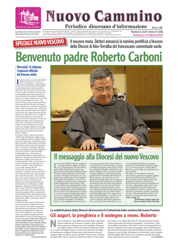 Euro 1,00 Quindicinale d’informazione della Diocesi Ales-Terralba Tassa Pagata - Autorizzazione Tribunale di Oristano n.3/95 del 3.10.1995 - Poste Italiane Spa. Sped. in a.p. D.L. 353/03 (conv. in L. 27/02/2004 n° 46) art. 1 comma 1 - Direzione – Redazione: Piazza Cattedrale, 2 – 09091 Ales (OR) - Tel. e Fax 0783.91402 - 0783.91603 - 334.1056570 Internet: www.nuovocammino.it - e-mail: [email protected] - [email protected] - [email protected] SPECIALE NUOVO VESCOVO Numero 4 (447) Anno 21 (68) Domenica 14 Febbraio 2016 Il vescovo mons. Dettori annuncia la nomina pontificia a Vescovo della Diocesi di Ales-Terralba del francescano conventuale sardo Benvenuto padre Roberto Carboni Mercoledì 10 febbraio l’annuncio ufficiale del Vescovo eletto l francescano conventuale Padre Roberto Carboni, 57 anni, di Scano Montiferro, segretario generale per la formazione dell’ordine, è stato eletto nuovo Vescovo della diocesi di Ales-Terralba. Il nome del Presule scelto da Papa Francesco e la sua biografia sono stati comunicati con emozione mercoledì 10 febbraio alle ore 12 nella Cattedrale di Ales dal Vescovo dimissionario mons. Giovanni Dettori. Alla presenza attenta e partecipe dell’arcivescovo di Sassari mons. Paolo Atzei, del Provinciale dei Frati minori conventuali p. Salvatore Sanna, dei sacerdoti operanti nelle 57 parrocchie, dei rappresentanti dei 39 comuni, di autorità civili e militari e di numerosi fedeli provenienti da tutto il territorio diocesano. Una Cattedrale gremita, con il supporto di pochi ma scrupolosi operatori dell’informazione isolana, ha sottolineato con lunghi applausi i passaggi salienti dei vari interventi al microfono dinanzi al paliotto dei Santi Pietro e Paolo. Il vescovo mons. Dettori ha detto: “Nel Nome del Signore, dopo la devota preghiera alla SS. Vergine Maria, invoco su tutti noi e sulla Diocesi di Ales-Terralba l'abbondanza dei doni dello Spirito Santo perché possiamo vivere con fede, con gioia e gratitudine, questa giornata tanto significativa per la Chiesa e per il mondo. Ci impegniamo a vivere fino in fondo questo giorno di penitenza e digiuno e di gioia per il bel dono che riceviamo. Voglio, prima di tutto, rendere grazie a Dio e a ciascuno di voi per il tempo che abbiamo trascorso insieme, nella continua ricerca della volontà di Dio, nell'amore vicendevole e nella comunione di ideali e di vita pastorale. Vi chiedo perdono per tutto quello che avrei dovuto fare e che non ho fatto, per i miei sbagli, per le mie fragilità, per tutte le mancanze di amore nei confronti della Diocesi, dei Sacerdoti, dei Religiosi e delle Religiose, degli operatori di Pastorale, come anche dei singoli fedeli. Nonostante tutto, ho cercato di manifestare sempre affetto, amicizia e disponibilità. Devo apertamente ringraziare tutti perché in voi ho trovato altrettanto affetto, amicizia, stima e collaborazione. Continueremo ancora a percorrere insieme un breve tratto di strada, con serenità, ma anche con grande attenzione per preparare al nuovo Vescovo un popolo ben disposto. Ora vi dò l'annuncio con commozione ma anche con grandissima gratitudine a Dio e a Papa Francesco che ha nominato il Rev.do P. Roberto Carboni dell’Ordine Francescano dei Frati Minori Conventuali, attualmente Segretario Generale per la Formazione, nuovo Vescovo di Ales – Terralba. La sua ordinazione episcopale e l’ingresso in Diocesi con la presa di possesso è fissata per domenica 17 aprile 2016.” + Giovanni Dettori I Il messaggio alla Diocesi del nuovo Vescovo arissimi fratelli e sorelle, a tutti voi un saluto di Pace e Bene nel Signore! La Provvidenza di Dio tramite il Santo Padre Francesco ha voluto scegliermi per la guida della Diocesi di AlesTerralba, dopo il generoso e illuminato servizio e ministero esercitato con competenza per dodici anni sino ad oggi dal Vescovo Giovanni Dettori a cui va il nostro affetto e tutta la nostra e mia gratitudine. Ringrazio il Santo Padre, il Vescovo di Roma che presiede tutte le Chiese nella carità, della sua fiducia e accolgo con trepidazione questa obbedienza che mi porta a voi come pastore e fratello. La mia vocazione francescana illumina il mio sì, ascoltando l’esempio di san Francesco di Assisi che sempre voleva essere “suddito e soggetto” alla Madre Chiesa. La consapevolezza dei miei limi- C ti, la sproporzione fra la Grazia di Dio e la mia povertà e il mio peccato, mi porta a chiedere in questo primo saluto a tutti voi, sacerdoti, diaconi, seminaristi, religiose, religiosi e laici, un ricordo speciale nella preghiera e nell’intercessione, perché io sia strumento della Grazia di Dio in mezzo a voi, per voi e con voi. Benché le vicende della vita e i cammini della vocazione francescana mi abbiano portato da molti anni fuori dalla Sardegna e anche in terra di missione fuori dall’Italia, ho sempre sentito e sento viva l’appartenenza alla mia amata isola, alla sua gente e alla sua Chiesa. Nutro profondo affetto per il mio paese di origine, Scano Montiferro, e conservo nel cuore la memoria della paterna vicinanza e amicizia del Vescovo Giovanni Pes, anch’egli di Scano Montiferro, che mi ha ordinato presbitero e mi sento parte della mia Diocesi di Alghero- Bosa con il suo vescovo mons. Mauro Maria Morfino, a cui mi lega una profonda e antica amicizia. Ma voglio, sin da questo momento, aprire il mio cuore per accogliere questa porzione di Chiesa che è la Diocesi di Ales- Terralba a cui in Signore mi invia, tendendo la mano ai suoi uomini e donne in segno di amicizia e desiderio di incontro, includendo anche coloro che non condividono la nostra fede ma ci sono fratelli e sorelle in umanità. Vorrei che tutti si sentissero accolti e ascoltati, che non ci fossero barriere o timori nel parlare e incontrare il proprio Vescovo. (cont. a pag. 2) Fra Roberto Carboni ofm conv Vescovo eletto di Ales-Terralba La soddisfazione della Diocesi all’annuncio in Cattedrale della nomina del nuovo Pastore Gli auguri, la preghiera e il sostegno a
