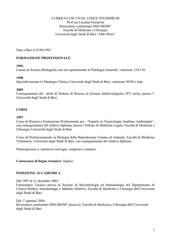 CURRICULUM VITAE ATQUE STUDIORUM Prof.ssa Luciana Fumarola Ricercatore confermato SSD MED07 Facoltà di Medicina e Chirurgia Università degli Studi di Bari “Aldo Moro” Nata a Bari il 25/06/1967 FORMAZIONE PROFESSIONALE 1994 Laurea in Scienze Biologiche con tesi sperimentale in Patologia Generale, votazione 110/110. 1998 Specializzazione in Patologia Clinica, Università degli Studi di Bari, votazione 50/50 e lode. 2005 Conseguimento del titolo di Dottore di Ricerca in Scienze Infettivologiche (XV ciclo), presso l’ Università degli Studi di Bari. CORSI 1997 Corso di Ricerca e Formazione Professionale per : “Esperto in Tossicologia Analitica Ambientale”, con conseguimento del relativo diploma, presso l’Istituto di Medicina Legale, Facoltà di Medicina e Chirurgia, Università degli Studi di Bari. Corso di Perfezionamento in Biologia della Riproduzione Umana ed Animale, Facoltà di Medicina Veterinaria, Università degli Studi di Bari, con conseguimento del relativo diploma. Partecipazione a numerosi convegni, congressi e simposi. Conoscenza di lingue straniere: Inglese POSIZIONE ACCADEMICA Dal 1997 al 31 dicembre 2003: Funzionario Tecnico presso la Sezione di Microbiologia ed Immunologia del Dipartimento di Clinica Medica, Immunologia e Malattie Infettive, Facoltà di Medicina e Chirurgia dell’Università degli Studi di Bari. Dal 1° gennaio 2004 Ricercatore confermato SSD MED07 presso la Facoltà di Medicina e Chirurgia dell’Università degli Studi di Bari. 1 ATTIVITA’ SCIENTIFICA Argomenti di interesse: Aspetti eziopatogenetici e diffusione di malattie batteriche e di parassitosi. ATTIVITA’ DIDATTICA Insegnamento di: Metodi e tecniche di microbiologia, I anno del Corso di Laurea Triennale in Tecniche di Laboratorio Biomedico, Facoltà di Medicina e Chirurgia, Università degli Studi di Bari. Insegnamento di: Diagnostica microbiologica, III anno Scuola di Specializzazione in Microbiologia e Virologia (N.O.), Facoltà di Medicina e Chirurgia, Università degli Studi di Bari. Insegnamento di: Microbiologia e microbiologia clinica, I anno Scuola di Specializzazione in Microbiologia e Virologia (N.O.), Facoltà di Medicina e Chirurgia, Università degli Studi di Bari. Insegnamento di: Microbiologia II, I anno Scuola di Specializzazione in Medicina del Lavoro, Facoltà di Medicina e Chirurgia, Università degli Studi di Bari. 2009/2010, 2010/2011, 2011/2012: Microbiologia e Microbiologia clinica, corso integrato con Igiene generale e applicata e Virologia molecolare con laboratorio di biotecnologie virologiche, CdL Biotecnologie Mediche e Farmaceutiche (N.O.), II anno, Facoltà di Scienze Biotecnologiche. 2012/2013: Microbiologia e Microbiologia clinica, corso integrato con Virologia molecolare con laboratorio di biotecnologie virologiche, CdL Biotecnologie Mediche e Farmaceutiche (N.O.), II anno, Facoltà di Scienze Biotecnologiche. Didattica integrativa: Corso di Laurea in Medicina e Chirurgia, Facoltà Università degli Studi di Bari Disciplina: Microbiologia, Docente Ufficiale: Prof.ssa R. Monno di Medicina e Chirurgia, Partecipazione in qualità di docente al Corso Teorico Pratico di Diagnostica Parassitologica patrocinato dall’Ordine Nazionale dei Biologi. (Bari,11 gennaio-15 febbraio 2001). 2 Partecipazione in qualità di docente al Corso Teorico Pratico di Diagnostica Parassitologica patrocinato dall’Ordine Nazionale dei Biologi. (Bari, 28/11/2002-4/02/2003). Partecipazione in qualità di docente al Corso di aggiornamento Teorico-Pratico in: Diagnostica di Laboratorio delle infezioni delle basse vie respiratorie patrocinato dall’Associazione Pugliese Biochimici Clinici (Bari, 4, 6, 11, 13, 18, 20, 25 maggio 2005). Partecipazione in qualità di docente al Corso di formazione e aggiornamento professionale per il personale addetto ai reparti di Malattie Infettive e A.I.D.S. ex legge 135/90, D.M. 30/10/90 e D.M. 25/07/95 (Ospedale Pediatrico Giovanni XXIII, Bari, ottobre-novembre 2008) Componente delle seguenti commissioni di esame: Microbiologia e Parassitologia (Medicina e Chirurgia, corso C-D), Microbiologia (Tecniche di Laboratorio Biomedico), Diagnostica (Dietisti), Fenomeni biologici (Assistenza Sanitaria), Microbiologia clinica (Sc. Biosanitarie). Presidente del Corso integrato di Scienze Biologiche, CdL Tecniche di Laboratorio Biomedico, Facoltà di Medicina e Chirurgia, Università degli studi di Bari A. Moro Componente del Collegio dei docenti del Dottorato di Ricerca in: Igiene, Sanità Pubblica e Sicurezza Alimentare, (XXIII e XXIV ciclo), Coordinatore Prof.ssa M.T. Montagna. Componente del Collegio dei docenti del Dottorato di Ricerca in: Patologia medico legale e tecniche criminalistiche (XXV ciclo), Coordinatore Prof. M. F. Colonna. Componente del Collegio dei docenti della Scuola di Dottorato di Ricerca in Scienze Biomediche (Coordinatore: Prof. A. Vacca), Indirizzo: Igiene, Sanità Pubblica e Sicurezza Alimentare, (XXVI e XXVII ciclo), Coordinatore Prof.ssa M.T. Montagna. Componente del Collegio dei docenti della Scuola di Dottorato in Scienze del Benessere (Coordinatore. Prof. Paolo Livrea), Indirizzo: Ambiente, Medicina e Salute (XXVIII ciclo), Coordinatore Prof. L. Soleo. Componente del Consiglio delle Scuole di Specializzazione in: Microbiologia e Virologia, Medicina del Lavoro. TESTI DIDATTICI Collaborazione alla stesura del testo di MICROBIOLOGIA MEDICA, 2000, a cura di E. Romero, G. Filice, G. Miragliotta, edito dalla Mc Graw Hill, riguardante i capitoli 22 (Spirochete, p.198-208), 23 (Campilobatteri, elicobatteri, p.209-213), 28 (Legionelle, p. 233-235), 30 (Bartonelle, p. 244-246). Collaborazione alla stesura di capitoli del testo Parassitologia Urbana, 2003, a cura del Prof. V. Puccini e della dott.ssa E. Tarsitano, Casa Editrice Il SOLE 24 ORE, Edagricole S.r.l., riguardante i capitoli: Giardia e Cryptosporidium, agenti di zoonosi idrodiffuse, (autori: O. Brandonisio, L. Fumarola, R. Spinelli) e La leishmaniosi in ambito urbano:epidem