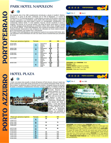 PORTOFERRAIO PARK HOTEL NAPOLEON Km. 3 Km.5 Una stupenda villa di fine '800 completamente ristrutturata e ubicata in località S. Martino, immersa in un parco di 85 ettari, confinante con la Villa di Napoleone, a 5 minuti da Portoferraio e a 15 minuti dall'aeroporto. L'hotel dispone una suite e di 64 camere, tutte ampie con vista o sul parco o su Portoferraio, parte situate nella costruzione d'epoca e parte nella moderna dependance; esse hanno bagno o doccia, wc, asciugacapelli, riscaldamento e aria condizionata, telefono diretto, Tv color satellitare, frigo-bar, servizio cassaforte in camera e reception. Due piscine, di cui una per bambini, due campi da tennis, parco giochi, in località La Biodola, spiaggia privata attrezzata con ombrelloni, sdraio, lettini, docce, collegata all'hotel da un servizio navetta. Il Park Hotel Napoleone, ben si presta ad accogliere eventi culturali e meeting aziendali, disponendo di sala conferenze che, attrezzata con le più moderne tecnologie di comunicazione, può ospitare fino a 150 persone. Chi sceglie il Park hotel Napoleone vuole assaporare il gusto di una vacanza d'altri tempi, riprovare sensazioni ormai dimenticate che solo una natura ancora incontaminata può permettere di rivivere. Prezzi per persona al giorno Periodo 07/04-30/05 26/09-18/10 A 30/05-27/06 05/09-26/09 B 27/06-25/07 22/08-25/09 C 25/07-08/08 D 08/08-22/08 E PORTO AZZURRO PORTOFERRAI0 Depandance Classic Superior Suite Depandance Classic Superior Suite Depandance Classic Superior Suite Depandance Classic Superior Suite Depandance Classic Superior Suite BB HB 40 42 50 73 46,50 50 58 78 66,50 73 81 93 86,50 95 103 115 113,50 123 131 143 50 60 67 88 57 67 74 92 78 88 95 106 88 98 105 116 123 133 140 151 SOGGIORNO: libero CONSEGNA: 16.00 RILASCIO: 10.00 CAMERA SINGOLA: quotazioni su richiesta BAMBINI: 0-10 anni 100%, 11-17 anni 50% RIDUZIONI: 3°letto oltre 12 anni 25%. HOTEL PLAZA PORTO AZZURRO L'Hotel, con ampia vista sul golfo, è situato all'ingresso di Porto Azzurro, che puo' essere raggiunto a piedi per mezzo della strada provinciale o di una scalinata retrostante l'Hotel, che conduce al paese, caratteristico porto e rinomato centro turistico, sviluppato intorno ad una grande piazza. La struttura, completamente rinnovata, di prima categoria, è arredata in modo elegante e completamente insonorizzato. Dispone di 21 camere standard, di 7 camere superior (con ampio terrazzo) entrambe con vista mare, tutte con servizi privati, telefono, Tv color, phon, cassaforte, frigo-bar, aria condizionata, riscaldamento. Poco distanti dall' Hotel, in paese, vi sono due piccole spiagge, raggiungibili a piedi e, a pochi minuti di auto, le spiagge di Barbarossa, Reale, Lido di Capoliveri e Naregno, con possibilità di noleggio attrezzature in loco. Prezzi per persona al giorno 01/01-23/05 12/09-31/12 23/05-13/06 05/09-12/09 13/06-04/07 04/07-01/08 29/08-05/09 01/08-08/08 08/08-15/08 15/08-22/08 22/08-29/08 Periodo BB HB 50 70 B 55 75 C D E F G H 65 85 70 90 A 90 110 120 140 110 130 100 120 Km. 2 mt. 500 SOGGIORNO: inizio soggiorno libero CONSEGNA: dalle ore 15.00 RILASCIO: entro le ore 10.00 PASQUA E PONTI: Pasqua min. 3 notti suppl. Euro 30,00/gg/persona. 25 Aprile, 1° Maggio, 2 Giugno soggiorno min. 3 notti suppl. Euro 30,00/gg/persona. Capodanno prezzi tariffa G cenone incluso SUPPLEMENTI: Doppia uso singola 50%; Culla 0/2 anni gratuita pasti esclusi; Animali su richiesta Euro 10 non ammessi al ristorante. Camera Superior (ampio terrazzo vista mare) Euro 15,00 al giorno per camera. RIDUZIONI: 3°e 4° letto aggiunto adulti 25%, bambini 2-6 anni 100% in 3° letto, bambini 6-12 anni 50% in terzo letto. PROMOZIONI PIANO FAMIGLIA 2 ad + 1 chd fino a 6 anni = 2 ad (chd in solo pernottamento).