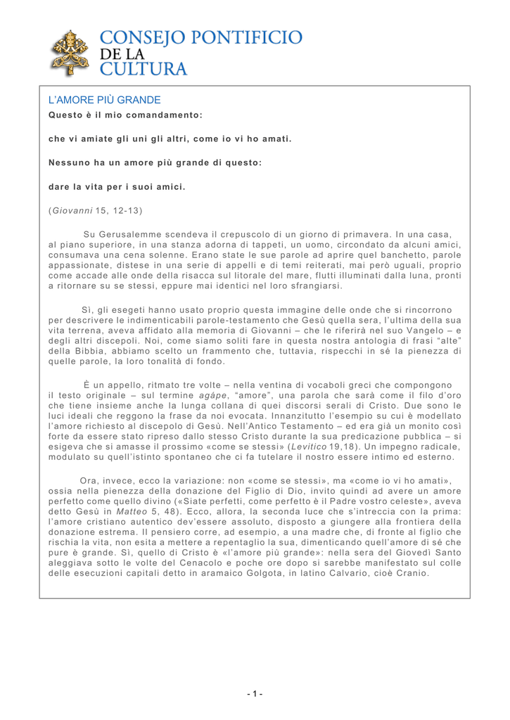 L’AMORE PIÙ GRANDE Questo è il mio comandamento: che vi am iate gl i uni gli altri, come io v i ho amati. Nessun o h a un am or e più grande di questo: dare la vita per i suoi amici. (Giovanni 15, 12-13) Su Gerusalemme scendeva il cr ep usco lo di un giorno di primavera. In una ca sa, al piano superi ore, in una stanza ador na d i tappeti, un uomo, circondato da alcuni amici, consumava una cena solenne. Erano stat e le sue parole ad aprire quel banchetto, pa role appassionate , di stese i n una serie di appelli e di temi reiterati, mai però uguali, pro prio come accade all e onde della risacca sul litora le del mare, flutti illuminati dalla luna, p ron ti a ritornare su se stessi , eppure mai ide nt ici n el loro sfrangiarsi. S ì, gli eseget i hanno usato proprio questa immagine delle onde che si rincorron o per descr ivere le indimenticabili parole- te stame nto che Gesù quella sera, l’ultima della su a vita terr ena, aveva aff idato alla memor ia di Giovanni – che le riferirà nel suo Vangelo – e degli altri discepoli. Noi , come siamo soliti fa re in questa nostra antologia di frasi “a lte ” della Bibbia, abbiamo scelto un framm ento che, tuttavia, rispecchi in sé la pienezza di quelle parole, la loro t onalità di fondo. È un a ppell o, ri tmato tre volte – nella ventina di vocaboli greci che compongono il testo origin ale – sul termine agáp e , “a mor e” , una parola che sarà come il filo d ’o ro che tiene ins ieme anche la lunga co lla na di quei discorsi serali di Cristo. Due sono le luci ideali che reggono la frase da noi evocat a. Innanzitutto l’esempio su cui è modella to l’amore richi est o al di scepolo di Gesù. Ne ll’An tico Testamento – ed era già un monito così forte da essere stato ripreso dallo stesso Cr ist o durante la sua predicazione pubblica – si esigeva che si amasse i l prossimo «come se st essi» (Levitico 19,18). Un impegno radica le, modulato su quel l’ ist int o spontaneo che ci f a t utelare il nostro essere intimo ed estern o. Or a, invece, ecco la variazione: non « com e se stessi», ma «come io vi ho amati» , ossia nella pienezza della donazione del Fig lio di Dio, invito quindi ad avere un amo re perfetto come quello di vino («Siate per fe tti, come perfetto è il Padre vostro celeste», a veva detto Gesù in Matteo 5, 48). Ecco, a llo ra, la seconda luce che s’intreccia con la prima: l’amore cristiano autentico dev’essere assolut o, disposto a giungere alla frontiera de lla donazione estrema. I l pensiero corre, ad esem pio, a una madre che, di fronte al figlio ch e rischia la vita, non esi ta a mettere a re pe nt aglio la sua, dimenticando quell’amore di sé ch e pure è grande. Sì, quell o di Cristo è «l’am ore più grande»: nella sera del Giovedì S anto aleggiava sotto l e volte del Cenacolo e poche ore dopo si sarebbe manifestato sul colle delle esecuzioni capitali detto in aramaico Go lgota, in latino Calvario, cioè Cranio. -1-