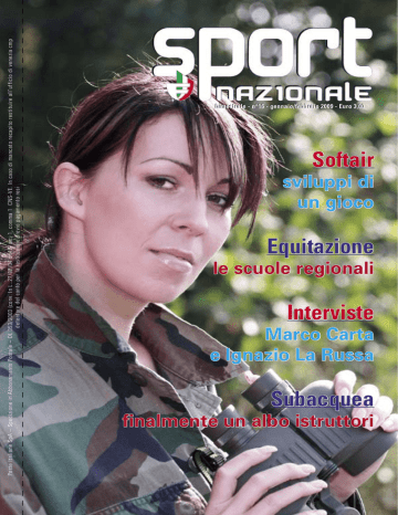 Poste Italiane SpA – Spedizione in Abbonamento Postale – DL 353/2003 (conv. In L..27/02/04 n..46) art. 1, comma 1 CNS-VE. In caso di mancato recapito restituire all’ufficio di venezia cmp detentore del conto per la restituzione previo pagamento resi bimestrale - n°16 - gennaio/febbraio 2009 - Euro 3,00 Softair sviluppi di un gioco Equitazione le scuole regionali Interviste Marco Carta e Ignazio La Russa finalmente un albo istruttori Subacquea Abbonamenti - 5 copie € 10,00 9633 copie di questo numero spedite per abbonamento postale SPORT NAZIONALE In copertina ragazza Softair Stampato per conto del: CENTRO NAZIONALE SPORTIVO FIAMMA SPORT NAZIONALE ANNO V Gennaio - Febbraio 2009 Numero 16 Direttore Responsabile: Paolo Lazzaro Direttore Editoriale: Vito Orlando Comitato di Direzione: Fiorenzo Pesce, Stefano Tringali, Roberto Avena, Antonio Albano, Achille Reali, Ilario Lazzaroni, Cesare Mevoli Redazione: Via Panisperna, 209 - 00184 Roma Fax 06 23328443 Amministrazione: Via Panisperna, 209 - 00184 Roma Fax 06 23328443 Grafica ed impaginazione: Mauro Andrighetti - Tel.041 928384 mail: [email protected] Archivio fotografico: Sport Nazionale Stampa: Comp Editoriale Veneta Via Cappelletto, 12 - 30170 Mestre (VE) Tel 041 2517411 Editore: 1000 Idee S.r.l. Via Tevere, 2/C - 30173 Mestre (VE) Pubblicità: 1000 Idee S.r.l. Via Tevere, 2/C - 30173 Mestre (VE) Fax 06 23328443 tel. 0412621679 mail: [email protected] InvioArticoli e Foto: Sport Nazionale C.P. 235 Mestre 8 - 30170 Mestre (VE) Tel. 041 2621679 mail: [email protected] Copie Stampate: 30.000 Distribuzione: Abbonamento Postale Registrazione: Tribunale di Venezia N° 30 del 2/10/06 Iscrizione al ROC n° 17639 del 25.11.2008 ALLE SOCIETÁ AFFILIATE DIVENTA PROTAGONISTA Attraverso le nostre pagine hai l’opportunità di raggiungere un numero infinito di appassionati. Siamo un formidabile veicolo di comunicazione, e tutto questo può essere a tua disposizione. Stampiamo annualmente 150.000 copie e bimestralmente raggiungiamo 30.000 diversi utenti, di cui 10.000 con abbonamento postale. Stimiamo che i nostri lettori superano le 35.000 unità, con dati in continua crescita. Diventa protagonista due volte, la prima nel realizzare il tuo evento, la seconda nel raccontarlo ai nostri lettori. Diventa il nostro inviato speciale sul tuo territorio, inviaci le notizie, i tuoi articoli e le più belle foto che disponi. SOMMARIO 6 8 12 17 19 25 34 36 41 48 49 Intervista 6 - Marco Carta Softair 7 - Difendiamo la natura 8 - Cos’è questa disciplina 10 - I corsi qualificati 11 - Softair in fiera 12 - Le calzature 14 - Militaria Expo Ferrara 17 - L’intervista al Ministro La Russa 18 - Il Re soldato 19 - Le armi NBC Subacquea 20 - L’Albo istruttori 21 - Un’immersione in Ungheria Arti marziali 27 - Memorial Falcone Borsellino 29 - L’isola che non c’è 31 - Ju jutsu a Mosca 32 - Takemusu Ju jutsu 34 - Kimono d’oro 35 - Karate Shotokan 36 - Kobudo e Krav Maga Equitazione 37 - EquiEtologia 39 - Lettiera biologica 40 - Allevatori a Verona 41 - Cavalli inutili - SER 43 - Dipartimento equitazione Notizie 47 - Vita di una campionessa 48 - Villaggio Italia 49 - Scherma e teatro 50 - Le società ci scrivono 4 04 Siamo ormai giunti al quinto anno della nostra rivista. Inizialmente nata in sordina e discontinua nelle sue uscite poi, sempre più consistente per pagine, argomentazioni e cadenza. Da due anni ha ormai consolidato la caratteristica bimestrale e si è dotata di una simpatica e funzionale veste grafica, implementando continuamente il numero dei lettori e degli abbonati, che oggi superano le 10.000 unità. Un successo dovuto a tanti amici appassionati che hanno creduto in questa esperienza editoriale “anomala”. Infatti, essa rappresenta il mondo sportivo praticato e non teorizzato o quello sterile amministrativo. Ci contrapponiamo alla burocratizzazione dello sport perché è il vero doping dello sport di base. La rivista rappresenta la parte sana della nazione, la quale desidera fare attività motoria per piacere, per il proprio benessere fisico e psichico. I nostri atleti non ipotecano il proprio futuro e la loro vita per raggiungere un risultato effimero, vogliono raggiungere gli obiettivi prefissati senza compromessi e senza distruggersi la vita. Nel praticare l’attività sportiva il fine non è la borsa o la gloria, è semplicemente la passione e il desiderio di fornire un senso compiuto alla propria esistenza. Spesso sono gli sport minori a stimolare i sentimenti degli atleti e a coinvolgerli in discipline che non li faranno mai divenire ricchi o famosi ma perseguire lo sport vero, quello che raccontiamo in queste pagine. Ecco l’importanza della nostra missione: essere vicini a chi lo sport lo pratica davvero e raccontare le loro storie. Questo è il successo di Sport Nazionale, rivista anomala perché non è specifica di alcuna disciplina ma le coinvolge tutte e spesso soccorre una o l’altra attività, fornendo spazio redazionale, per farle maggiormente conoscere e aiutarle d essere meglio divulgate. Attorno ad essa si forgia e si consolida un mondo umano che s’erge come una barriera contro il dilagare dell’indifferenza e della massificazione. Dare voce alle loro attività è sinonimo di una cultura di controinformazione che vuole salvare le individuali tradizioni dei piccoli gruppi, che tutti assieme formano la vera ricchezza del patrimonio umano italiano. EDITORIALE LETTERA AGLI ASSOCIATI Questo numero lo dedichiamo al Softair, una disciplina sportiva che ha la sua anzianità ma relativamente nuova per il nostro Centro. Su sollecitazione di alcune società affiliate ho iniziato ad interessarmi di questo sport e, unitamente ad alcuni esperti collaboratori ho iniziato ad addentrarmi in questo mondo particolare, sfatando preconcetti ed errate interpretazioni che la collettività può avanzare. Innanzi tutto ho scoperto uno spirito molto giovanile, anche se alcuni appassionati anagraficamente non possono più definirsi tal