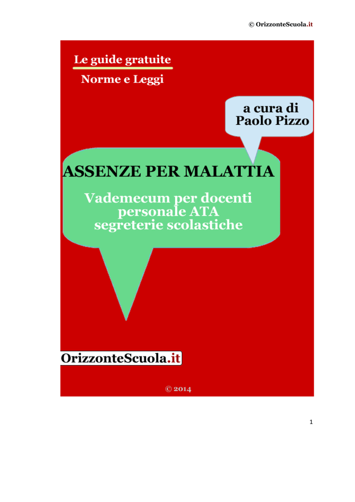 © OrizzonteScuola.it 1 © OrizzonteScuola.it 2014 © Orizzonte Scuola S.R.L. Via J. A. Spataro 17/A – 97100 Ragusa (Rg) - Sicily E-mail: [email protected] http://orizzontescuola.it 2 © OrizzonteScuola.it Indice Periodo di comporto e retribuzione per il personale assunto a tempo indeterminato e determinato; pg. 4 Certificazione online; pg. 8 Obblighi del dipendente; pg. 9 Decurtazione “Brunetta”; pg. 11 La visita fiscale; pg. 16 Assenze per grave patologia. pg. 30 LA GUIDA COMPLETA DI ORIZZONTE SCUOLA http://libreria.orizzontescuola.it/ 3 © OrizzonteScuola.it PERIODO DI COMPORTO E RETRIBUZIONE PER IL PERSONALE ASSUNTO A TEMPO INDETERMINATO E DETERMINATO PERSONALE ASSUNTO A TEMPO INDETERMINATO Al personale assunto a tempo indeterminato spetta la conservazione del posto per un periodo di 18 mesi nel triennio: ai fini della maturazione del predetto periodo, si sommano, alle assenze dovute all’ultimo episodio morboso, le assenze per malattia verificatesi nel triennio precedente (Se un dipendente è stato assente dal 22/4/2014 al 26/5/2014, il triennio a ritroso per il calcolo della malattia è partito dal 21/4 e poi si è sommato ad esso l’ultimo episodio morboso [dal 22/4/2014 al 26/5/2014]). Durante tale periodo: Dal 1° al 9° mese retribuzione fissa mensile al 100%. Nell’ambito di tale periodo per le malattie superiori a 15 gg. lavorativi o in caso di ricovero ospedaliero e per il successivo periodo di convalescenza postricovero, al dipendente compete anche ogni trattamento economico accessorio a carattere fisso e continuativo Dal 10° al 12° mese retribuzione fissa mensile al 90%; Dal 13° al 18° mese retribuzione fissa mensile al 50%. I primi 18 mesi di assenza per malattia (art. 17 comma 1 CCNL/2007) sono utili alla maturazione del diritto alle ferie e alle festività soppresse; all’anzianità di servizio; alla progressione della carriera; al trattamento di quiescenza e di previdenza e al trattamento di fine rapporto. Le assenze per malattia retribuite o parzialmente retribuite non interrompono la maturazione dell’anzianità di servizio a tutti gli effetti. Terminati questi 18 mesi il dipendente può richiedere un ulteriore periodo di 18 mesi. Tali assenze (dal 19° al 36° mese art. 17 comma 2 CCNL/2007), su richiesta specifica del dipendente in casi particolarmente gravi, sono concedibili senza retribuzione, interrompono qualsiasi anzianità di servizio, tranne quella del preavviso, e sono utili solo per la conservazione del posto. Possono però essere riscattati ai fini pensionistici, a domanda, se successivi al 31.12.1996. 4 © OrizzonteScuola.it PERSONALE ASSUNTO A TEMPO DETERMINATO Personale con contratto stipulato per l´intero anno scolastico (31/8) o fino al termine delle attività didattiche (30 giugno) Rientra in questa tipologia il personale che ha stipulato un contratto a seguito dello scorrimento delle relative graduatorie provinciali o conferito al 30/6-31/8 dal Dirigente scolastico (in quest’ultimo caso si tratterà di un incarico assegnato per esaurimento delle Graduatorie Provinciali o al 30/6 per spezzoni pari o inferiori le 6 ore). Rientra altresì l’incarico per materia alternativa alla religione cattolica, con termine direttamente il 30/6. Per queste tipologie di incarichi il personale ha diritto alla conservazione del posto per un periodo non superiore a 9 mesi in un triennio scolastico. Per ciascun anno scolastico, il periodo è così retribuito: Nel 1° mese non vi è nessuna decurtazione (retribuzione al 100%); Nel 2° e 3° mese la retribuzione è corrisposta nella misura del 50%. Dal 4°al 9° mese si ha diritto alla conservazione del posto senza assegni. Personale assunto con contratto a tempo determinato stipulato dal Dirigente scolastico per supplenze brevi e temporanee Rientrano in questa tipologia tutte le supplenze brevi conferite dal Dirigente scolastico (sostituzione del titolare collocato in malattia, riduzione oraria per allattamento ecc.), comprese le supplenze per la copertura di posti resosi disponibili, per qualsiasi causa, dopo il 31/12 (conferite direttamente fino al “termine delle lezioni”) e le supplenze per sostituzione di personale collocato in maternità (per interdizione o congedo di maternità). Sono escluse quindi solo le supplenze conferite direttamente al 30/6 o 31/8 (es. spezzoni pari o inferiori le 6 ore o supplenze conferite su posto libero in organico di fatto o di diritto prima del 31/12). 5 © OrizzonteScuola.it Per queste tipologie di incarichi il personale ha diritto a 30 giorni di malattia in un anno scolastico pagati al 50% (non interrompono l’anzianità di servizio a tutti gli effetti). Superato il limite di 30 giorni si avrà la risoluzione del rapporto di lavoro (non esistono deroghe). QUALI ASSENZE RIENTRANO/NON RIENTRANO NEL PERIODO DI COMPORTO Per tutto il personale assunto a tempo indeterminato e determinato (anche se supplenza breve): Rientrano nel periodo di comporto: Tutte le assenze di malattia comprese le infermità dipendenti da causa di servizio (per cui comunque spetta l’intera retribuzione), i day-hospital o Macroattività in regime ospedaliero e il ricovero ospedaliero (esclusi quelli per l’effettuazione di terapie temporaneamente e/o parzialmente invalidanti da parte del dipendente affetto da grave patologia) e le visite specialistiche (quest’ultime solo se imputate a malattia). Non concorrono alla determinazione del conteggio dei giorni di malattia nel periodo di comporto: Le assenze dovute ad infortunio sul lavoro certificate dall’INAIL; Le assenze dovute a gravi patologie che richiedono terapie salvavita: sono esclusi dal periodo di comporto i giorni di ricovero ospedaliero, i day-hospital o Macroattività in regime ospedaliero, l’effettuazione delle terapie salvavita (inclusa la chemioterapia); i giorni di assenza dovuti alle conseguenze certificate delle terapie; i giorni di assenza per l’effettuazione delle periodiche visite specialistiche di controllo dell
