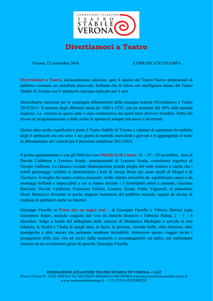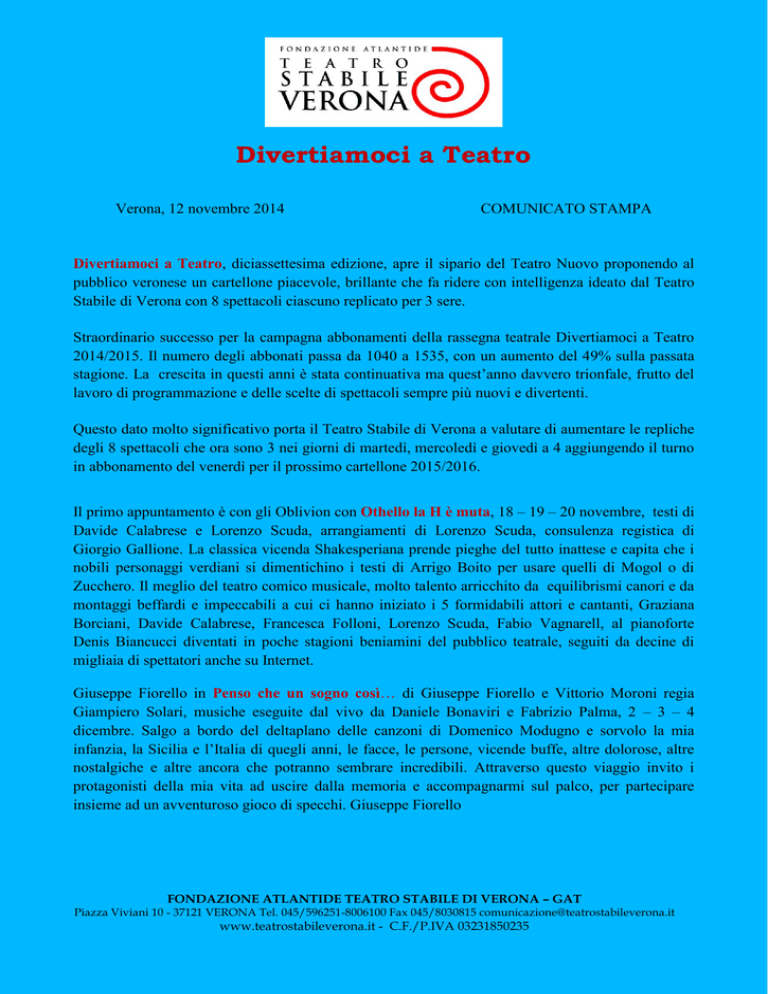Divertiamoci a Teatro Verona, 12 novembre 2014 COMUNICATO STAMPA Divertiamoci a Teatro, diciassettesima edizione, apre il sipario del Teatro Nuovo proponendo al pubblico veronese un cartellone piacevole, brillante che fa ridere con intelligenza ideato dal Teatro Stabile di Verona con 8 spettacoli ciascuno replicato per 3 sere. Straordinario successo per la campagna abbonamenti della rassegna teatrale Divertiamoci a Teatro 2014/2015. Il numero degli abbonati passa da 1040 a 1535, con un aumento del 49% sulla passata stagione. La crescita in questi anni è stata continuativa ma quest’anno davvero trionfale, frutto del lavoro di programmazione e delle scelte di spettacoli sempre più nuovi e divertenti. Questo dato molto significativo porta il Teatro Stabile di Verona a valutare di aumentare le repliche degli 8 spettacoli che ora sono 3 nei giorni di martedì, mercoledì e giovedì a 4 aggiungendo il turno in abbonamento del venerdì per il prossimo cartellone 2015/2016. Il primo appuntamento è con gli Oblivion con Othello la H è muta, 18 – 19 – 20 novembre, testi di Davide Calabrese e Lorenzo Scuda, arrangiamenti di Lorenzo Scuda, consulenza registica di Giorgio Gallione. La classica vicenda Shakesperiana prende pieghe del tutto inattese e capita che i nobili personaggi verdiani si dimentichino i testi di Arrigo Boito per usare quelli di Mogol o di Zucchero. Il meglio del teatro comico musicale, molto talento arricchito da equilibrismi canori e da montaggi beffardi e impeccabili a cui ci hanno iniziato i 5 formidabili attori e cantanti, Graziana Borciani, Davide Calabrese, Francesca Folloni, Lorenzo Scuda, Fabio Vagnarell, al pianoforte Denis Biancucci diventati in poche stagioni beniamini del pubblico teatrale, seguiti da decine di migliaia di spettatori anche su Internet. Giuseppe Fiorello in Penso che un sogno così… di Giuseppe Fiorello e Vittorio Moroni regia Giampiero Solari, musiche eseguite dal vivo da Daniele Bonaviri e Fabrizio Palma, 2 – 3 – 4 dicembre. Salgo a bordo del deltaplano delle canzoni di Domenico Modugno e sorvolo la mia infanzia, la Sicilia e l’Italia di quegli anni, le facce, le persone, vicende buffe, altre dolorose, altre nostalgiche e altre ancora che potranno sembrare incredibili. Attraverso questo viaggio invito i protagonisti della mia vita ad uscire dalla memoria e accompagnarmi sul palco, per partecipare insieme ad un avventuroso gioco di specchi. Giuseppe Fiorello FONDAZIONE ATLANTIDE TEATRO STABILE DI VERONA – GAT Piazza Viviani 10 - 37121 VERONA Tel. 045/596251-8006100 Fax 045/8030815 [email protected] www.teatrostabileverona.it - C.F./P.IVA 03231850235 L'importanza di chiamarsi Ernesto di Oscar Wilde traduzione Masolino D'Amico con Geppy Gleijeses, Marianella Bargilli, Lucia Poli e con in ordine di apparizione Orazio Stracuzzi, Valeria Contadino, Renata Zamengo, Giordana Morandini e Luciano D’Amico, regia Geppy Gleijeses, 9 – 10 – 11 dicembre. E lo spettacolo dei record di pubblico del Teatro Stabile di Calabria, il più visto di sempre in teatri come La Pergola di Firenze, il Goldoni di Venezia, il Franco Parenti di Milano e tanti altri. Questo nuovo allestimento porta in scena la commedia ricca di equivoci carichi di conseguenze comiche incentrate nel gioco di parole earnest (onesto) e il nome Ernest. Un intreccio brillante tra gli inganni dei due protagonisti Jack (Gleijeses) e l’amico Algernon (Bargilli) e le loro passioni amorose. Per questa stagione vista la grande richiesta si è deciso di aggiungere una data venerdì 12 dicembre. Claudio Bisio in Father and son ispirato a “Gli Sdraiati” e “Breviario comico”) di Michele Serra e con i musicisti Laura Masotto (violino), Marco Bianchi (chitarra) per la regia Giorgio Gallione, 21 – 22 – 23 gennaio. Lo spettacolo tratta la tematica padre/figlio senza pudori e con un linguaggio tra l'ironico e il doloroso, tra il comico e il tragico, innescando riflessioni sull’attuale futuro dei nostri figli, sui concetti di libertà e di autorità. Porta a galla una società inadeguata di padri nevrotici e di figli isolati sprezzanti del confronto. Dalla mancanza di rapporto nasce un monologo interiore del padre invadente quanto il figlio è assente a tratti spudoratamente sincero. Gli ingredienti per questo ritorno al teatro di Claudio Bisio sono inventiva, comicità, moralità in un testo di grande enfasi emotiva e teatrale, comica ed etica al tempo stesso. Mi piaci perché sei così con Vanessa Incontrada, Gabriele Pignotta, Fabio Avaro e Siddharta Prestinari 3 – 4 – 5 febbraio. Scritto e diretto da Gabriele Pignotta. Dopo la passione iniziale, Marco e Monica, sposi da qualche anno, iniziano ad avere i primi screzi e i primi cenni di noia e quando la loro storia sembra essere arrivata alla deriva, provano una terapia di coppia sperimentale che metterà i due protagonisti in condizione di vedere il mondo con gli occhi dell’altro, tre mesi nei panni del partner . Mentre i loro vicini, Stefano e Francesca, rappresentano la classica coppia di facciata, felici agli occhi degli altri, ma in realtà si detestano profondamente e non hanno il coraggio di dirselo. La vita di queste due coppie si intreccerà fino a quando il coperchio salterà e nasceranno situazioni bizzarre e di puro divertimento. Il nuovo spettacolo di Teresa Mannino, 17 – 18 – 19 febbraio, con Sono nata il ventitrè, attraversa strade e temi diversi e istintivi: l'amore, la vita, il tradimento, gli uomini e le donne, la passione per la conoscenza e per la propria terra. E con la stessa passione racconterà i tormenti di Penelope e quelli della vicina di casa. Si rifarà alle donne, eroine e non, dei classici, per dare consigli e consolare, soprattutto, le amiche con problemi di cuore. Filosofa su carta e nello spirito, non smette mai di conoscere e sapere, raccontare e raccontarsi purché i fatti siano epici oppure siano sempre reali o realmente accaduti e questa volta, più che mai, lo farà senza rete e 