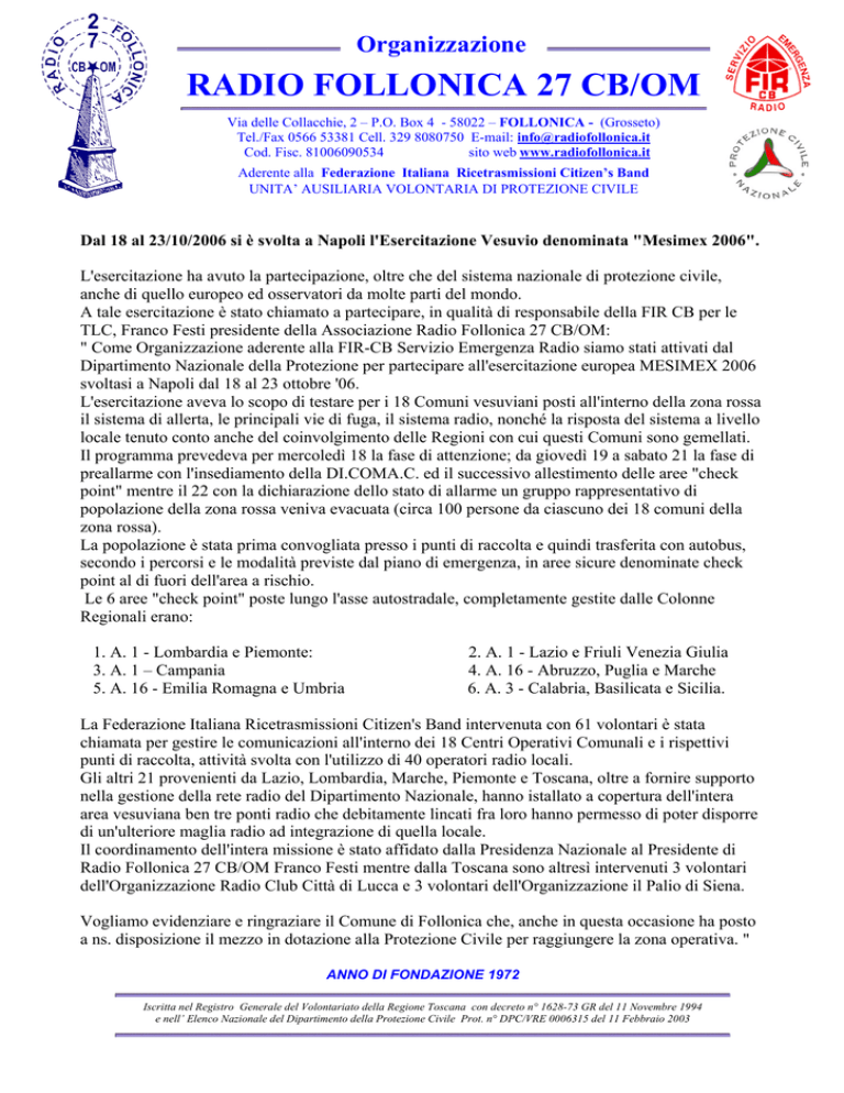 Organizzazione RADIO FOLLONICA 27 CB/OM Via delle Collacchie, 2 – P.O. Box 4 - 58022 – FOLLONICA - (Grosseto) Tel./Fax 0566 53381 Cell. 329 8080750 E-mail: [email protected] Cod. Fisc. 81006090534 sito web www.radiofollonica.it Aderente alla Federazione Italiana Ricetrasmissioni Citizen’s Band UNITA’ AUSILIARIA VOLONTARIA DI PROTEZIONE CIVILE Dal 18 al 23/10/2006 si è svolta a Napoli l'Esercitazione Vesuvio denominata "Mesimex 2006". L'esercitazione ha avuto la partecipazione, oltre che del sistema nazionale di protezione civile, anche di quello europeo ed osservatori da molte parti del mondo. A tale esercitazione è stato chiamato a partecipare, in qualità di responsabile della FIR CB per le TLC, Franco Festi presidente della Associazione Radio Follonica 27 CB/OM: " Come Organizzazione aderente alla FIR-CB Servizio Emergenza Radio siamo stati attivati dal Dipartimento Nazionale della Protezione per partecipare all'esercitazione europea MESIMEX 2006 svoltasi a Napoli dal 18 al 23 ottobre '06. L'esercitazione aveva lo scopo di testare per i 18 Comuni vesuviani posti all'interno della zona rossa il sistema di allerta, le principali vie di fuga, il sistema radio, nonché la risposta del sistema a livello locale tenuto conto anche del coinvolgimento delle Regioni con cui questi Comuni sono gemellati. Il programma prevedeva per mercoledì 18 la fase di attenzione; da giovedì 19 a sabato 21 la fase di preallarme con l'insediamento della DI.COMA.C. ed il successivo allestimento delle aree "check point" mentre il 22 con la dichiarazione dello stato di allarme un gruppo rappresentativo di popolazione della zona rossa veniva evacuata (circa 100 persone da ciascuno dei 18 comuni della zona rossa). La popolazione è stata prima convogliata presso i punti di raccolta e quindi trasferita con autobus, secondo i percorsi e le modalità previste dal piano di emergenza, in aree sicure denominate check point al di fuori dell'area a rischio. Le 6 aree "check point" poste lungo l'asse autostradale, completamente gestite dalle Colonne Regionali erano: 1. A. 1 - Lombardia e Piemonte: 3. A. 1 – Campania 5. A. 16 - Emilia Romagna e Umbria 2. A. 1 - Lazio e Friuli Venezia Giulia 4. A. 16 - Abruzzo, Puglia e Marche 6. A. 3 - Calabria, Basilicata e Sicilia. La Federazione Italiana Ricetrasmissioni Citizen's Band intervenuta con 61 volontari è stata chiamata per gestire le comunicazioni all'interno dei 18 Centri Operativi Comunali e i rispettivi punti di raccolta, attività svolta con l'utilizzo di 40 operatori radio locali. Gli altri 21 provenienti da Lazio, Lombardia, Marche, Piemonte e Toscana, oltre a fornire supporto nella gestione della rete radio del Dipartimento Nazionale, hanno istallato a copertura dell'intera area vesuviana ben tre ponti radio che debitamente lincati fra loro hanno permesso di poter disporre di un'ulteriore maglia radio ad integrazione di quella locale. Il coordinamento dell'intera missione è stato affidato dalla Presidenza Nazionale al Presidente di Radio Follonica 27 CB/OM Franco Festi mentre dalla Toscana sono altresì intervenuti 3 volontari dell'Organizzazione Radio Club Città di Lucca e 3 volontari dell'Organizzazione il Palio di Siena. Vogliamo evidenziare e ringraziare il Comune di Follonica che, anche in questa occasione ha posto a ns. disposizione il mezzo in dotazione alla Protezione Civile per raggiungere la zona operativa. " ANNO DI FONDAZIONE 1972 Iscritta nel Registro Generale del Volontariato della Regione Toscana con decreto n° 1628-73 GR del 11 Novembre 1994 e nell’ Elenco Nazionale del Dipartimento della Protezione Civile Prot. n° DPC/VRE 0006315 del 11 Febbraio 2003