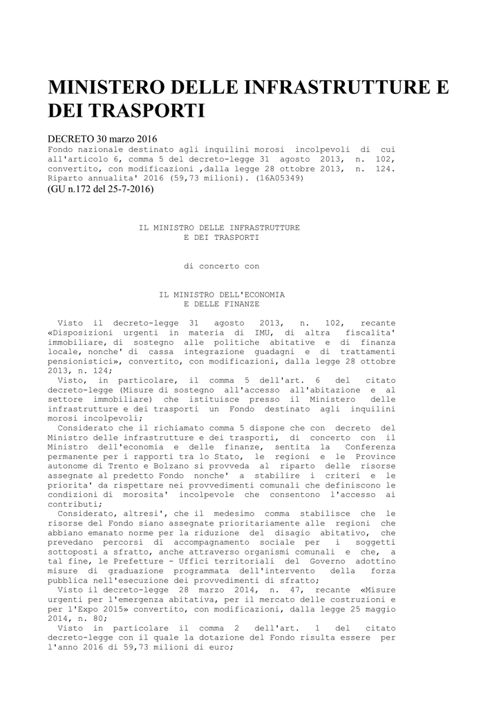 MINISTERO DELLE INFRASTRUTTURE E DEI TRASPORTI DECRETO 30 marzo 2016 Fondo nazionale destinato agli inquilini morosi incolpevoli di cui all'articolo 6, comma 5 del decreto-legge 31 agosto 2013, n. 102, convertito, con modificazioni ,dalla legge 28 ottobre 2013, n. 124. Riparto annualita' 2016 (59,73 milioni). (16A05349) (GU n.172 del 25-7-2016) IL MINISTRO DELLE INFRASTRUTTURE E DEI TRASPORTI di concerto con IL MINISTRO DELL'ECONOMIA E DELLE FINANZE Visto il decreto-legge 31 agosto 2013, n. 102, recante «Disposizioni urgenti in materia di IMU, di altra fiscalita' immobiliare, di sostegno alle politiche abitative e di finanza locale, nonche' di cassa integrazione guadagni e di trattamenti pensionistici», convertito, con modificazioni, dalla legge 28 ottobre 2013, n. 124; Visto, in particolare, il comma 5 dell'art. 6 del citato decreto-legge (Misure di sostegno all'accesso all'abitazione e al settore immobiliare) che istituisce presso il Ministero delle infrastrutture e dei trasporti un Fondo destinato agli inquilini morosi incolpevoli; Considerato che il richiamato comma 5 dispone che con decreto del Ministro delle infrastrutture e dei trasporti, di concerto con il Ministro dell'economia e delle finanze, sentita la Conferenza permanente per i rapporti tra lo Stato, le regioni e le Province autonome di Trento e Bolzano si provveda al riparto delle risorse assegnate al predetto Fondo nonche' a stabilire i criteri e le priorita' da rispettare nei provvedimenti comunali che definiscono le condizioni di morosita' incolpevole che consentono l'accesso ai contributi; Considerato, altresi', che il medesimo comma stabilisce che le risorse del Fondo siano assegnate prioritariamente alle regioni che abbiano emanato norme per la riduzione del disagio abitativo, che prevedano percorsi di accompagnamento sociale per i soggetti sottoposti a sfratto, anche attraverso organismi comunali e che, a tal fine, le Prefetture - Uffici territoriali del Governo adottino misure di graduazione programmata dell'intervento della forza pubblica nell'esecuzione dei provvedimenti di sfratto; Visto il decreto-legge 28 marzo 2014, n. 47, recante «Misure urgenti per l'emergenza abitativa, per il mercato delle costruzioni e per l'Expo 2015» convertito, con modificazioni, dalla legge 25 maggio 2014, n. 80; Visto in particolare il comma 2 dell'art. 1 del citato decreto-legge con il quale la dotazione del Fondo risulta essere per l'anno 2016 di 59,73 milioni di euro; Visto il decreto interministeriale 14 maggio 2014 registrato alla Corte dei conti - Ufficio di controllo atti Ministero delle infrastrutture e dei trasporti e del Ministero dell'ambiente e della tutela del territorio e del mare - in data 24 giugno 2014, registro n. 1, foglio n. 2762, pubblicato nella Gazzetta Ufficiale n. 161 del 14 luglio 2014 con il quale e' stato effettuato il riparto delle risorse assegnate al Fondo per l'anno 2014, nonche' individuati i criteri per il riparto della disponibilita' del Fondo medesimo nonche' quelli per la definizione di morosita' incolpevole, per l'accesso, il dimensionamento dei contributi e le priorita' nella concessione dei contributi e fornite indicazioni per l'adozione, da parte dei comuni, di misure alla graduazione programmata dell'intervento della forza pubblica e modalita' per il monitoraggio per l'utilizzo delle risorse ripartite; Visto il comma 109 dell'art. 2 della legge 23 dicembre 2009, n. 191, con il quale sono stati abrogati, a decorrere dal 1° gennaio 2010, gli articoli 5 e 6 della legge 30 novembre 1989, n. 386, e che conseguentemente non sono dovute alle province autonome di Trento e Bolzano erogazioni a carico del bilancio dello Stato previste da leggi di settore; Visto il rapporto dell'Ufficio centrale di statistica del Ministero dell'interno sugli sfratti in Italia pubblicato nel maggio 2015 relativo agli sfratti registrati nel territorio nazionale nel 2014; Considerato che, a seguito di richiesta dell'ANCI, la Presidenza del Consiglio dei ministri ha ritenuto opportuno sottoporre alla Conferenza unificata anziche' alla Conferenza Stato-regioni, i decreti di riparto relativi al 2014, come invece previsto dall'art. 6, comma 5, del richiamato decreto-legge 31 agosto 2013, n. 102; Ritenuto di procedere ad un sollecito riparto della suddetta disponibilita' per l'anno 2016 di euro 59,73 milioni al fine di dare ulteriori risposte al disagio abitativo degli inquilini morosi incolpevoli; Considerata la necessita' di procedere alla revisione dei criteri, delle procedure e delle modalita' di accesso ai contributi al fine di rendere maggiormente efficace l'utilizzo delle risorse assegnate al Fondo anche in considerazione del carattere innovativo che il Fondo inquilini morosi incolpevoli riveste adottando un nuovo decreto interministeriale; Sentita la Conferenza unificata nella seduta dell'11 febbraio 2016 sulla proposta effettuata dal Ministro delle infrastrutture e dei trasporti, di concerto con il Ministro dell'economia e delle finanze; Ai sensi dell'art. 1, comma 2, del menzionato decreto-legge 28 marzo 2014, n. 47, convertito, con modificazioni, dalla legge 25 maggio 2014, n. 80 e dell'art. 6, comma 5 del menzionato decreto-legge 31 agosto 2013, convertito, con modificazioni, dalla legge 28 ottobre 2013, n. 124; Decreta: Art. 1 Riparto della dotazione assegnata per l'anno 2016 1. La disponibilita' complessiva di euro 59,73 milioni, relativa all'annualita' 2016, del Fondo destinato agli inquilini morosi incolpevoli di cui all'art. 6, comma 5, del decreto-legge 31 agosto 2013, n. 102, convertito, con modificazioni, dalla legge 28 ottobre 2013, n. 124, attribuita dal comma 2 dell'art. 1 del decreto-legge 28 marzo 2014, n. 47, e' ripartita in proporzione al numero di provvedimenti di sfratto per morosita' emessi, registrato dal Ministero dell'interno al 31 dicembre 2014, per il 30% tra le Regioni Piemonte, Lombardia, Liguria, Emilia Romagna, Toscana, Marche, Umbria, Lazio, Campania, Puglia, Sicilia e, per il resta