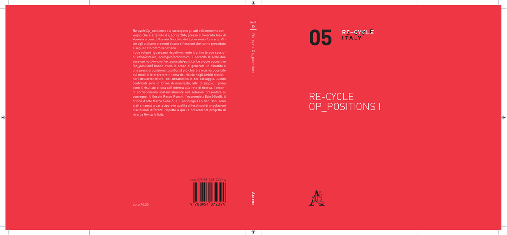 Re-It 05 isbn 05 RE-CYCLE OP_POSITIONS I 978-88-548-7239-4 Aracne euro 30,00 Re-cycle Op_positions I Re-cycle Op_positions I e II raccolgono gli atti dell’omonimo convegno che si è tenuto il 4 aprile 2014 presso l’Università Iuav di Venezia a cura di Renato Bocchi e del Laboratorio Re-cycle. Oltre agli atti sono presenti alcune riflessioni che hanno preceduto e seguito l'incontro veneziano. I due volumi riguardano rispettivamente il primo le due sessioni etico/estetico, ecologico/economico, il secondo le altre due sessioni noto/innovativo, autoriale/politico. Le coppie oppositive (op_positions) hanno avuto lo scopo di generare un dibattito e una presa di posizione (positions) più chiara e incisiva possibile sui modi di interpretare il tema del riciclo negli ambiti disciplinari dell’architettura, dell’urbanistica e del paesaggio. Alcuni contributi sono in forma di manifesto, altri di saggio: i primi sono il risultato di una call interna alla rete di ricerca, i secondi corrispondono sostanzialmente alle relazioni presentate al convegno. Il filosofo Rocco Ronchi, l’economista Ezio Micelli, il critico d’arte Marco Senaldi e il sociologo Federico Boni sono stati chiamati a partecipare in qualità di testimoni di angolazioni disciplinari differenti rispetto a quelle presenti nel progetto di ricerca Re-cycle Italy. 1 RE-CYCLE OP_POSITIONS I A CURA DI SARA MARINI SISSI CESIRA ROSELLI 2 Progetto grafico di Sara Marini e Sissi Cesira Roselli Copyright © MMXIV ARACNE editrice S.r.l. www.aracneeditrice.it [email protected] via Raffaele Garofalo, 133/A–B 00173 Roma (06) 93781065 ISBN 978-88-548-7239-4 I diritti di traduzione, di memorizzazione elettronica, di riproduzione e di adattamento anche parziale, con qualsiasi mezzo, sono riservati per tutti i Paesi. Non sono assolutamente consentite le fotocopie senza il permesso scritto dell’Editore. I edizione: giugno 2014 3 PRIN 2013/2016 Progetti di Ricerca di Interesse Nazionale Area Scientifico-disciplinare 08: Ingegneria civile ed Architettura 100% Unità di Ricerca Università Iuav di Venezia Università degli Studi di Trento Politecnico di Milano Politecnico di Torino Università degli Studi di Genova Università degli Studi di Roma "La Sapienza" Università degli Studi di Napoli "Federico II" Università degli Studi di Palermo Università degli Studi "Mediterranea" di Reggio Calabria Università degli Studi "G. d’Annunzio" Chieti-Pescara Università degli Studi di Camerino 4 Re-cycle Op_positions I e II raccolgono gli atti dell'omonimo convegno che si è tenuto il 4 aprile 2014 presso l'Università Iuav di Venezia a cura di Renato Bocchi e del Laboratorio Recycle. Oltre agli atti sono presenti alcune riflessioni che hanno preceduto e seguito l'incontro veneziano. Il Laboratorio Re-cycle è un tavolo che vede lavorare assieme i responsabili degli undici laboratori presenti nei diversi Atenei coinvolti nella ricerca: Sara Marini e Stefano Munarin per l'Università Iuav di Venezia, Chiara Rizzi per l'Università di Trento, Andrea Gritti per il Politecnico di Milano, Mauro Berta per il Politecnico di Torino, Raffaella Fagnoni e Alberto Bertagna per l'Università di Genova, Francesca Romana Castelli per L'Università di Roma "La Sapienza", Fabrizia Ippolito per l'Università "Federico II" di Napoli, Daniele Ronsivalle per l'Università di Palermo, Consuelo Nava per l'Università "Mediterranea" di Reggio Calabria, Francesca Pignatelli per l'Università "Gabriele d'Annunzio" di Chieti Pescara, Giulia Menzietti per l'Università di Camerino. Hanno lavorato alla segreteria del convegno Sissi Cesira Roselli e Vincenza Santangelo dell'Università Iuav di Venezia. 5 Indice re-cycle Re-cycled Paper Renato Bocchi 13 Il territorio reale e il territorio dell'architettura Sara Marini 22 OP_POSITIONS (Ri)costruire il senso. Verso un marchio di qualità Re-cycle Italy Raffaella Fagnoni 33 Alcune questioni... per una teoria del re-cycle Giulia Menzietti 38 Il carattere sovversivo del riciclo Chiara Rizzi 44 L'assedio, ovvero per una tattica di uscita dai confini del riciclo Daniele Ronsivalle 49 etico/estetico Il bello e il buono di Re-cycle Andrea Gritti 57 6 Il filosofo e i resti Rocco Ronchi 65 Frammenti e dintorni. Divagazioni etiche e derive estetiche Matteo Aimini 73 La metafora del Riciclo Sara Favargiotti 83 Objet trouvé o ready-made? Enrico Formato 90 I'm so vain. Just, don't waste me away Maria Clara Ghia 96 Que lo hermoso sea poderoso. Una conversazione virtuale con Ramon Folch Stefania Staniscia 103 Il progetto di riciclo potrà incidere sul nostro spazio di vita se saprà costruire i termini semplici di un nuovo codice urbano e paesistico Federico Zanfi 107 Il processo come estetica del riciclo Guya Bertelli, Juan Carlos Dall'Asta, Paola Bracchi, Giuliana Bonifati 114 Il paesaggio imperfetto Gianni Celestini 116 Il progetto dell'emergenza. Etica = Estetica condivisa: "La bellezza salverà il mondo" Barbara Coppetti, Andrea Di Franco, Mauro Marinelli, Alisia Tognon 118 Re-cycle [è] può essere etico/estetico. Derive e potenzialità di un paradigma ancora da scrivere Carlo Deregibus 120 7 Re-cycle. Visione e pensiero Giovanni Hänninen 122 Discarica paesaggio Venera Leto 124 Recycle (Upcycle) urbano è... e perchè. Strategia per la rete del verde locale a favore di un ritorno dell'etica disciplinare nel progetto della città Lucia Nucci 126 La bellezza del giusto Adriano Paolella 128 Riciclo [compimento] estetico [est]etico del margin[al]e Luca Zecchin 130 ECONOMICO/ECOLOGICO Total Recycle Design/Total Recycle Process Consuelo Nava 135 Il recycle come opzione e come necessità. Le condizioni economiche del riuso tra stagnazione e ripresa Ezio Micelli 142 Cycle vs Re-cycle Marco Bovati, Cassandra Cozza 152 Sguardi rovesci, strabici Emanuel Lancerini 159 Oltre le retoriche del green e dello smart ci sono un’economia e un’urbanistica fatte di manutenzione innovativa e trasformatrice Arturo Lanzani 165 Progetti e rifiuti Rosario Pav