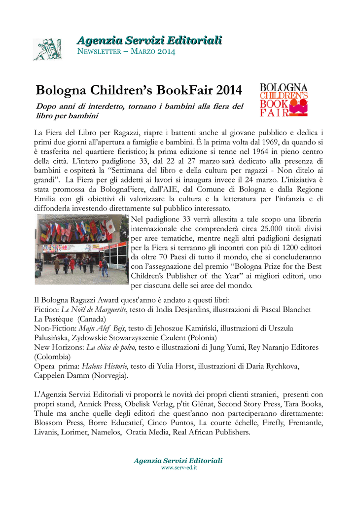 Agenzia Servizi Editoriali NEWSLETTER – MARZO 2014 Bologna Children’s BookFair 2014 Dopo anni di interdetto, tornano i bambini alla fiera del libro per bambini La Fiera del Libro per Ragazzi, riapre i battenti anche al giovane pubblico e dedica i primi due giorni all’apertura a famiglie e bambini. È la prima volta dal 1969, da quando si è trasferita nel quartiere fieristico; la prima edizione si tenne nel 1964 in pieno centro della città. L’intero padiglione 33, dal 22 al 27 marzo sarà dedicato alla presenza di bambini e ospiterà la “Settimana del libro e della cultura per ragazzi - Non ditelo ai grandi”. La Fiera per gli addetti ai lavori si inaugura invece il 24 marzo. L’iniziativa è stata promossa da BolognaFiere, dall’AIE, dal Comune di Bologna e dalla Regione Emilia con gli obiettivi di valorizzare la cultura e la letteratura per l’infanzia e di diffonderla investendo direttamente sul pubblico interessato. Nel padiglione 33 verrà allestita a tale scopo una libreria internazionale che comprenderà circa 25.000 titoli divisi per aree tematiche, mentre negli altri padiglioni designati per la Fiera si terranno gli incontri con più di 1200 editori da oltre 70 Paesi di tutto il mondo, che si concluderanno con l’assegnazione del premio “Bologna Prize for the Best Children’s Publisher of the Year” ai migliori editori, uno per ciascuna delle sei aree del mondo. Il Bologna Ragazzi Award quest'anno è andato a questi libri: Fiction: Le Noël de Marguerite, testo di India Desjardins, illustrazioni di Pascal Blanchet La Pastèque (Canada) Non-Fiction: Majn Alef Bejs, testo di Jehoszue Kamiński, illustrazioni di Urszula Palusińska, Zydowskie Stowarzyszenie Czulent (Polonia) New Horizons: La chica de polvo, testo e illustrazioni di Jung Yumi, Rey Naranjo Editores (Colombia) Opera prima: Halens Historie, testo di Yulia Horst, illustrazioni di Daria Rychkova, Cappelen Damm (Norvegia). L'Agenzia Servizi Editoriali vi proporrà le novità dei propri clienti stranieri, presenti con propri stand, Annick Press, Obelisk Verlag, p'tit Glénat, Second Story Press, Tara Books, Thule ma anche quelle degli editori che quest'anno non parteciperanno direttamente: Blossom Press, Borre Educatief, Cinco Puntos, La courte échelle, Firefly, Fremantle, Livanis, Lorimer, Namelos, Oratia Media, Real African Publishers. Agenzia Servizi Editoriali www.serv-ed.it Il 22 marzo è il giorno dell'editoria indipendente ! Un'iniziativa mondiale a sostegno dell'editoria indipendente: indiebookday – 22 marzo 2014 L'iniziativa, lanciata lo scorso anno in Germania attraverso i social network, viene riproposta quest'anno a livello mondiale. L'appello è rivolto a tutti i lettori che amano i libri belli e originali e sono consapevoli dell'importanza dell'opera svolta dagli editori indipendenti. A loro si chiede di andare, sabato 22 marzo, in una libreria, meglio se indipendente, e comprare un libro di un editore indipendente. Poi si dovrà postare una foto di se stessi con il libro in mano, o semplicemente della copertina del libro, su un social network (Facebook, Twitter, Google+...) o sul proprio blog, utilizzando l'hashtag "#indiebookday". Background info In giro per il mondo ci sono tanti editori indipendenti che creano libri fantastici, animati prima di tutto da una grande passione. Molti, però, non hanno la visibilità che meriterebbero. L'Indiebookday vuole contribuire a mettere in primo piano il loro impegno. http://www.indiebookday.de/ Edition Nautilus compie quarant'anni La casa editrice di Amburgo annuncia con orgoglio che il 1° aprile festeggerà i quarant'anni della propria attività. L'anniversario sarà celebrato, a partire dalla Fiera di Lipsia, con una serie di iniziative che proseguiranno nel corso di tutto l'anno. In questi quarant'anni, Edition Nautilus ha pubblicato circa 900 titoli, dei quali attualmente almeno 345 ancora in catalogo. Tra questi si evidenziano i 63 titoli della Kleinen Bücherei für Hand und Kopf, i 14 volumi delle opere complete di Franz Jung, i 19 fascicoli della collana di polizieschi Kaliber 64, nove edizioni dell'agenda letteraria, trentun numeri di di “Revolte!” e – orgogliosamente - 220 numeri di “Aktion”, infine, same procedure as every year, sette variazioni di Dinner for One. www.edition-nautilus.de Agenzia Servizi Editoriali www.serv-ed.it Gli editori tedeschi di sinistra in uno spazio collettivo alla Fiera di Lipsia Anche nel 2014, gli editori di sinistra presenti alla Fiera di Lipsia condividono lo spazio di una Leseinsel (Padiglione 5, Stand 404 C) . Dal 13 al 16 marzo vi saranno i libri e gli autori di Argument Verlag con Ariadne Hamburg, la BasisDruck Verlag di Berlino, J & D Dagyeli Verlag di Berlino, Dietz di Berlino, l'editore Graswurzelrevolution di Friburgo, LAIKA Verlag di Amburgo, Mandelbaum Verlag di Vienna, il quotidiano socialista neues deutschland, Offizin Verlag di Hannover, Pahl-Rugenstein Verlag di Bonn, PapyRossa Verlag di Colonia, Promedia Verlag di Vienna, Unrast Verlag di Münster e VSA: Verlag di Amburgo. La Fiera del Libro di Lipsia ha offerto questo spazio gratuitamente, mentre i costi per le attrezzature, i programmi e il materiale informativo godono anche quest'anno dei contributi della Fondazione Rosa Luxemburg di Berlino. Un po' di storia: dal “Red Carpet” al “Palcoscenico” Buchmesse – Nel 2008 alcuni incorreggibili testardi avanzano l'idea di dare udienza a Francoforte a un pubblico di lettori di sinistra o organizzano uno stand che si chiama Auf dem Roten Teppich - “Sul tappeto rosso” (che la fiera si è fatta pagare per bene). C'è una grande collaborazione, tutti danno una mano, ogni mezz'ora viene presentato un nuovo libro. Il programma è interessante e attira molti visitatori. Dopo tre fiere, però, a Francoforte non si può più stare. Lipsia allora ? Simone Barrientos [ Editore di Kulturmaschinen che , purtroppo , non è presente quest'anno ] riesce a portare undici editori sul palc