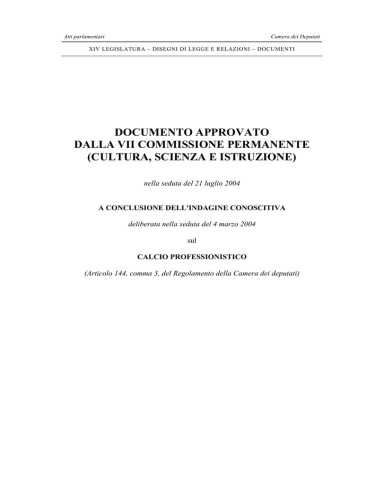 Atti parlamentari Camera dei Deputati XIV LEGISLATURA − DISEGNI DI LEGGE E RELAZIONI − DOCUMENTI DOCUMENTO APPROVATO DALLA VII COMMISSIONE PERMANENTE (CULTURA, SCIENZA E ISTRUZIONE) nella seduta del 21 luglio 2004 A CONCLUSIONE DELL'INDAGINE CONOSCITIVA deliberata nella seduta del 4 marzo 2004 sul CALCIO PROFESSIONISTICO (Articolo 144, comma 3, del Regolamento della Camera dei deputati) Atti parlamentari Camera dei Deputati XIV LEGISLATURA − DISEGNI DI LEGGE E RELAZIONI − DOCUMENTI INDICE Premessa ..................................................................................... Pag. 5 Parte prima – Le risultanze dell’indagine: dati e opinioni ..... 1. L’evoluzione del quadro normativo .................................. 2. La trasformazione del mondo del calcio negli ultimi anni . 3. Problematiche attinenti all’equilibrio economico-finanziario delle societa` professionistiche ..................................... 3.1. Retribuzioni dei calciatori ............................................. 3.2. Altri elementi di squilibrio ............................................. 3.3. Elementi di raffronto con gli altri paesi ....................... 3.4. Commercializzazione e utilizzo dei diritti televisivi e dei marchi ....................................................................... 3.5. Sistema dei controlli e delle sanzioni ............................ 4. Stato giuridico dei calciatori e attivita` dei procuratori ...... 5. Credito sportivo e privatizzazione degli stadi ................. 6. La questione della violenza negli stadi ............................ 7. Calcio dilettantistico e attivita` sportiva giovanile ........... Parte seconda – Indirizzi conclusivi ..................................... 1. Premessa ................................................................................ 2. Revisione del sistema di mutualita` ................................... 3. Interventi per il riequilibrio finanziario delle singole societa` .................................................................................... 4. La questione degli stadi ...................................................... 5. La prevenzione di fenomeni di violenza negli stadi ...... 6. Il rilancio della questione etica ......................................... » » » 9 11 14 » » » » 17 18 19 22 » » » » » » » » » 23 25 29 30 32 34 37 39 40 » » » » 44 46 49 49 Atti parlamentari Camera dei Deputati XIV LEGISLATURA − DISEGNI DI LEGGE E RELAZIONI − DOCUMENTI PREMESSA Il malessere che attraversa il mondo del calcio professionistico è da tempo sotto gli occhi di tutti e il dibattito sull'individuazione di rimedi adeguati alla gravità della situazione è aperto in tutto il paese. Il recente richiamo del Presidente della Repubblica Carlo Azeglio Ciampi viene a sottolineare una volta di più, con particolare autorevolezza, la necessità che ciascuno faccia la propria parte per promuovere la rigenerazione di questo importante settore. L'indagine conoscitiva sul calcio professionistico della VII Commissione (Cultura, scienza e istruzione) della Camera dei deputati è stata deliberata il 4 marzo 2004, proprio nell'intento di acquisire una visione d'insieme delle dinamiche evolutive del fenomeno calcistico, che consentisse al Parlamento e al Governo di sottrarsi alla logica degli interventi emergenziali e di definire, nel confronto con tutte le componenti sociali ed economiche interessate, linee di indirizzo e orientamenti condivisi per uno sviluppo equilibrato e sostenibile dell'intera organizzazione calcistica. Tale esigenza ha preso le mosse dalla considerazione che il mondo del calcio sta attraversando ormai da lungo tempo una fase di evoluzione che ha progressivamente modificato l'equilibrio tra la dimensione propriamente sportiva e quella spettacolare del fenomeno, con il conseguente mutamento delle tradizionali modalità di fruizione e percezione dello spettacolo calcistico, anche a scapito, specie nei campionati minori, della partecipazione diretta del pubblico all'evento sportivo. Si è verificata una profonda alterazione dei tradizionali equilibri organizzativi e finanziari del sistema e dei rapporti tra le sue diverse componenti, che ha determinato contrapposizioni di interessi sempre più evidenti tra le società di vertice, inserite in un circuito sportivo e spettacolare di livello europeo, le società minori degli stessi campionati professionistici, le società dilettantistiche e di base. Il tutto con ricadute non limitate al mondo del calcio, ma estese all'intera organizzazione sportiva del paese, la cui principale fonte di finanziamento, specie per quanto riguarda le discipline minori, è tuttora rappresentata dai proventi dei concorsi pronostici gestiti dal CONI. In questo ambito, infatti, il gettito dei concorsi connessi con le manifestazioni calcistiche, dai quali deriva la parte assolutamente preponderante delle entrate per concorsi pronostici, ha registrato una progressiva flessione cui non sembrano estranee le nuove modalità di svolgimento frazionato nel tempo dei campionati professionistici, imposte dalle esigenze di diffusione televisiva. Atti parlamentari Camera dei Deputati XIV LEGISLATURA − DISEGNI DI LEGGE E RELAZIONI − DOCUMENTI Le emergenze finanziarie e amministrative che negli ultimi anni hanno interessato l'organizzazione calcistica, inducendo il Governo ad adottare provvedimenti d'urgenza per evitare il dissesto delle società professionistiche e consentire l'avvio dei campionati, sono evidentemente e direttamente ricollegabili alle dinamiche del processo sopra sommariamente descritto; nello stesso contesto sembra tuttavia che debbano essere collocate anche altre questioni, di non minore rilevanza sociale e culturale, che riguardano ad esempio la necessità di tutela e valorizzazione dell'attività calcistica giovanile e di quella dilettantistica, ovvero il contrasto ai fenomeni di violenza all'interno e all'esterno degli stadi. È apparso pertan