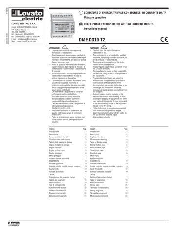 31100160 I CONTATORE DI ENERGIA TRIFASE CON INGRESSI DI CORRENTE DA TA Manuale operativo I333 I GB 08 13 LOVATO ELECTRIC S.P.A. 24020 GORLE (BERGAMO) ITALIA VIA DON E. MAZZA, 12 TEL. 035 4282111 FAX (Nazionale): 035 4282200 FAX (International): +39 035 4282400 E-mail [email protected] Web www.LovatoElectric.com GB THREE-PHASE ENERGY METER WITH CT CURRENT INPUTS Instructions manual DME D310 T2 ATTENZIONE!! – Leggere attentamente il manuale prima dell’utilizzo e l’installazione. – Questi apparecchi devono essere installati da personale qualificato, nel rispetto delle vigenti normative impiantistiche, allo scopo di evitare danni a persone o cose. – Prima di qualsiasi intervento sullo strumento, togliere tensione dagli ingressi di misura e di alimentazione e cortocircuitare i trasformatori di corrente. – Il costruttore non si assume responsabilità in merito alla sicurezza elettrica in caso di utilizzo improprio del dispositivo. – I prodotti descritti in questo documento sono suscettibili in qualsiasi momento di evoluzioni o di modifiche. Le descrizioni ed i dati a catalogo non possono pertanto avere alcun valore contrattuale. – Un interruttore o disgiuntore va compreso nell’impianto elettrico dell’edificio. Esso deve trovarsi in stretta vicinanza dell’apparecchio ed essere facilmente raggiungibile da parte dell’operatore. Deve essere marchiato come il dispositivo di interruzione dell’apparecchio: IEC/EN 61010-1 § 6.11.2. – Installare lo strumento in contenitore e/o quadro elettrico con grado di protezione minimo IP51. – Pulire lo strumento con panno morbido, non usare prodotti abrasivi, detergenti liquidi o solventi. WARNING! – Carefully read the manual before the installation or use. – This equipment is to be installed by qualified personnel, complying to current standards, to avoid damages or safety hazards. – Before any service operation on the device, remove all the voltages from measuring and supply inputs and short-circuit the CT input terminals. – The manufacturer cannot be held responsible for electrical safety in case of improper use of the equipment. – Products illustrated herein are subject to alteration and changes without prior notice. Technical data and descriptions in the documentation are accurate, to the best of our knowledge, but no liabilities for errors, omissions or contingencies arising there from are accepted. – A circuit breaker must be included in the electrical installation of the building. It must be installed close by the equipment and within easy reach of the operator. It must be marked as the disconnecting device of the equipment: IEC/EN 61010-1 § 6.11.2. – Fit the instrument in an enclosure or cabinet with minimum IP51 protection degree. – Clean the instrument with a soft dry cloth; do not use abrasive products, liquid detergents or solvents. INDICE Introduzione Descrizione Funzione dei tasti frontali Visualizzazione delle misure Tabella delle pagine del display Pagina contatori di energia Pagina contaore Pagina grafico trend Pagina contatori Menu principale Accesso tramite password Espandibilità Risorse aggiuntive Ingressi, uscite, variabili interne, contatori Soglie limite Variabili da remoto Tariffe Impostazione dei parametri (setup) Tabella dei parametri Menu comandi Test di collegamento Caratteristiche tecniche Schemi di connessione Disposizione morsetti Dimensioni meccaniche INDEX Page Introduction 2 Description 2 Keyboard functions 2 Measurement viewing 3 Table of display pages 4 Energy meters page 5 Hour counters page 5 Trend graph page 5 Counters page 6 Main menu 7 Password access 7 Expandability 8 Additional resources 9 Inputs, outputs, internal variables, counters 9 Limit thresholds 10 Remote-controlled variables 10 Tariffs 11 Setting of parameters (setup) 11 Table of parameters 13 Commands menu 20 Wiring test 21 Technical characteristics 23 Wiring diagrams 24 Terminal arrangement 24 Mechanical dimensions 24 Pag. 2 2 2 3 4 5 5 5 6 7 7 8 9 9 10 10 11 11 13 20 21 22 24 24 24 1 31100160 I333 I GB 08 13 2 INTRODUZIONE Il contatore di energia DME310T2 è stato progettato per unire la massima semplicità di utilizzo con una ampia scelta di funzioni avanzate. L’ottima accuratezza delle misure, la semplicità di installazione e di utilizzo ne fanno una scelta ottimale per la gestione ed il monitoraggio dei consumi di energia. Il display grafico LCD consente una interfaccia utente chiara ed intuitiva. L’interfaccia ottica ad infrarossi consente l’espansione tramite la vasta gamma di moduli EXM. INTRODUCTION The DME310T2 energy meter has been designed to combine the maximum possible ease of operation together with a wide choice of advanced functions. The great accuracy, the ease of installation and operation make it an optimal choice for energy management and cost allocation tasks. The graphic LCD display offers a clear and userfriendly interface. The built-in optical interface allows the expansion through EXM modules. DESCRIZIONE – Esecuzione modulare 4U (72mm) per guida DIN 35mm – Display LCD grafico 128x80 pixel, retroilluminato, 4 livelli di grigio – 3 tasti a membrana per visualizzazione ed impostazione – LED metrologico per indicazione flusso di energia – Misura energia attiva conforme a IEC/EN 62053-21 Classe 1 – Inserzione tramite TA esterni – Ingresso programmabile (ad esempio per selezione tariffe) – 2 uscite statiche programmabili – Contatori di energia attiva e reattiva totali – Contatori di energia parziali azzerabili – Contaore totale e parziale – Navigazione rapida e semplice – Testi per misure, impostazioni e messaggi in 5 lingue – Interfaccia ottica per max 3 moduli di espansione serie EXM – Coprimorsetti piombabili – Funzioni di I/O avanzate programmabili – Misure in vero valore efficace (TRMS). DESCRIPTION – Modular housing, 4U (72mm wide) for 35mm DIN rail – Graphic LCD display, 128x80 pixels, white backlight, 4 levels of grey – Membrane keyboard