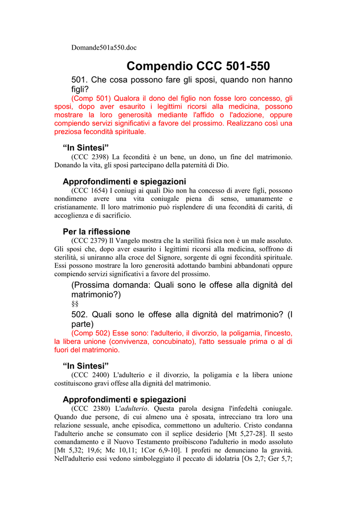 Domande501a550.doc Compendio CCC 501-550 501. Che cosa possono fare gli sposi, quando non hanno figli? (Comp 501) Qualora il dono del figlio non fosse loro concesso, gli sposi, dopo aver esaurito i legittimi ricorsi alla medicina, possono mostrare la loro generosità mediante l'affido o l'adozione, oppure compiendo servizi significativi a favore del prossimo. Realizzano così una preziosa fecondità spirituale. “In Sintesi” (CCC 2398) La fecondità è un bene, un dono, un fine del matrimonio. Donando la vita, gli sposi partecipano della paternità di Dio. Approfondimenti e spiegazioni (CCC 1654) I coniugi ai quali Dio non ha concesso di avere figli, possono nondimeno avere una vita coniugale piena di senso, umanamente e cristianamente. Il loro matrimonio può risplendere di una fecondità di carità, di accoglienza e di sacrificio. Per la riflessione (CCC 2379) Il Vangelo mostra che la sterilità fisica non è un male assoluto. Gli sposi che, dopo aver esaurito i legittimi ricorsi alla medicina, soffrono di sterilità, si uniranno alla croce del Signore, sorgente di ogni fecondità spirituale. Essi possono mostrare la loro generosità adottando bambini abbandonati oppure compiendo servizi significativi a favore del prossimo. (Prossima domanda: Quali sono le offese alla dignità del matrimonio?) §§ 502. Quali sono le offese alla dignità del matrimonio? (I parte) (Comp 502) Esse sono: l'adulterio, il divorzio, la poligamia, l'incesto, la libera unione (convivenza, concubinato), l'atto sessuale prima o al di fuori del matrimonio. “In Sintesi” (CCC 2400) L'adulterio e il divorzio, la poligamia e la libera unione costituiscono gravi offese alla dignità del matrimonio. Approfondimenti e spiegazioni (CCC 2380) L'adulterio. Questa parola designa l'infedeltà coniugale. Quando due persone, di cui almeno una è sposata, intrecciano tra loro una relazione sessuale, anche episodica, commettono un adulterio. Cristo condanna l'adulterio anche se consumato con il seplice desiderio [Mt 5,27-28]. Il sesto comandamento e il Nuovo Testamento proibiscono l'adulterio in modo assoluto [Mt 5,32; 19,6; Mc 10,11; 1Cor 6,9-10]. I profeti ne denunciano la gravità. Nell'adulterio essi vedono simboleggiato il peccato di idolatria [Os 2,7; Ger 5,7; 13,27]. (CCC 2381) L'adulterio è un'ingiustizia. Chi lo commette viene meno agli impegni assunti. Ferisce quel segno dell'Alleanza che è il vincolo matrimoniale, lede il diritto dell'altro coniuge e attenta all'istituto del matrimonio, violando il contratto che lo fonda. Compromette il bene della generazione umana e dei figli, i quali hanno bisogno dell'unione stabile dei genitori. Per la riflessione (CCC 2382) Il Signore Gesù ha insistito sull'intenzione originaria del Creatore, che voleva un matrimonio indissolubile [Mt 5,31-32; 19,3-9; Mc 10,9; Lc 16,18; 1Cor 7,10-11]. Ha abolito le tolleranze che erano state a poco a poco introdotte nella Legge antica [Mt 19,7-9]. Tra i battezzati “il Matrimonio rato e consumato non può essere sciolto da nessuna potestà umana e per nessuna causa, eccetto la morte” [CIC canone 1141]. [CONTINUA] (Continua la domanda: Quali sono le offese alla dignità del matrimonio?) §§ 502. Quali sono le offese alla dignità del matrimonio? (II parte) (continuazione) (Comp 502 ripetizione) Esse sono: l'adulterio, il divorzio, la poligamia, l'incesto, la libera unione (convivenza, concubinato), l'atto sessuale prima o al di fuori del matrimonio. “In Sintesi” (CCC 2400) L'adulterio e il divorzio, la poligamia e la libera unione costituiscono gravi offese alla dignità del matrimonio. (CCC 1661) Il sacramento del Matrimonio è segno dell'unione di Cristo e della Chiesa. Esso dona agli sposi la grazia di amarsi con l'amore con cui Cristo ha amato la sua Chiesa; la grazia del sacramento perfeziona così l'amore umano dei coniugi, consolida la loro unità indissolubile e li santifica nel cammino della vita eterna [Concilio di Trento: DS 1799]. Approfondimenti e spiegazioni (CCC 2383) La separazione degli sposi con la permanenza del vincolo matrimoniale può essere legittima in certi casi contemplati dal diritto canonico [CIC canoni 1151-1155]. Se il divorzio civile rimane l'unico modo possibile di assicurare certi diritti legittimi, quali la cura dei figli o la tutela del patrimonio, può essere tollerato, senza che costituisca una colpa morale. (CCC 2384) Il divorzio è una grave offesa alla legge naturale. Esso pretende di sciogliere il patto liberamente stipulato dagli sposi, di vivere l'uno con l'altro fino alla morte. Il divorzio offende l'Alleanza della salvezza, di cui il Matrimonio sacramentale è segno. Il fatto di contrarre un nuovo vincolo nuziale, anche se riconosciuto dalla legge civile, accresce la gravità della rottura: il coniuge risposato si trova in tal caso in una condizione di adulterio pubblico e permanente: “Se il marito, dopo essersi separato dalla propria moglie, si unisce ad un'altra donna, è lui stesso adultero, perché fa commettere un adulterio a tale donna; e la donna che abita con lui è adultera, perché ha attirato a sé il marito di un'altra” [San Basilio Magno, Moralia, regula 73: PG 31, 852]. Per la riflessione (CCC 2385) Il carattere immorale del divorzio deriva anche dal disordine che esso introduce nella cellula familiare e nella società. Tale disordine genera gravi danni: per il coniuge, che si trova abbandonato; per i figli, traumatizzati dalla separazione dei genitori, e sovente contesi tra questi; per il suo effetto contagioso, che lo rende una vera piaga sociale. (CCC 2386) Può avvenire che uno dei coniugi sia vittima innocente del divorzio pronunciato dalla legge civile; questi allora non contravviene alla norma morale. C'è infatti una differenza notevole tra il coniuge che si è sinceramente sforzato di rimanere fedele al sacramento del Matrimonio e si vede ingiustamente abbandonato, e colui che, per sua grave colpa, distrugge un Matrimonio canonicamente valido [Giovanni Paolo 