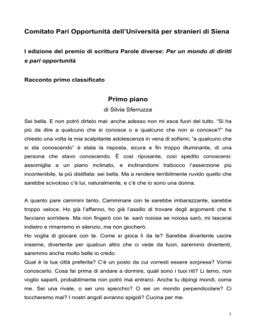 Comitato Pari Opportunità dell’Università per stranieri di Siena I edizione del premio di scrittura Parole diverse: Per un mondo di diritti e pari opportunità Racconto primo classificato Primo piano di Silvia Sferruzza Sei bella. E non potrò dirtelo mai: anche adesso non mi esce fuori del tutto. “Si ha più da dire a qualcuno che si conosce o a qualcuno che non si conosce?” ha chiesto una volta la mia scalpitante adolescenza in vena di sofismi; “a qualcuno che si sta conoscendo” è stata la risposta, sicura e fin troppo illuminante, di una persona che stavo conoscendo. È così riposante, così spedito conoscersi: assomiglia a un piano inclinato, e inclinandomi trabocco l’asserzione più incontenibile, la più distillata: sei bella. Ma a rendere terribilmente ruvido quello che sarebbe scivoloso c’è lui, naturalmente, e c’è che io sono una donna. A quanto pare cammini tanto. Camminare con te sarebbe imbarazzante, sarebbe troppo veloce. Ho già l’affanno, ho già l’assillo di trovare degli argomenti che ti facciano sorridere. Ma non fingerò con te: sarò noiosa se noiosa sarò, mi lascerai indietro e rimarremo in silenzio, ma non giocherò. Ho voglia di giocare con te. Come si gioca lì da te? Sarebbe divertente uscire insieme, divertente per qualcun altro che ci vede da fuori, saremmo divertenti, saremmo anche molto belle io credo. Qual è la tua città preferita? C’è un posto da cui vorresti essere sorpresa? Vorrei conoscerlo. Cosa fai prima di andare a dormire, quali sono i tuoi riti? Li temo, non voglio saperli, probabilmente non potrò mai entrarci. Anche tu dipingi mondi, come me. Sei una rivale, o sei uno specchio? O sei un mondo perpendicolare? Ci toccheremo mai? I nostri angoli avranno spigoli? Cucina per me. 1 Scommetto che quando litighi un sorriso ironico ti attraversa la guancia. Eppure nelle cose ti ci immergi, e ne esci intirizzita. Ho deciso che mi comprerò una coperta, per me, per dormire il pomeriggio sopra il letto rifatto; la sceglierò chiedendomi quale possa piacerti, non per fartela vedere mai, ma per darmi la sensazione che tu mi abbia fatto un regalo. Ho notato come guardi. Gli oggetti, i dettagli. La tua intelligenza a volte lascia le cose su cui si posa lucide, ed è sudore. Hai quella grazia imbranata che mi costringe a sorridere, anche controvoglia; controluce sei bellissima. La tua voce sottovoce mi cullava tenendomi sempre più sveglia, l’altra sera. A getto continuo, abbiamo parlato con delicatezza, delicatamente addentando la nostra reciproca novità. “Madonna...” continuavi a intercalare: ho voluto interpretarlo come un segno di coinvolgimento. La sentivi anche tu, la meraviglia di trovarci, di starci perdendo – nell’ora tarda e nelle parole, o piuttosto nei toni bisbigliati e negli sguardi sbiechi – di starci conoscendo pian piano e con voracità? Non sei bella, forse non sei propriamente bella: le tue mani dalle pieghe decise e i tuoi occhi che sanno imbarazzarsi teneramente e sanno concentrarsi saggiamente, oh i tuoi occhi. Ho registrato in memoria il battito veloce delle ciglia quando ti fermi a pensare a una cosa che ti ho detto, le sopracciglia lievemente aggrottate, sopra. Non sei bella, sei terribilmente magnetica: non riuscivo a trattenermi dallo sfiorarti le dita con quel pezzettino di carta. Non ci sarebbe spazio vitale se solo restassimo bloccate in un ascensore e dovessimo passare il tempo raccontandoci le nostre vite. Ma dove sono arrivata, a quale piano sono salita, fermami. Sei semplicemente bella, bella è la bustina di zucchero quando ci gesticoli, gesticola anche con me per favore. È fiducioso, naturalmente, è fedele ed affettuoso. Mi hai fatto vedere una foto dei tuoi vestiti disordinati per la stanza: sembravi fiera. Sembri una bambina, quando sei fiera, e quel disordine era il tuo trofeo, la tua tenera sommossa di autodeterminazione. 2 Quelle ciocche che tornano davanti agli occhi, indocili, vogliono forse proteggermi? O definitivamente assuefarmi a quel gesto, glorioso, con cui le tue due dita le scostano via? I polpastrelli toccano la fronte, non sarebbe necessario, c’è come un desiderio di contatto. Te ne accorgi, di come ridi quando ridi e di come sei seria quando sei seria? Hai un’ottima memoria, ho notato: attenta e istintiva, agganci a te qualunque cosa reputi ferrea abbastanza, o abbastanza divertente. Sempre come ubriaca, sempre crudamente lucida: resto incantata dalle tue fossette e dal tuo dolore. Il tuo volgere da un distacco granitico a quell’inerme disponibilità che mi lusinga è repentino, è una collana che ti decora di corallo il collo. Tieni a mente anche le tue, di espressioni? Sono una donna, e ti immagino con tenerezza ricoprirti di dolcissime rughe. Ce la faccio, certo che ce la faccio a non chiamarti. Riassaporo coincidenze, giocherello con motivi, ma non ti chiamo. Ho i miei libri io, ho i miei ritmi. Mi fermo e decido di pensarti, ma è una scelta, mia e non tua, mica mi vieni in mente ad ogni passo. Certo che ce la faccio a non pensarti. Cerco su internet notizie sulla tua città. Non ti stai trattenendo anche tu, lo so. Non chiami. Stitica, statica, scrivi di viaggi e risparmi soldi ed emotività per quando partirai. O scrivere o vivere, è così, no? Io che addento pagine e vita, forse goffamente, forse non potrò mai né vivere né scrivere appieno? Maceri, le maceri dentro le cose, stai macerando anche me forse, lasci decantare e poi arrivi a scrivere, a vivere semmai dopo se ne parla, semmai dopo. Io che ho sete di sudore, io che voglio ubriacarmi di stanchezza, io che ti ho trovata senza cercarti, io sto rinunciando a un inchiostro distillato? Sto sprecando per gola le prelibatezze dell’esistenza, non paziente di aspettarne l’estratto? Mi sto perdendo la raffinatezza impagabile della cottura a fuoco lento? Su internet non dicono niente di come si mastica nella tua città, di come si ama. Mi piacciono i primi piani. Abitare al primo piano, intendo,